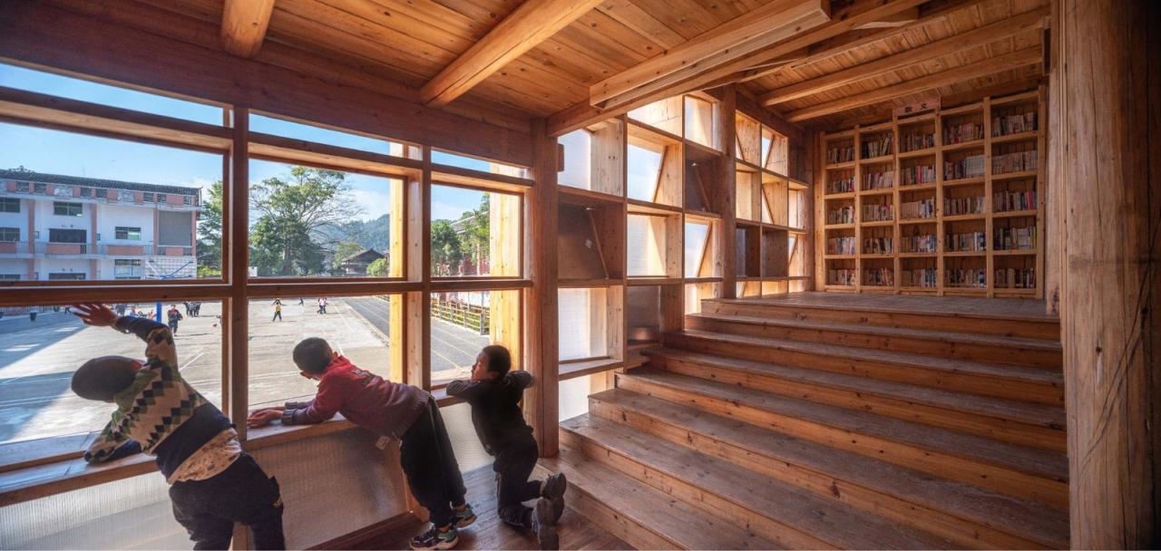 试想象,在一个传统的木构房屋中嵌入了一个无止境的楼梯,一个由踏板组成的、无限延伸的环。为了增加神秘感,这个楼梯并没有目的地,它就是目的地本身。建筑的外墙由书架和可以俯瞰庭院的窗户组成的矩阵组成。坪坦书屋不应被定义为一个传统的儿童图书馆,而是一个可以让孩子们一边读书一边玩耍的地方。这也是中国乡村图书馆的新范式。