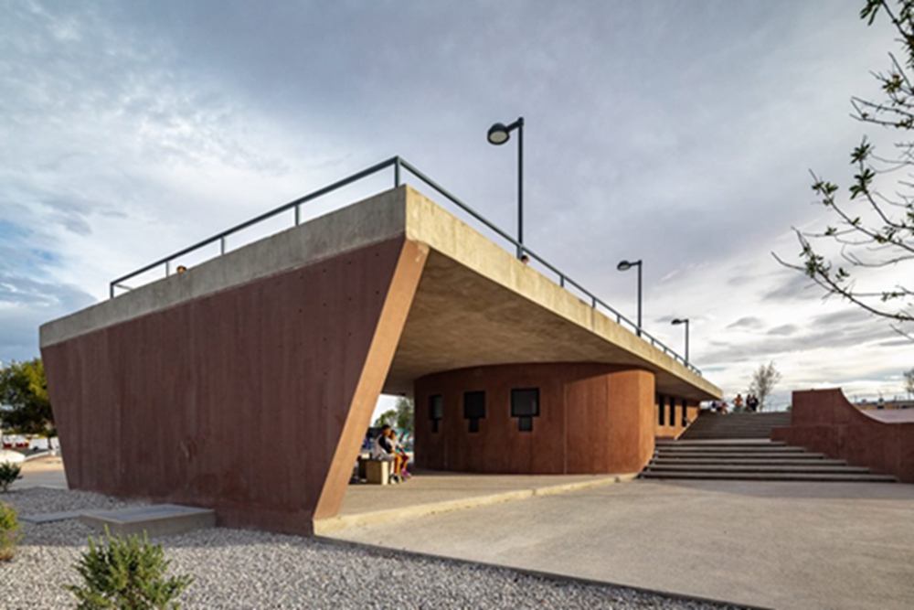 这种对沙漠的涉及影响了公园障碍物的形式,意在唤起奇瓦瓦的萨马莱尤卡沙丘(Samalayuca Dune Fields)景观,以及混凝土的沙粉色着色。在南面,一个大的混凝土观景台位于棕色混凝土教室、办公楼和一个圆柱形浴室楼的顶部,下方形成一个开放空间,形成一个“门廊”,从公共广场通往滑板公园。设计师们解释说:“这座建筑被设计成一个洞穴,有盖的广场和溜冰场通过一个门廊进行沟通,门廊保护着服务区、一间办公室和三间教室。”