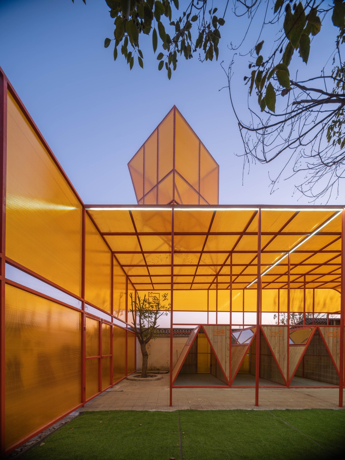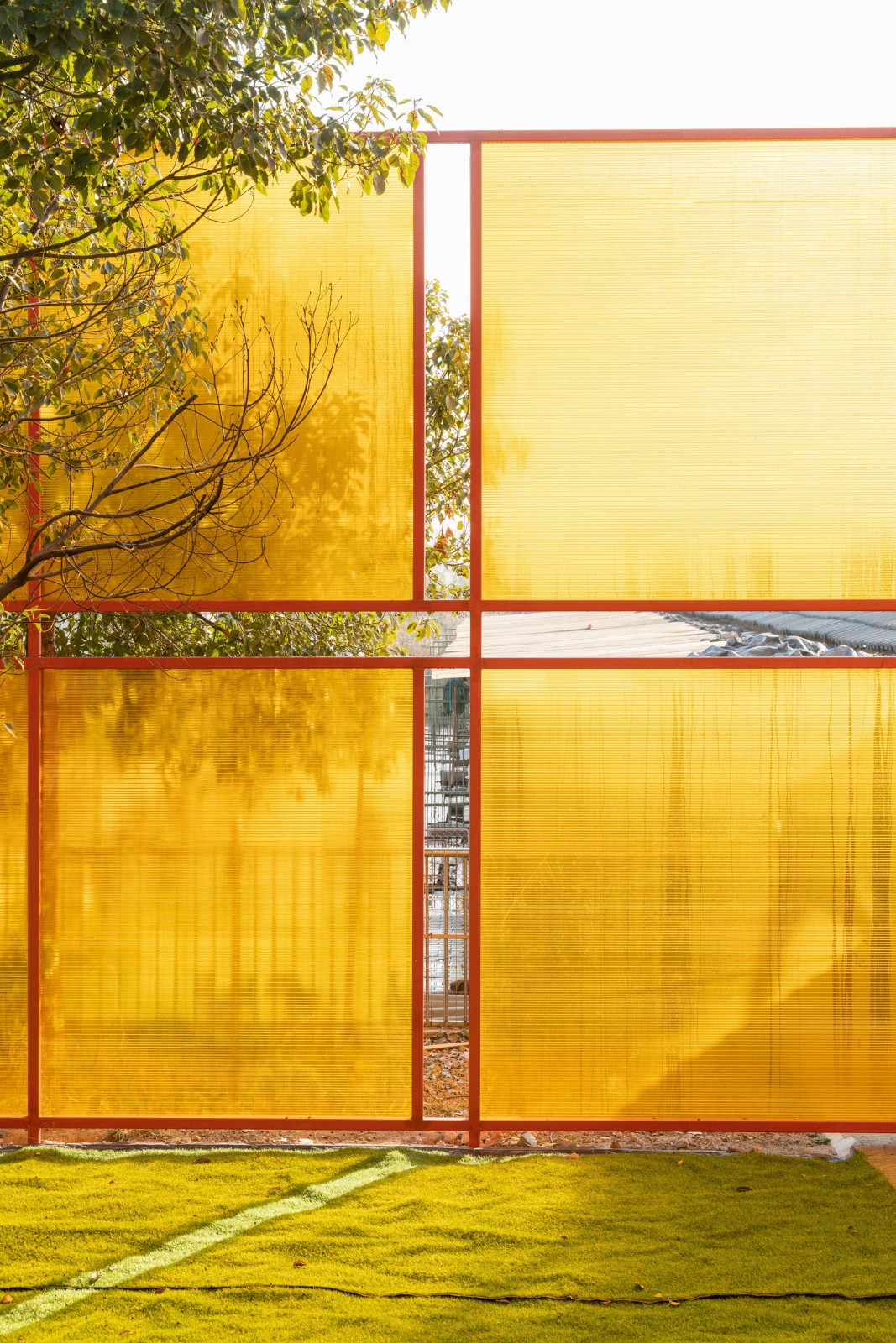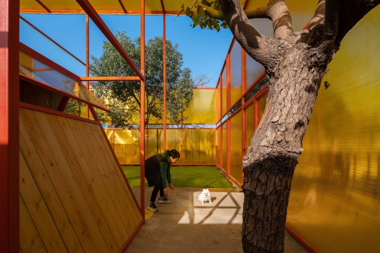 在项目第一轮设计的时候,我们选择用镀锌钢管本身不刷漆——因为镀锌本身是防腐的——选择乳白色阳光板来做围护层。在随后的汇报中,多方觉得这个项目,既然是公益的,那就需要更多人来知道它,让它的辨识度更高一点,所以在随后的修改中,我把颜色改为了橙色,并在顶上增加了一个“狗头”的构筑物,它倒不是说要让这个小建筑具有“像一只狗”的样子,而是为了让第一次来的潜在领养人和志愿者,能在跨越高速路最后一个桥那里,第一眼看到这个基地的位置,让前面十几公里的“灰路”历程终于有一抹亮色。这个橙色也成为门口窗台的颜色。也成为了透明阳光板的颜色,这个颜色给室内外镀上了一层“金色”的光芒。