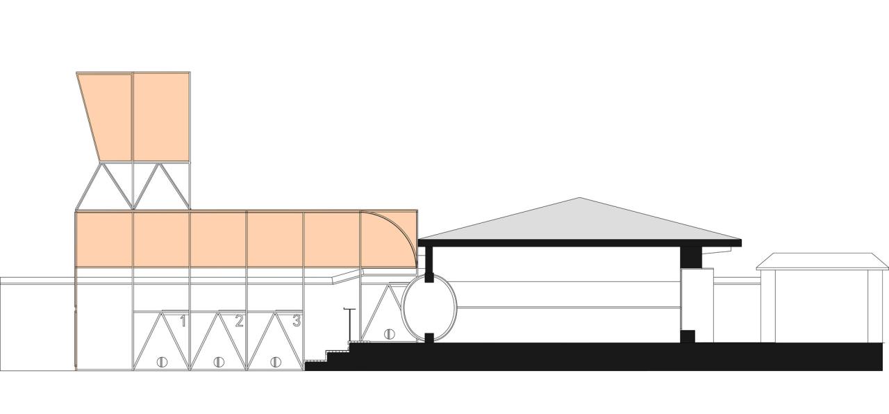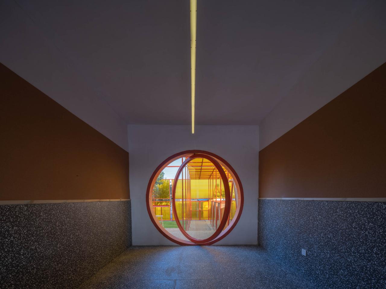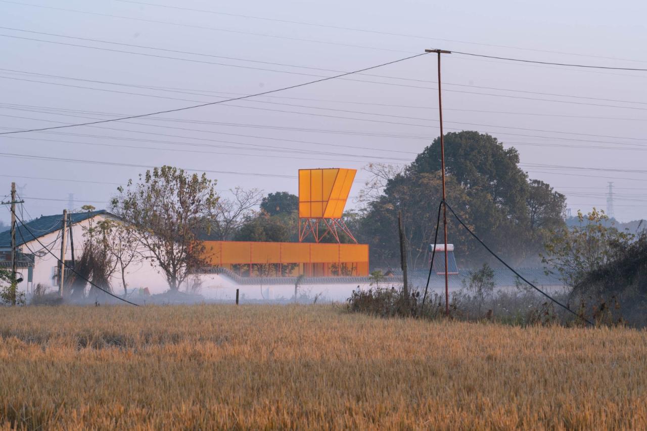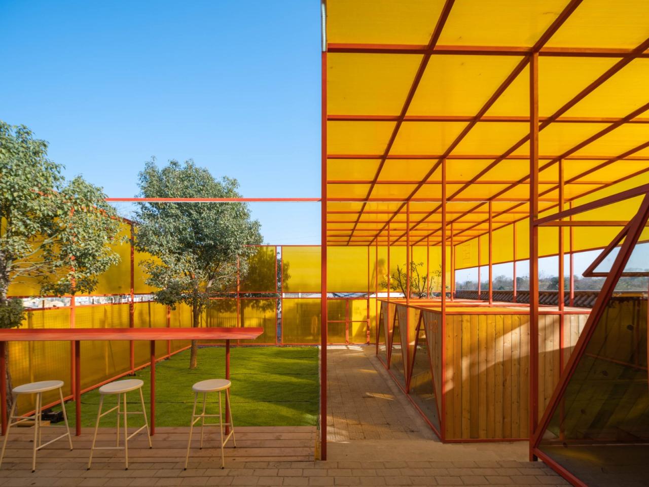 在项目第一轮设计的时候,我们选择用镀锌钢管本身不刷漆——因为镀锌本身是防腐的——选择乳白色阳光板来做围护层。在随后的汇报中,多方觉得这个项目,既然是公益的,那就需要更多人来知道它,让它的辨识度更高一点,所以在随后的修改中,我把颜色改为了橙色,并在顶上增加了一个“狗头”的构筑物,它倒不是说要让这个小建筑具有“像一只狗”的样子,而是为了让第一次来的潜在领养人和志愿者,能在跨越高速路最后一个桥那里,第一眼看到这个基地的位置,让前面十几公里的“灰路”历程终于有一抹亮色。这个橙色也成为门口窗台的颜色。也成为了透明阳光板的颜色,这个颜色给室内外镀上了一层“金色”的光芒。