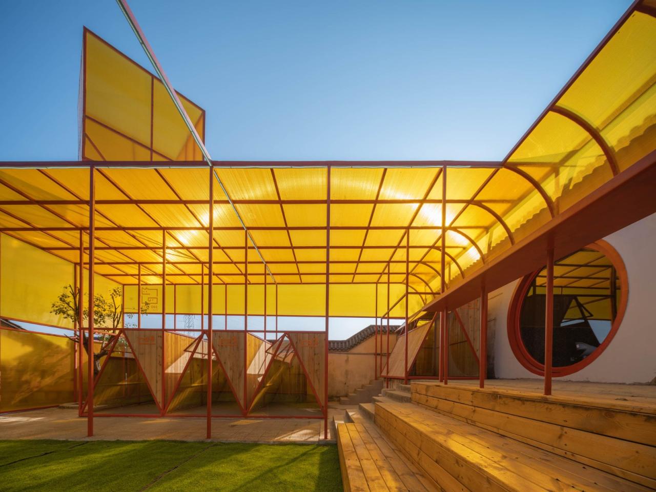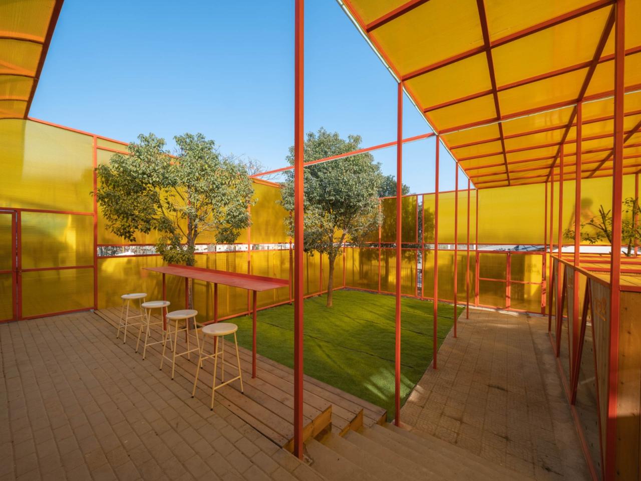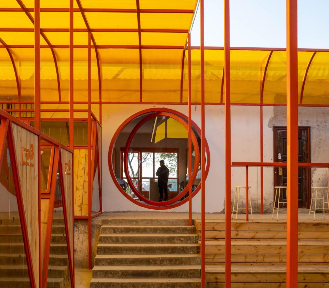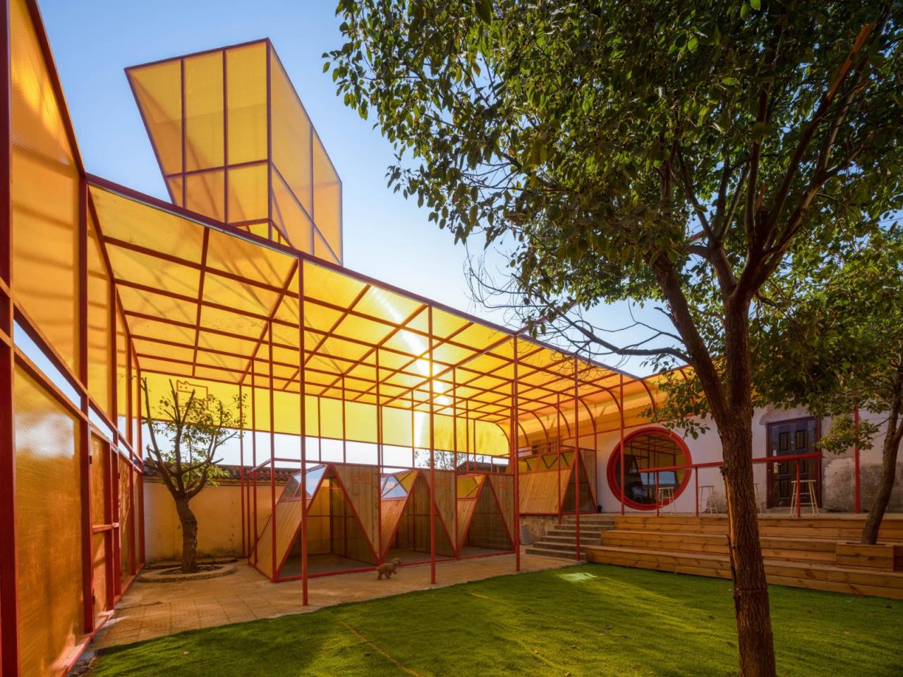 这个大笼子基本把用于室外改造设计的区域给填满了,像是“嵌入”到这个基地前后两栋建筑之间的一种外来物。但在航拍中,它嵌入的形态,却那么完美贴合,仿佛自然生长出来的一样。处于两个不同高差的室外区域,包含4棵小树。建筑师总喜欢把保留树木作为第一选项,其实这次也受限于造价不高不能移树,更是杜帆老师的要求,据说这几棵虽然不大的小树,也是基地刚搬来时,杜老师和志愿者们亲自种下的。所以有时候保留的不是树,而是情感吧。