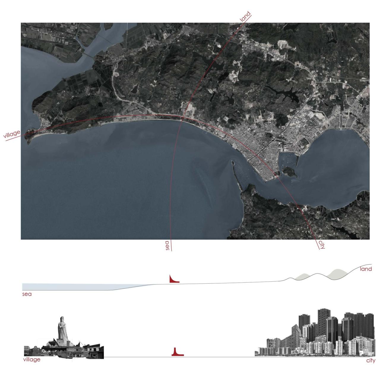 在新一轮交通基础设施的带动下,由中心城市外溢的资本流向了这个隐含丰富旅游景观资源的原始地带,在成长城市和原始乡镇之间的空白地带开始了新城的营建。新城给当地带来了全新的高密度城市的异质元素,并迅速占领了原始村落和城市之间的空白,在地产生产的驱动下引发了沿海岸线新都市化进程。