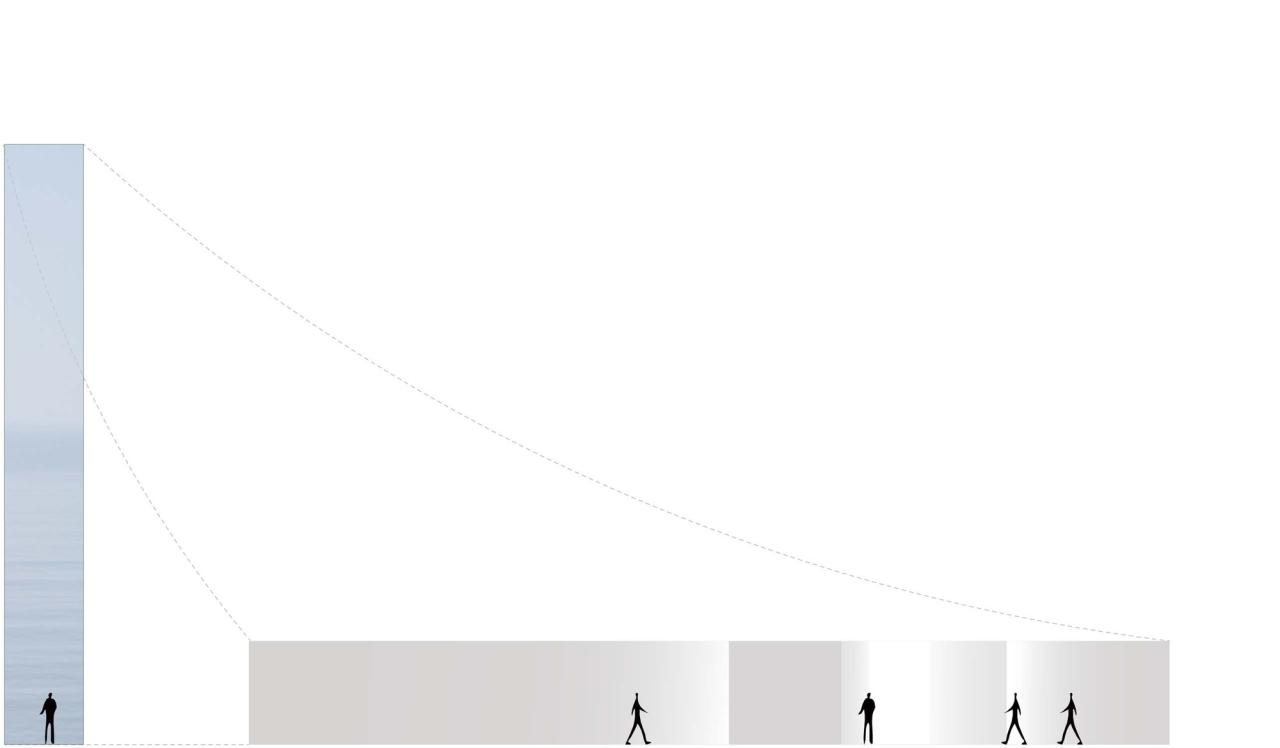 仪式空间面向大陆和新城的一端是一个高宽比接近1:10的水平空间,内置抽象化的山屏、庭院和厅堂,以水平展开的方式展现在新城的中轴之上,让身处巨大的直立城市体量之间的人们得以在此寻到一方心灵的安定之所。浅水池延边36米长的檐廊则是这个处所的绝佳景框和出演的舞台。空间面向广阔大海的一端却被戏剧性的压缩和拉伸,成为矗立于海洋潮汐边缘的一尊高塔!其尽端是一扇高宽比接近5:1的透明直立高窗,人们在此难以群聚,余下的仅是一种面向无边海洋的孤独。高窗之外超尺度的高耸檐廊向天空延伸,天与海最终成为仪式的终点,同时也是精神和想象朝向大海的再出发之处。