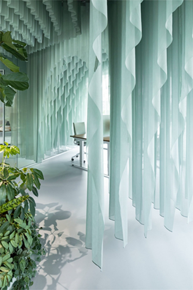 浅蓝绿色的多层织物垂直悬挂在房间的高天花板上。六个空间由多层织物构成,包括围绕空间边缘组织的一系列工作空间和会议室,以最大限度地利用自然采光。