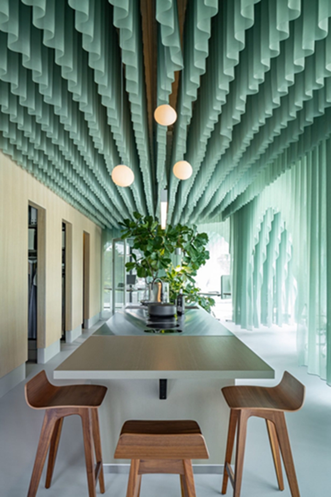 由于每个窗帘间隔均匀,因此从正面观看时,该布置为区域提供了隐私,从侧面观看时,可瞥见水面和相邻空间。建筑师们说:“从正面看,它让光线通过,增加了不同层次的透明度。”。从侧面看,可以看到窗帘之间的水,窗帘之间有空间他们说:“窗帘的颜色足够明亮,避免引起所有注意,但为空间增添了一种微妙的色调,使人联想到水或冰。”