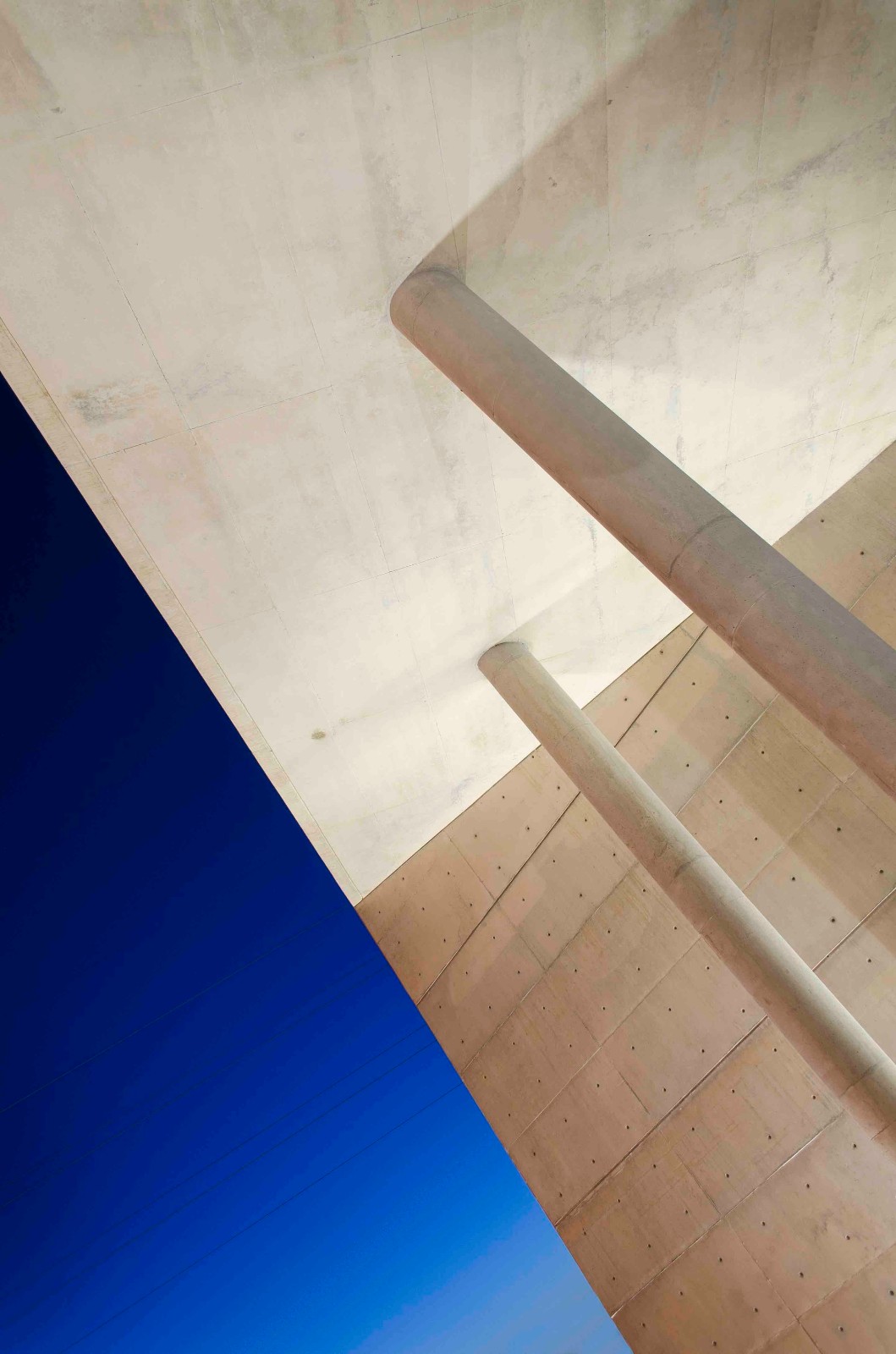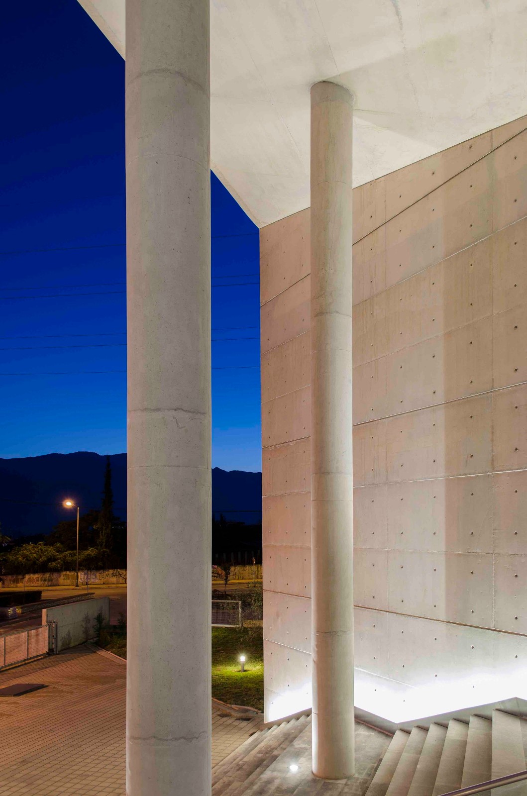 暴露的大块混凝土墙之间,通过可穿透的掏空,形成了有趣的空间韵律。变化的构成营造出生动的穿孔空间,充分体现出了建筑的公共属性。为顺应场地高差,北侧的裙楼被打造为两层,而南侧的被做成了三层。由于西立面是大楼唯一与周围城市有视线联通的一面,因而这里成为了建筑的主入口一侧。