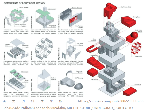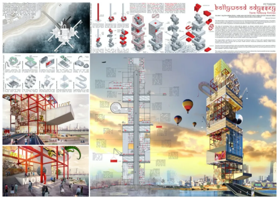 组织转变为一个正式的架构,包含电影学院、媒体中心、企业生产办公室、IMAX圆顶剧院和预览影院等。在地面设置渡轮码头,摩天轮、玻璃人行天桥有助于宝莱坞从独有的一种艺术形式根植于“合一的印度文化”。因此,该塔提供了一个多元化的文化体验和空间,在这里电影将交错在日常生活中,通过混合现实和幻想的元素创造出一个不断增长的影视建筑奇观。