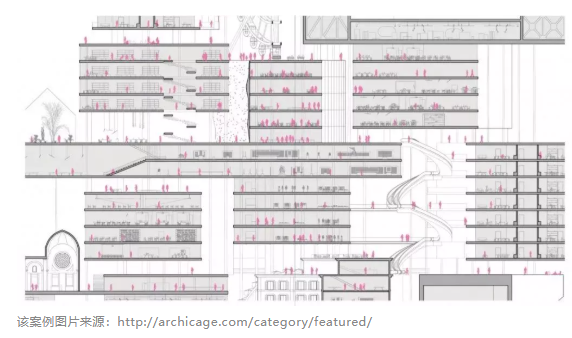 为了进一步推广这一概念,垂直运动的方式有所不同。为了避免规划中的错误——城市街区除了作为通行空间外没有其他用途,项目和活动被表现出来并紧密并列,成为错综复杂的公共空间网络,每一层之间的空间旅程都成为一个奇观。结构紧密地遵循了低到中高层建筑融合的主要概念,包括一个奇妙的混合用途高层。目标是模仿繁忙的城市体验,同时保持项目层次和游客导航的直观和清晰。