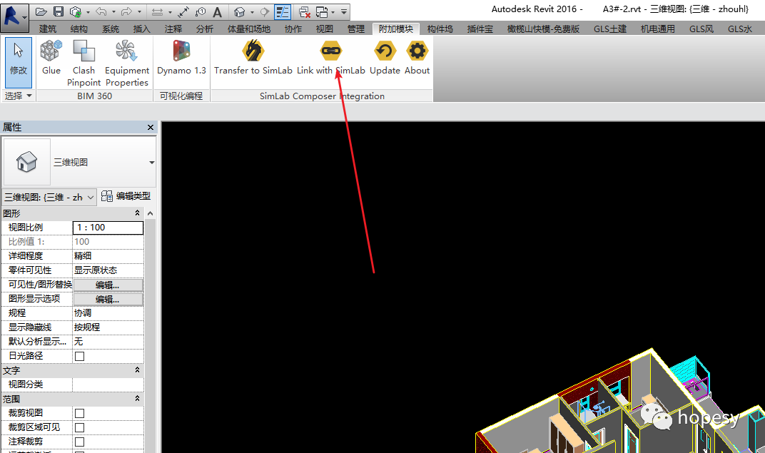 Revit打开项目,点击插件,将模型同步到(三维视图操作;会自动启动插件)Simlab Composer。