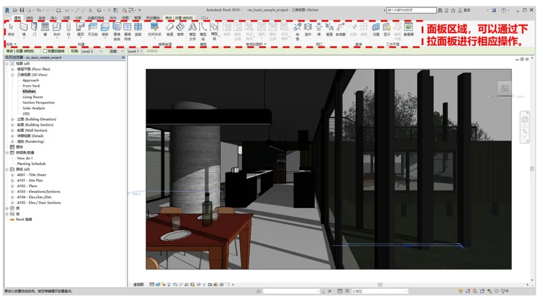 本期将结合BIM技术基础-Revit2019建筑课程和Revit2018用户界面简要介绍Revit的用户界面。首先对用户界面有一个基本认识,Revit2018主界面大致包括菜单、面板、绘图区域、选项板、控制栏等区域。