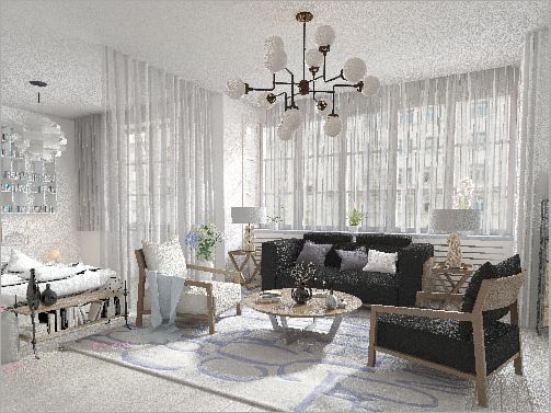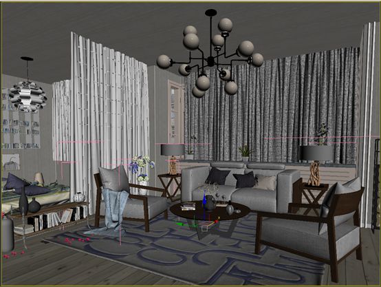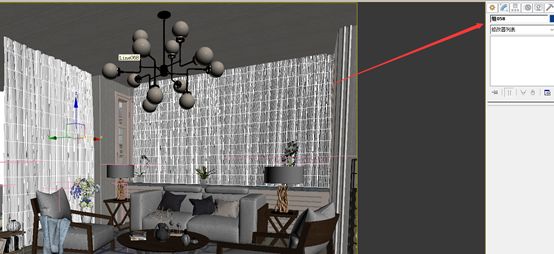 这样在渲染的时候全场景的材质都被这个简单的材质球取代了,但是这个场景因为有很多窗帘,如果把窗帘也覆盖掉了,光线将无法穿透进来,所以我们要讲窗帘部分排除掉,我们全选所有的窗帘,成组