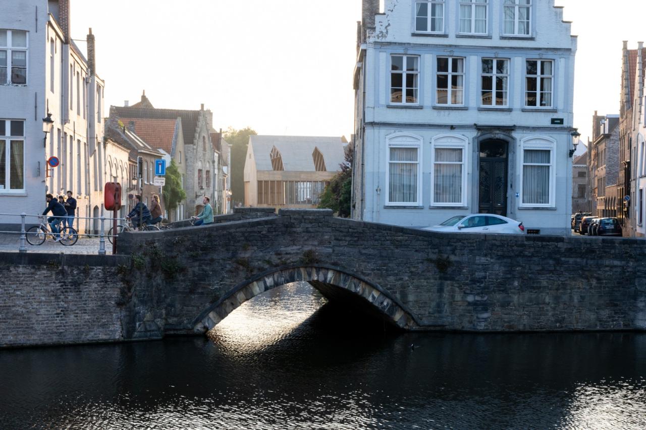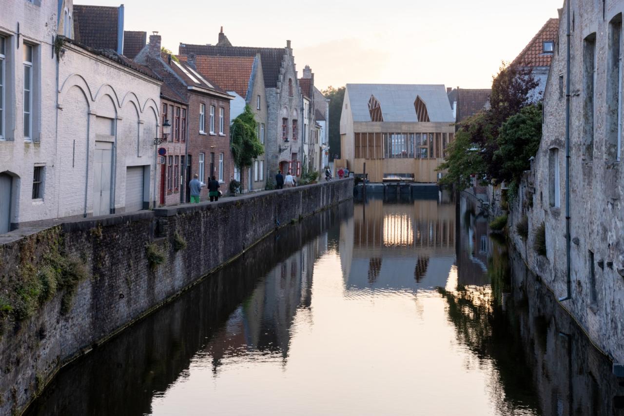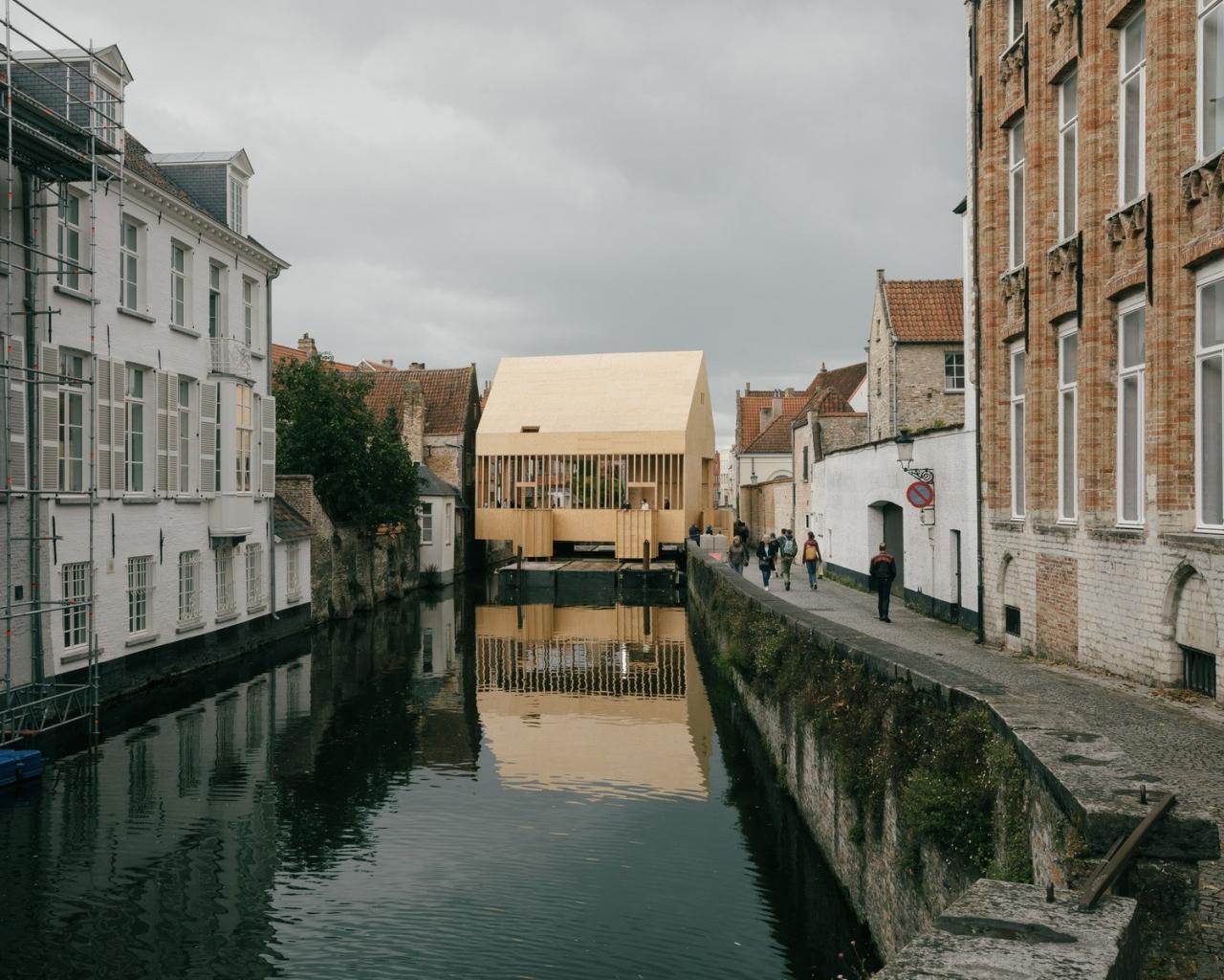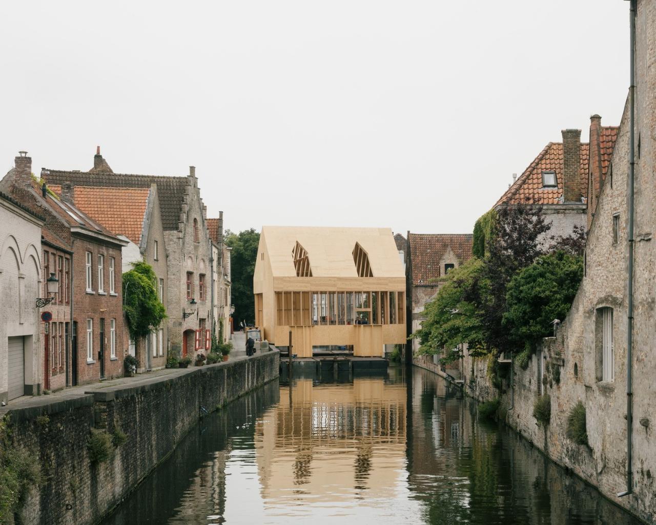 展亭停靠在布鲁日地区的边缘,毗邻住宅区水道,与周边既有构筑物大致是相同尺寸。展亭为木框架结构,位于15个并置的浮筒上,以避免与受保护的联合国教科文组织的遗产城市直接接触。从夏天直至秋天,游客都可以在地块的中部休憩。该地块因毗邻一座15世纪的运河屋而被一分为二。