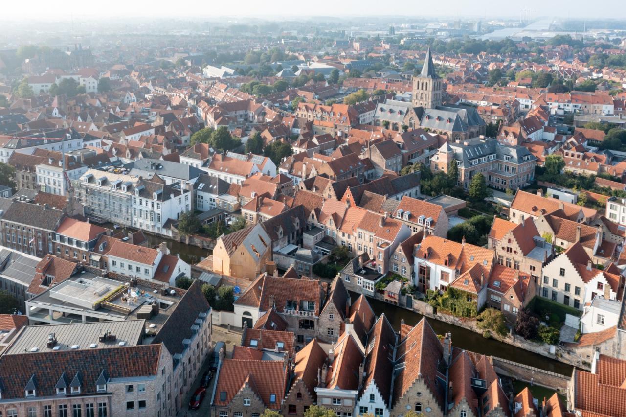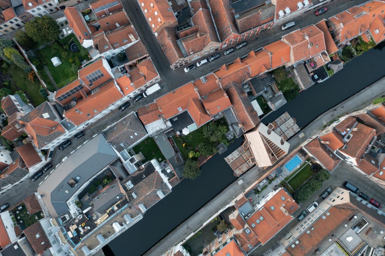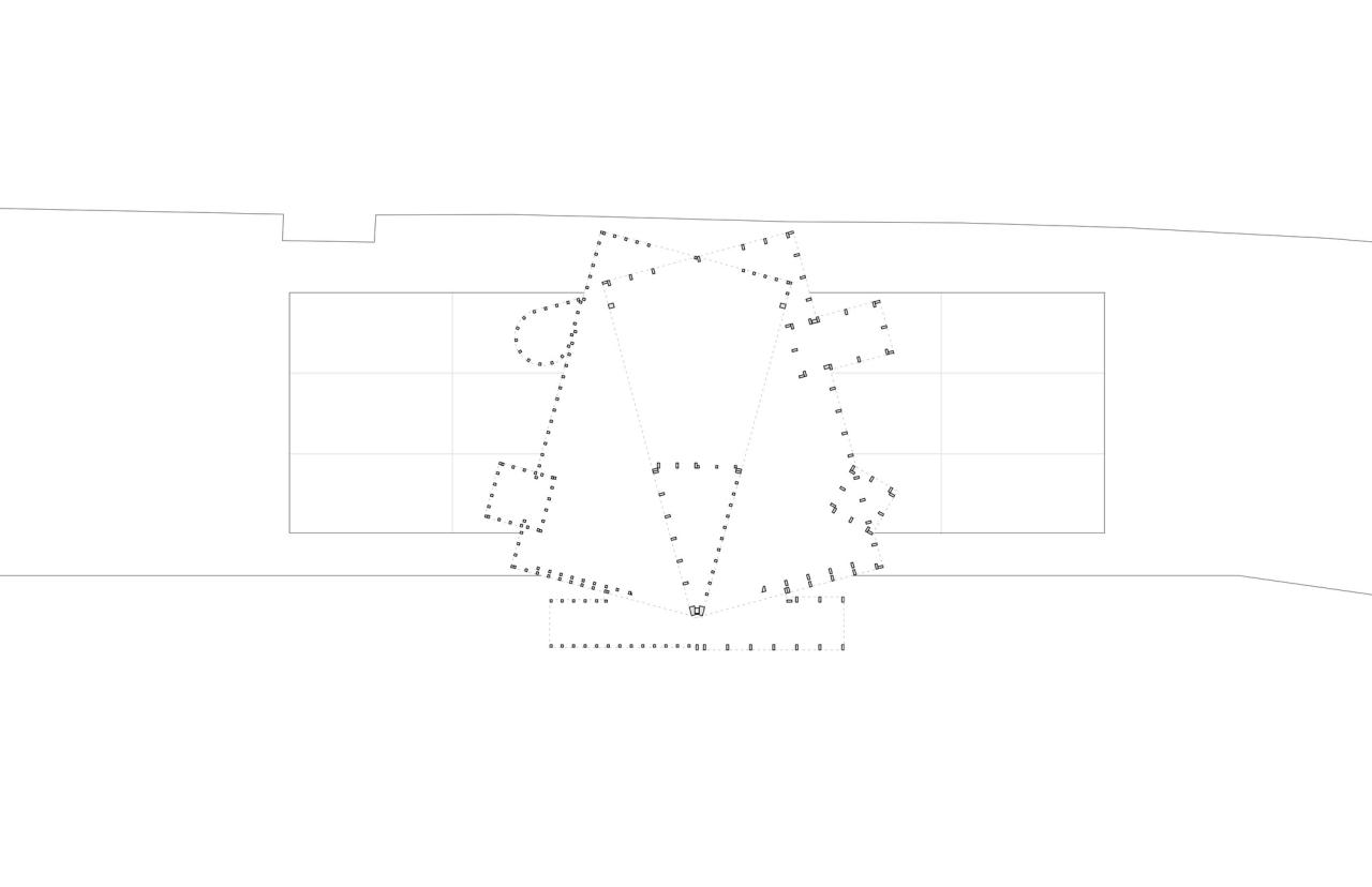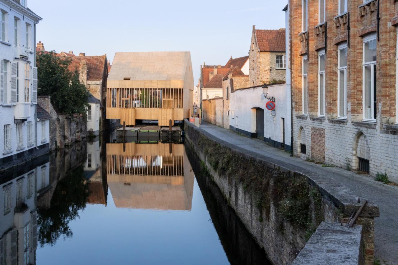 展亭停靠在布鲁日地区的边缘,毗邻住宅区水道,与周边既有构筑物大致是相同尺寸。展亭为木框架结构,位于15个并置的浮筒上,以避免与受保护的联合国教科文组织的遗产城市直接接触。从夏天直至秋天,游客都可以在地块的中部休憩。该地块因毗邻一座15世纪的运河屋而被一分为二。