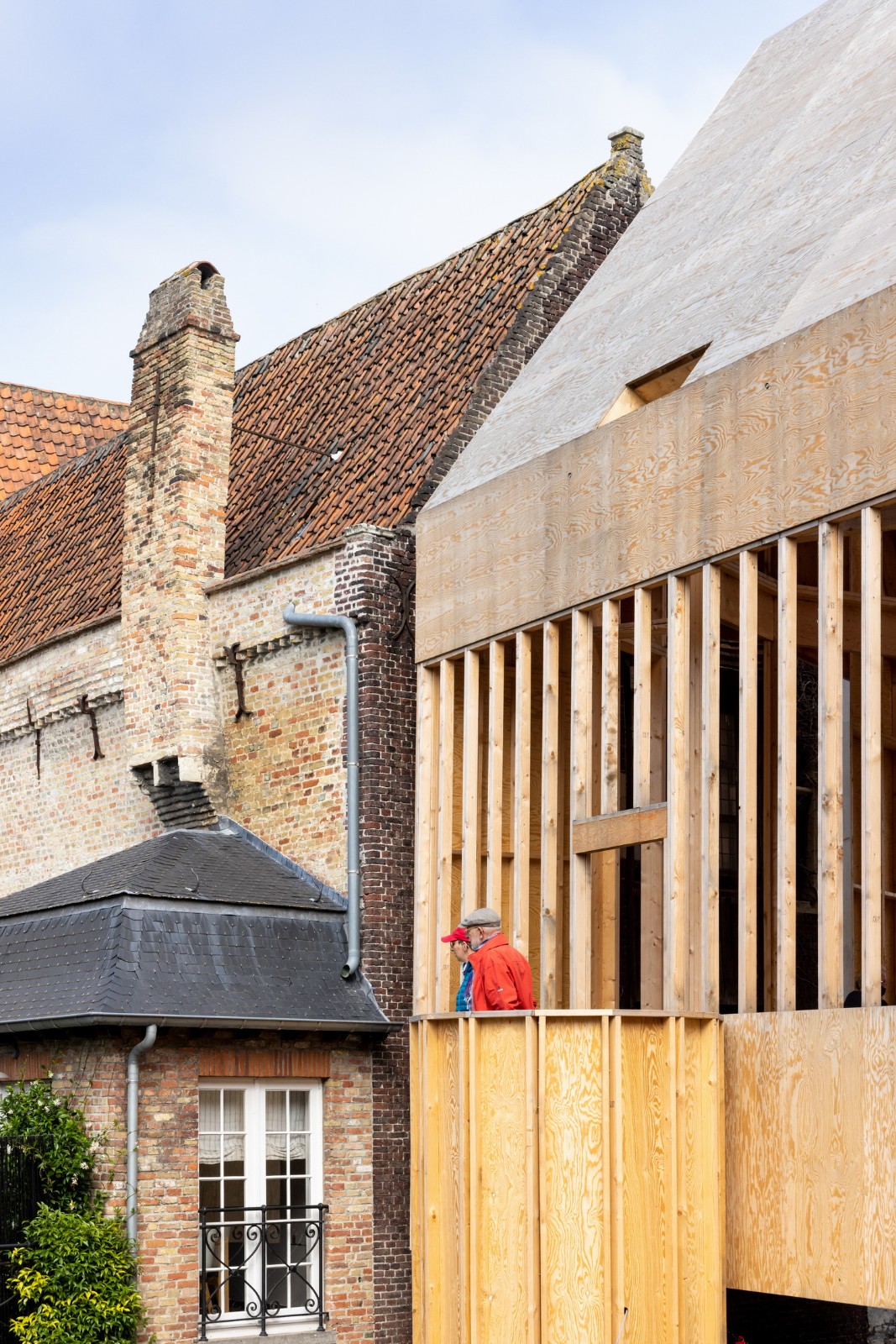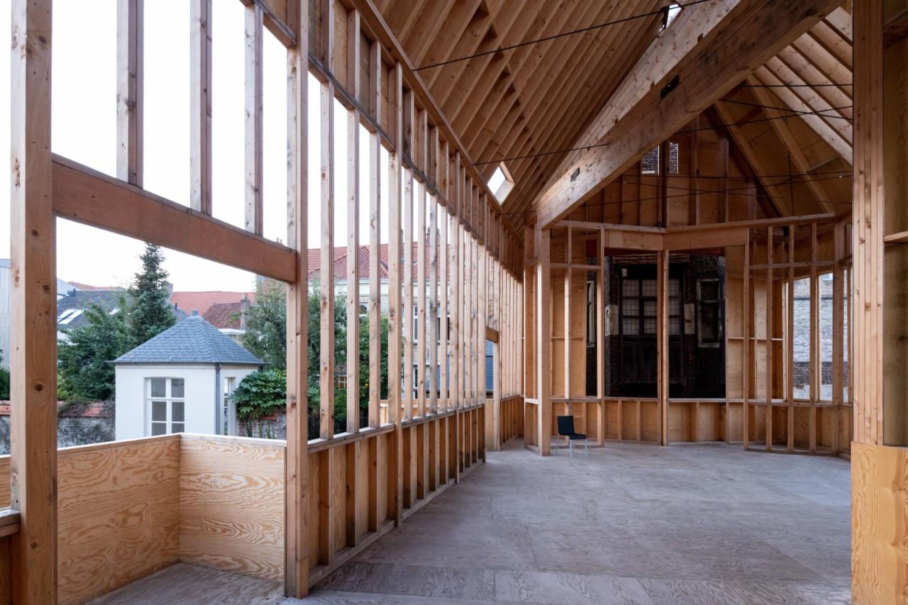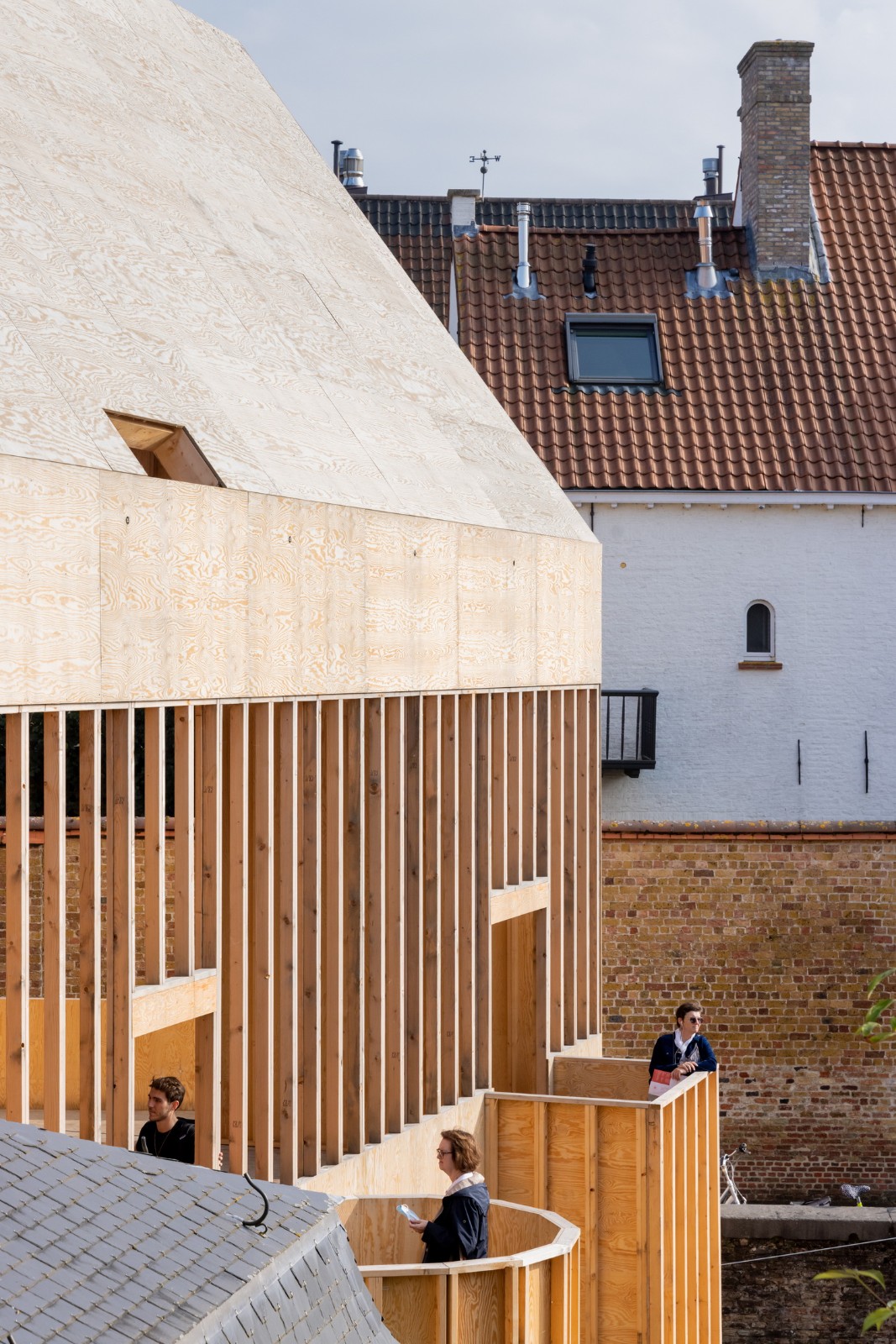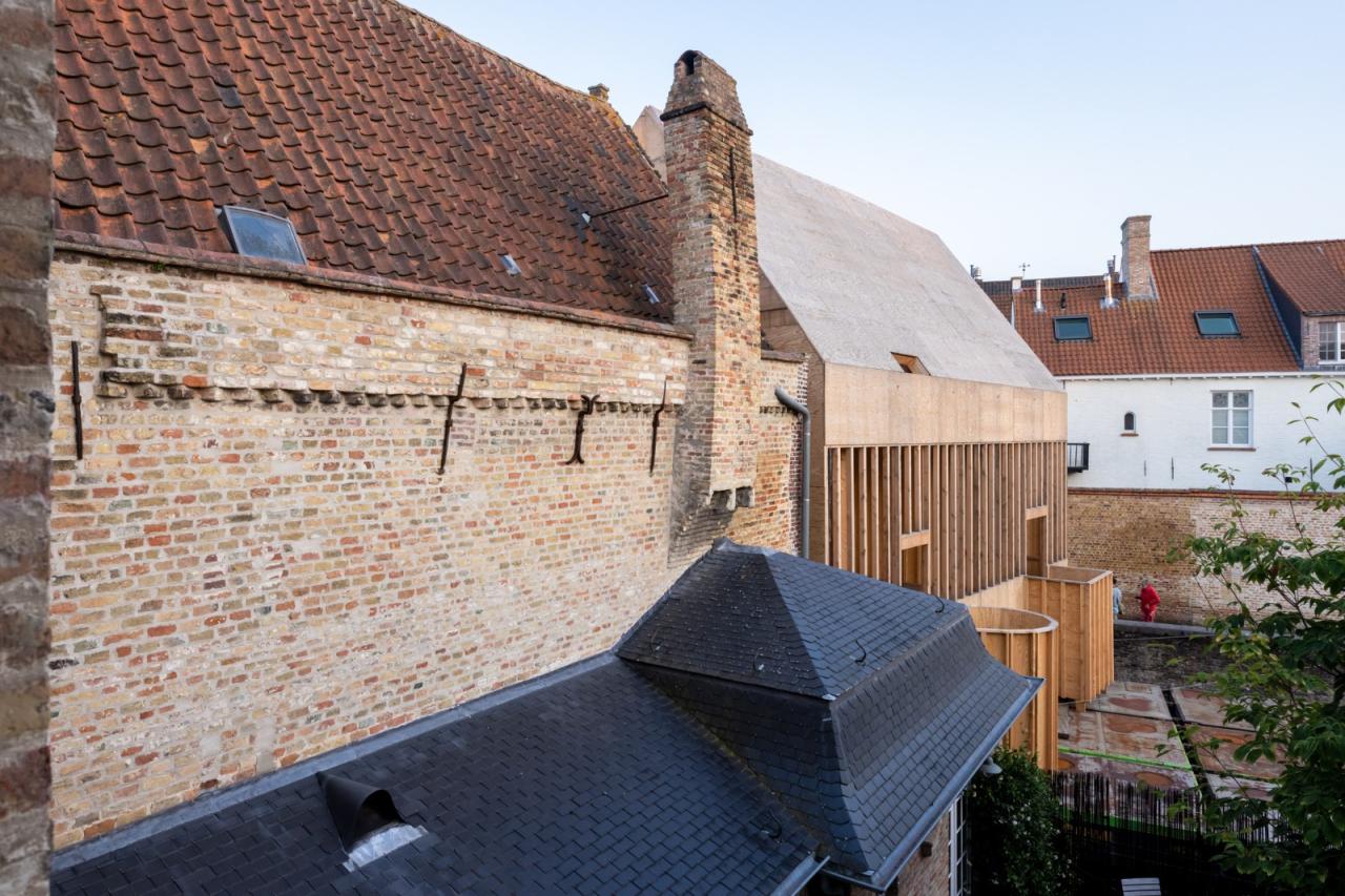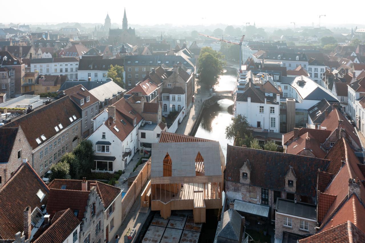 Jon Lott / Para Project 完成的布鲁日双联画展亭是2021布鲁日三年展 TraumA 的一个临时展亭,位于比利时的布鲁日地区。展亭主要用作三年展的活动空间。三年展的项目意在解决城市的创伤问题。该展亭是今年深秋在城市内开放的几个国际委托项目的其中一个。