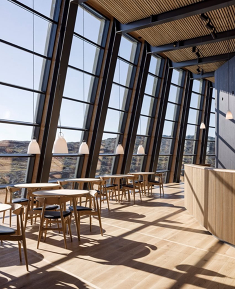 曼德鲁普把这种形式比作“一只雪鸮在风景中飞翔”。这条弯道的另一个好处是提供了通往倾斜屋顶的行人通道。这一高高的视角自然形成了当地徒步旅行路线的新终点,为我们提供了一个从康加冰峡湾(Kangia Icefjord.)的冰山俯瞰的视野。室内空间四面都是玻璃,加上屋顶下还有一些露天露台。目的是让游客体验整个格陵兰岛引人注目的照明条件。曼德鲁普在谈到该项目时说:“在格陵兰岛,夏季只有白天。在冬季,那里非常黑暗,但积雪和地面会反射光线。”。