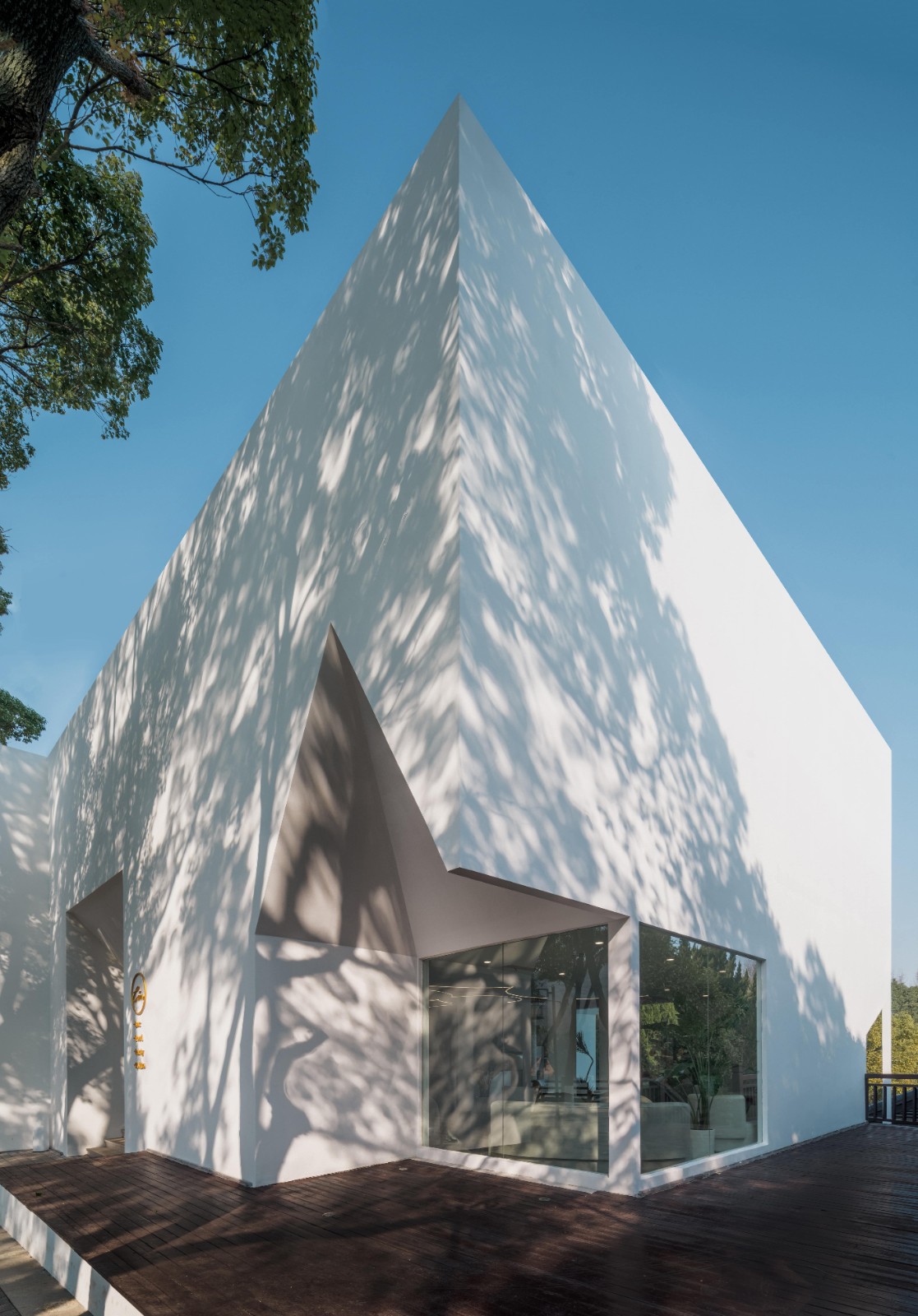 为了与原有建筑的坡屋顶形式有所呼应,并延续品牌一贯的坡顶白墙的设计元素。设计师用纯净的白色方盒子外壳将原有的建筑包裹在内部,立面以坡屋顶形式的窗洞向内延伸,将原有建筑与外部方盒子相连接。