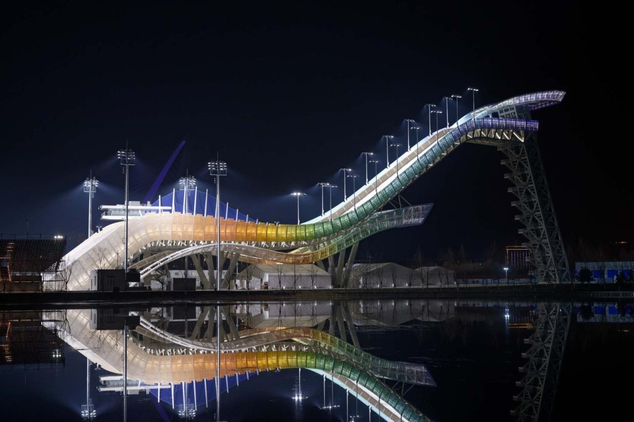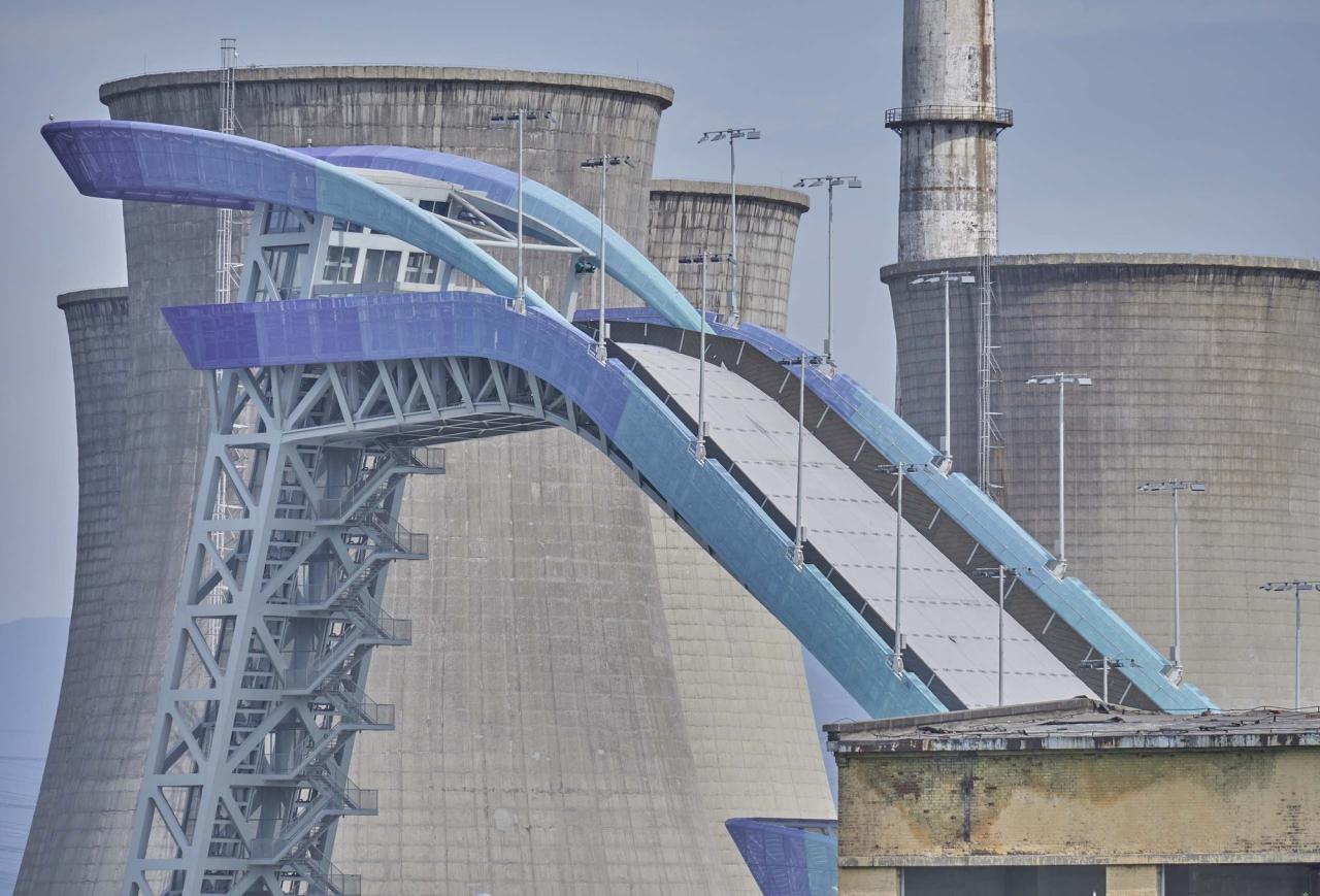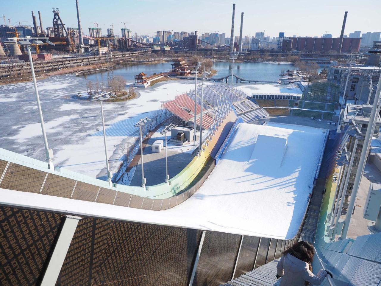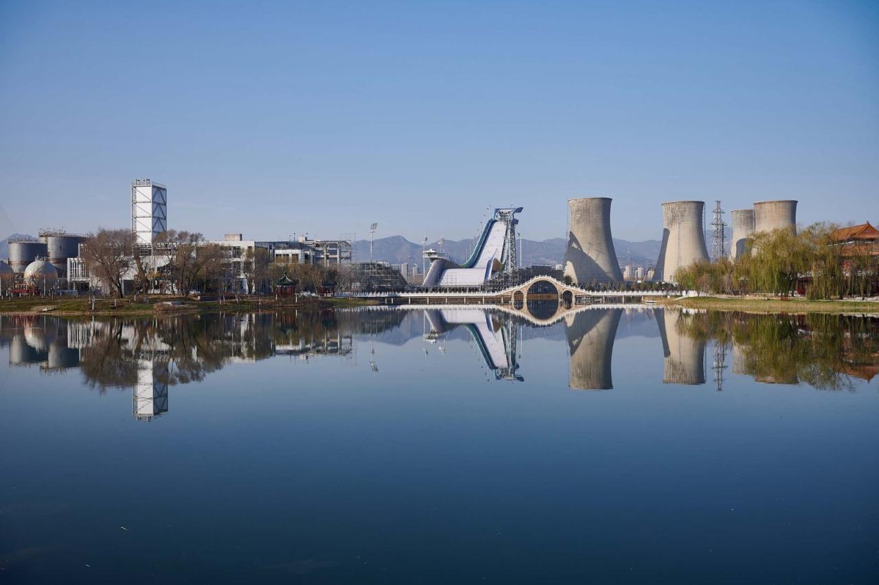首钢滑雪大跳台是全球首个坐落在工业遗址内的冬奥会场馆,也是首个滑雪大跳台的永久性竞赛设施。首钢滑雪大跳台的规划设计将冬奥会场馆与原大型钢铁厂的一个关键部分改造结合起来,包括制氧厂、冷却泵和空分塔,沿工业晾水池—群明湖岸线布局。单板滑雪赛道位于由4座标志性冷却塔形成的风影区内,其结束区和近6000座观众席的一部分沉入湖面标高以下,制氧厂北区则改造为北京2022年冬奥会观众服务中心。