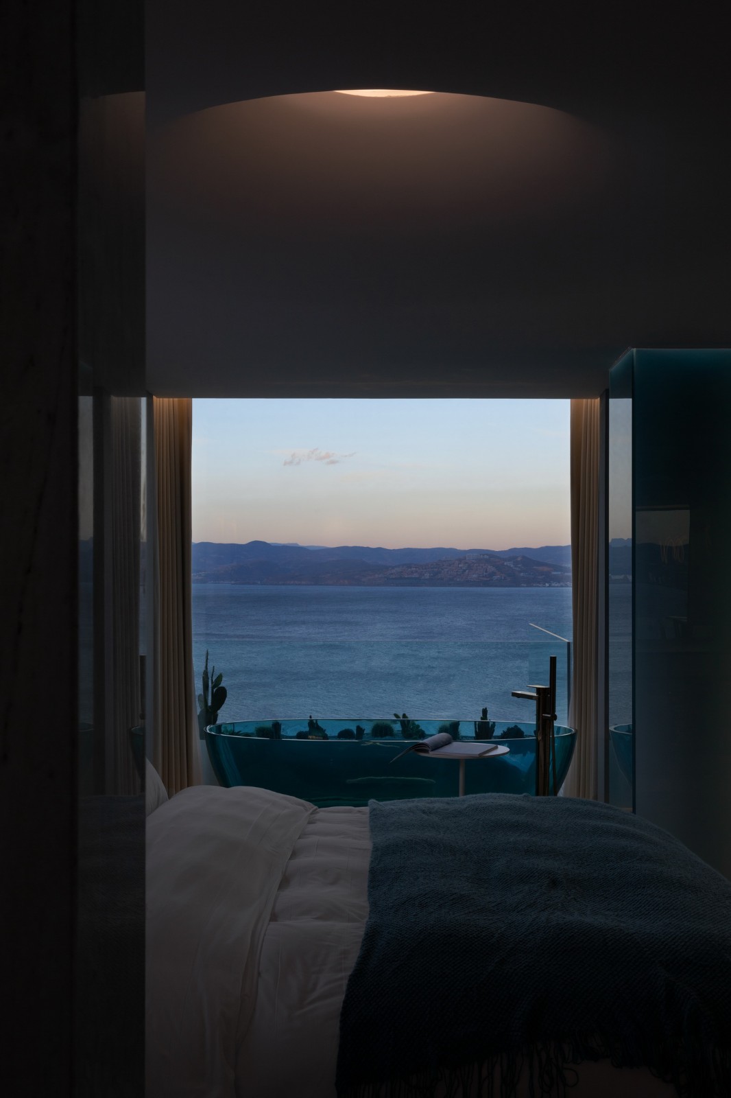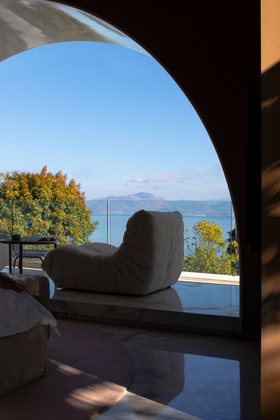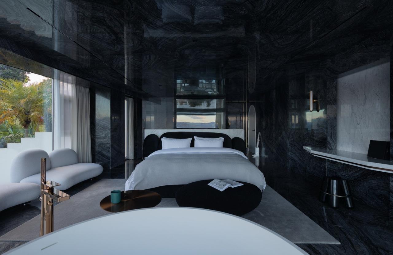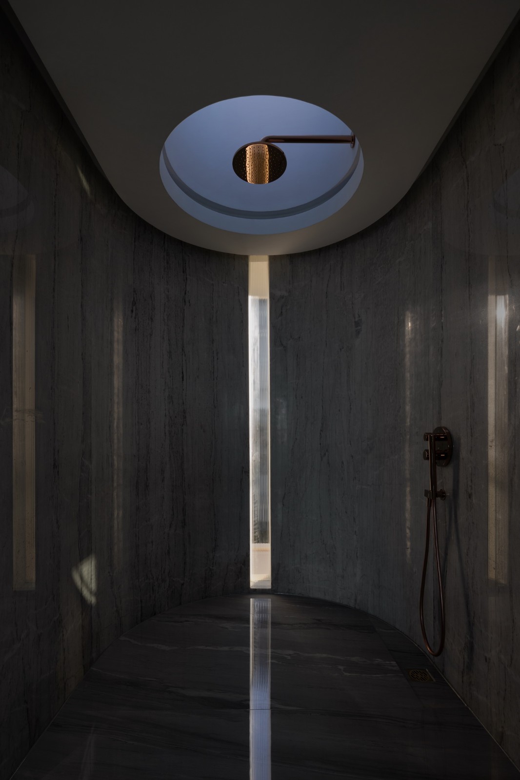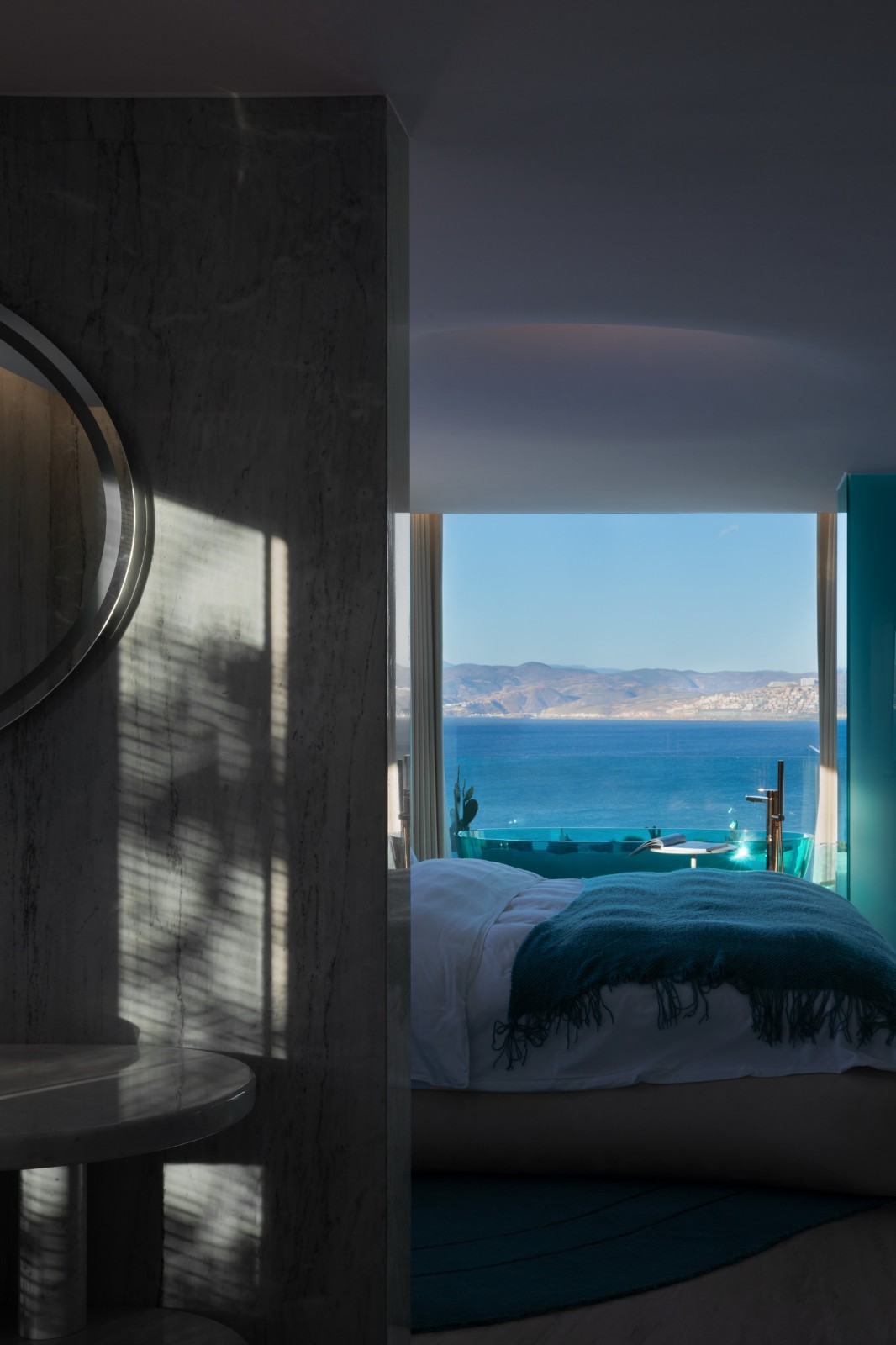 古木纹大理石有着如水墨般沉稳的自然肌理,同时光洁的石材表面映射着周边的景色光影,营造出深邃的空间体验。方形开口最大化的接纳这里愈加开阔的海景,沉淀着旅程上的所见所感。