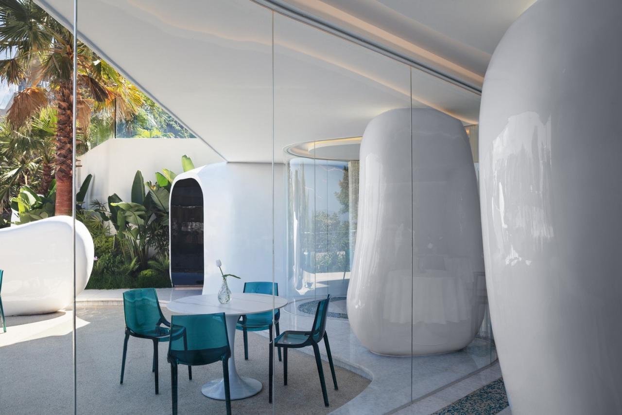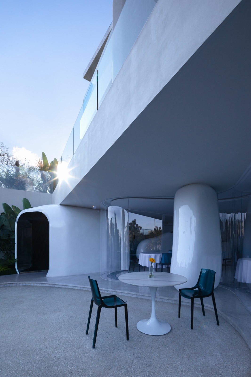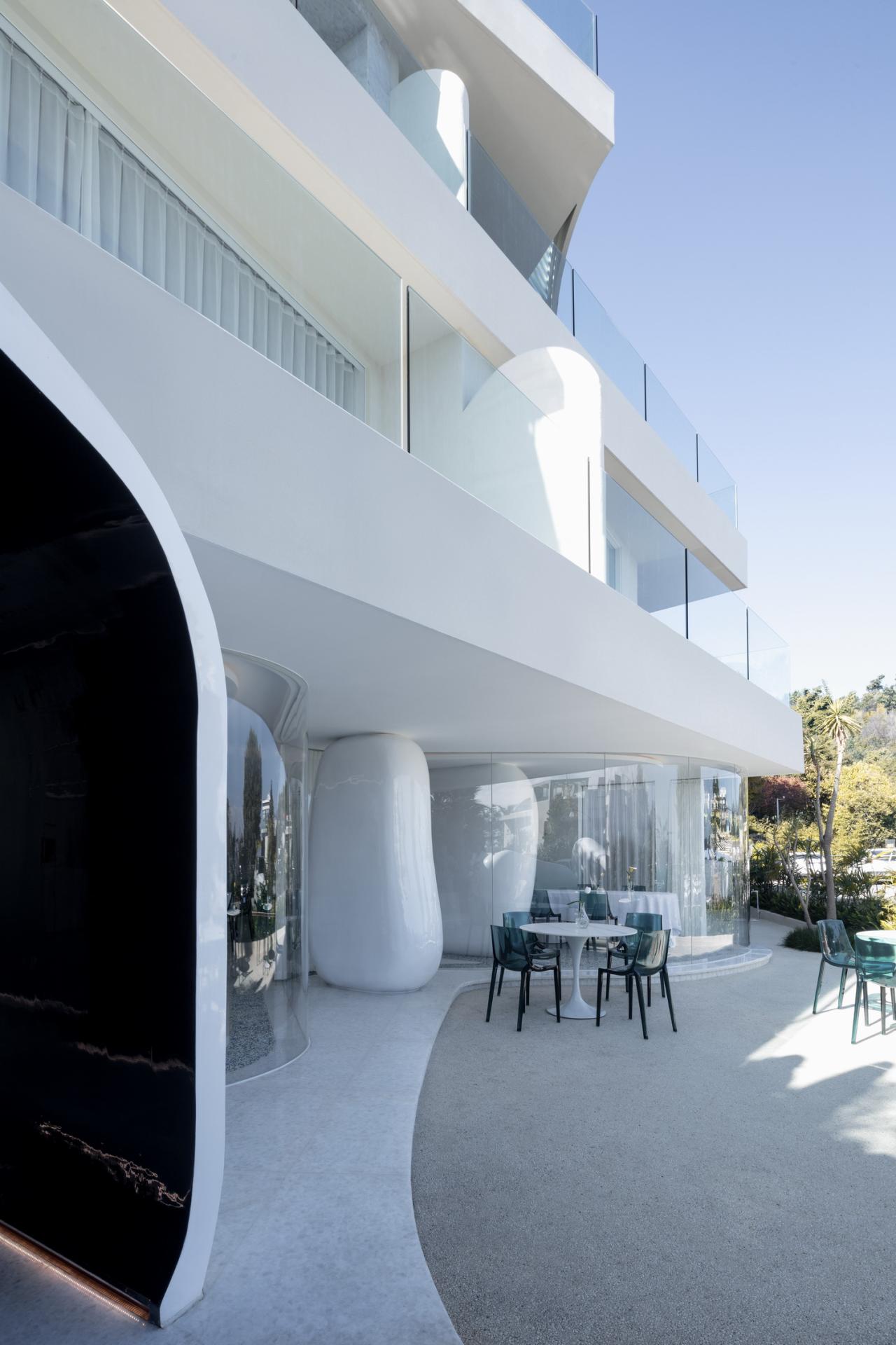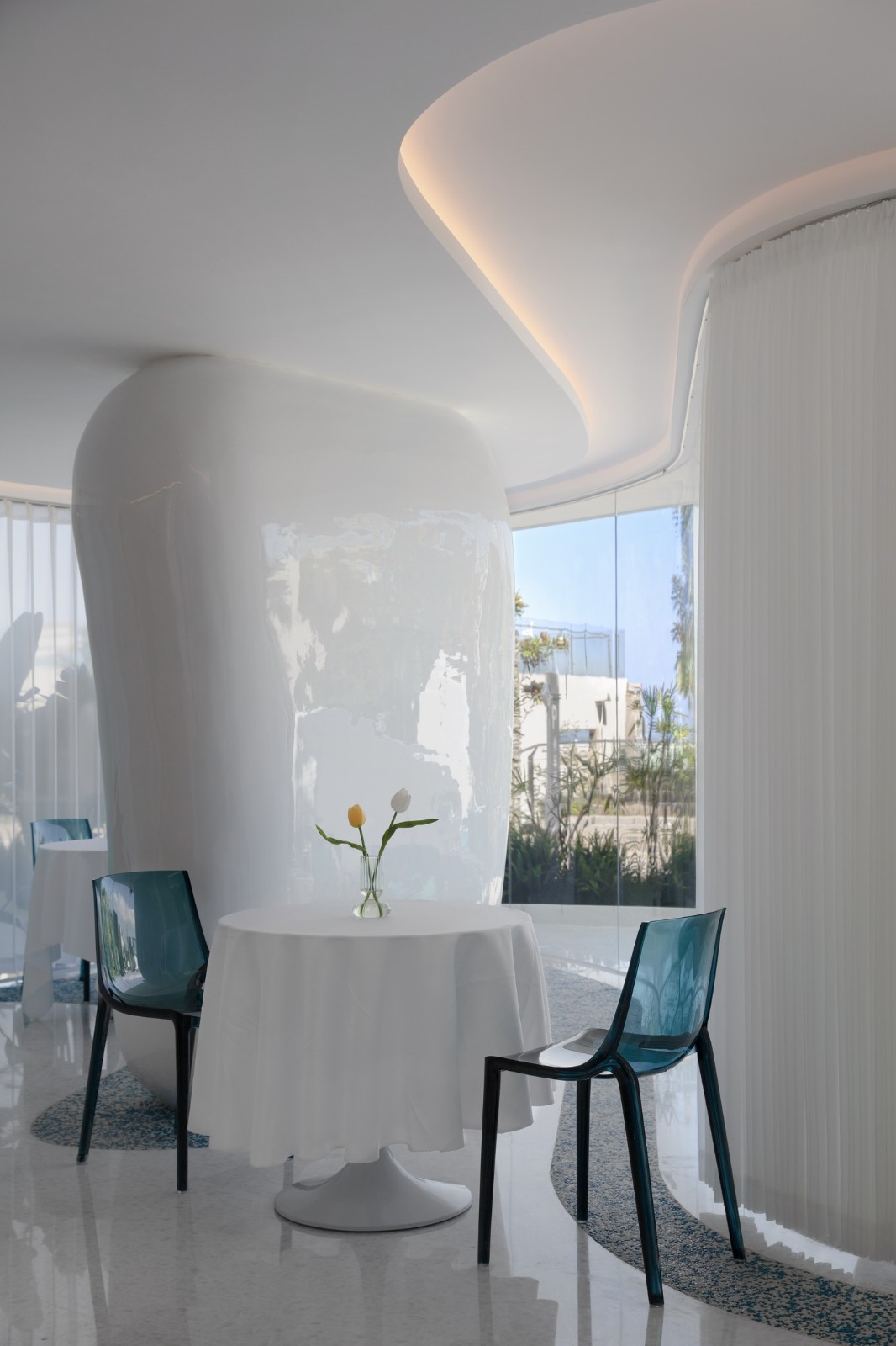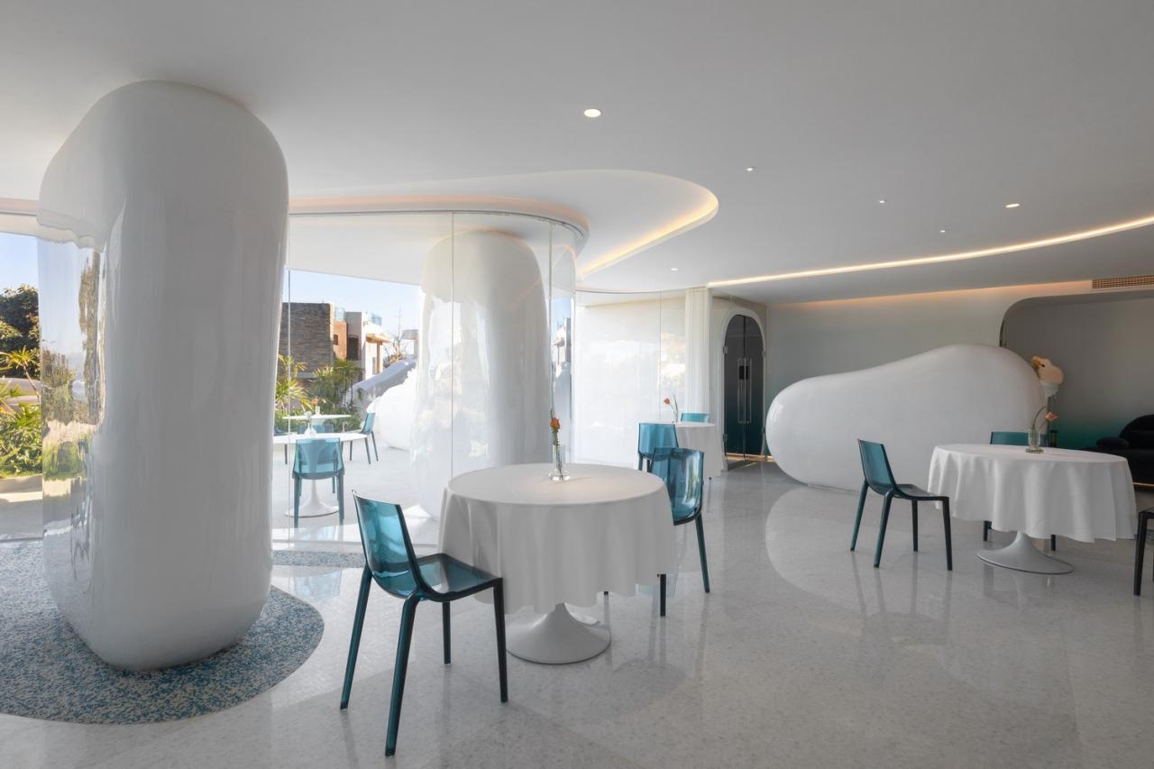 通透柔和的曲面落地玻璃贯穿其中,使餐厅空间犹如浪潮轻抚着卵石一般,展现出有机且优雅的气质,打破了原本内外分明的空间界限,融合了室内外。