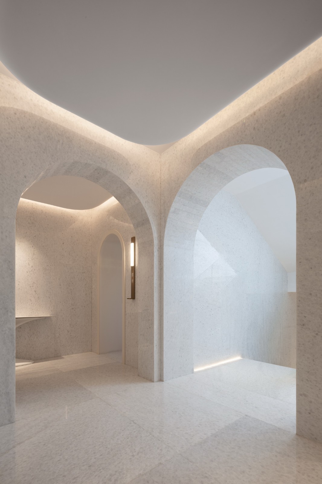 由雪花白大理石打造的楼梯间与客房入户玄关,在自然与人工光线的共同作用下呈现出米色的温润宁静,由此过渡调和就餐空间与居住空间的不同空间体验。