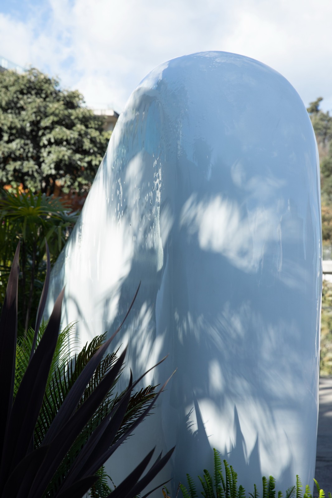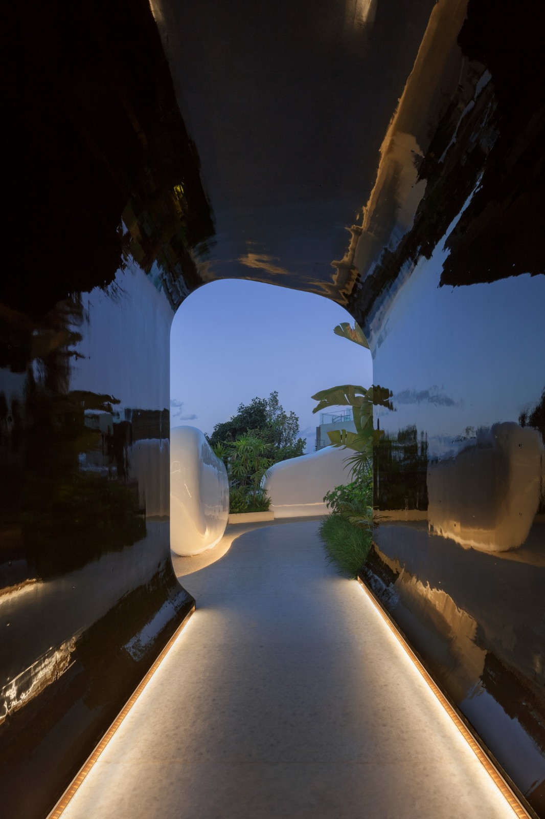 餐厅入口玄关处犹如一颗被剖开的巨大卵石,从中穿过有强烈的包裹感,卵石内部用深色汽车烤漆工艺达到近乎镜面的效果,庭院的光影与景致在这里汇集,让第一次到访的客人感受到身体与空间的直接对话。