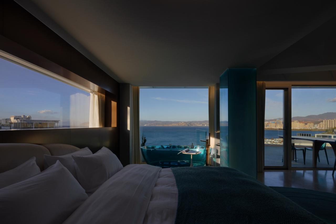 顶层以及天台作为一个独立的大套房,客厅、餐厅、卧室、玻璃泳池和景观天台一起构成了一个与天空最接近的度假空间。阳光透过泳池折射到客房内部,光影斑驳犹如置身海中,是整首浪漫主义之歌的终章也是我们认识大理的开始。