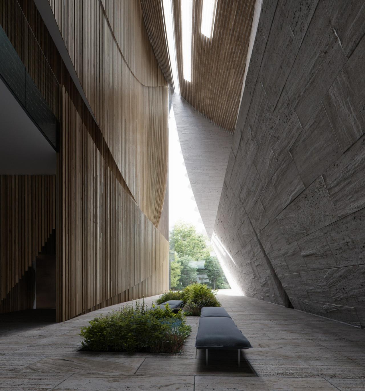 除了CAMERIMAGE电影中心本身,设计提案中还囊括了一个公共广场,从而融合了托伦市所有的全新文化中心活动。此外,设计团队希望专注于场地本身可以创造的感官体验,因此,他们通过选择陶瓷和木材等材料,着重构筑了视觉与触觉体验,并与建筑的不同视角搭配,形成了与整个街道融合的有机形态,并建立了通往电影中心建筑的多方位通行组织。建筑物的主要展示面和主入口方向均朝向al. Solidarności,从而为观览者打造了最突出的视觉通道,并构筑了如同钢琴键般的楼梯及琴键上的“红毯”,将人们引入艺术世界的空间。