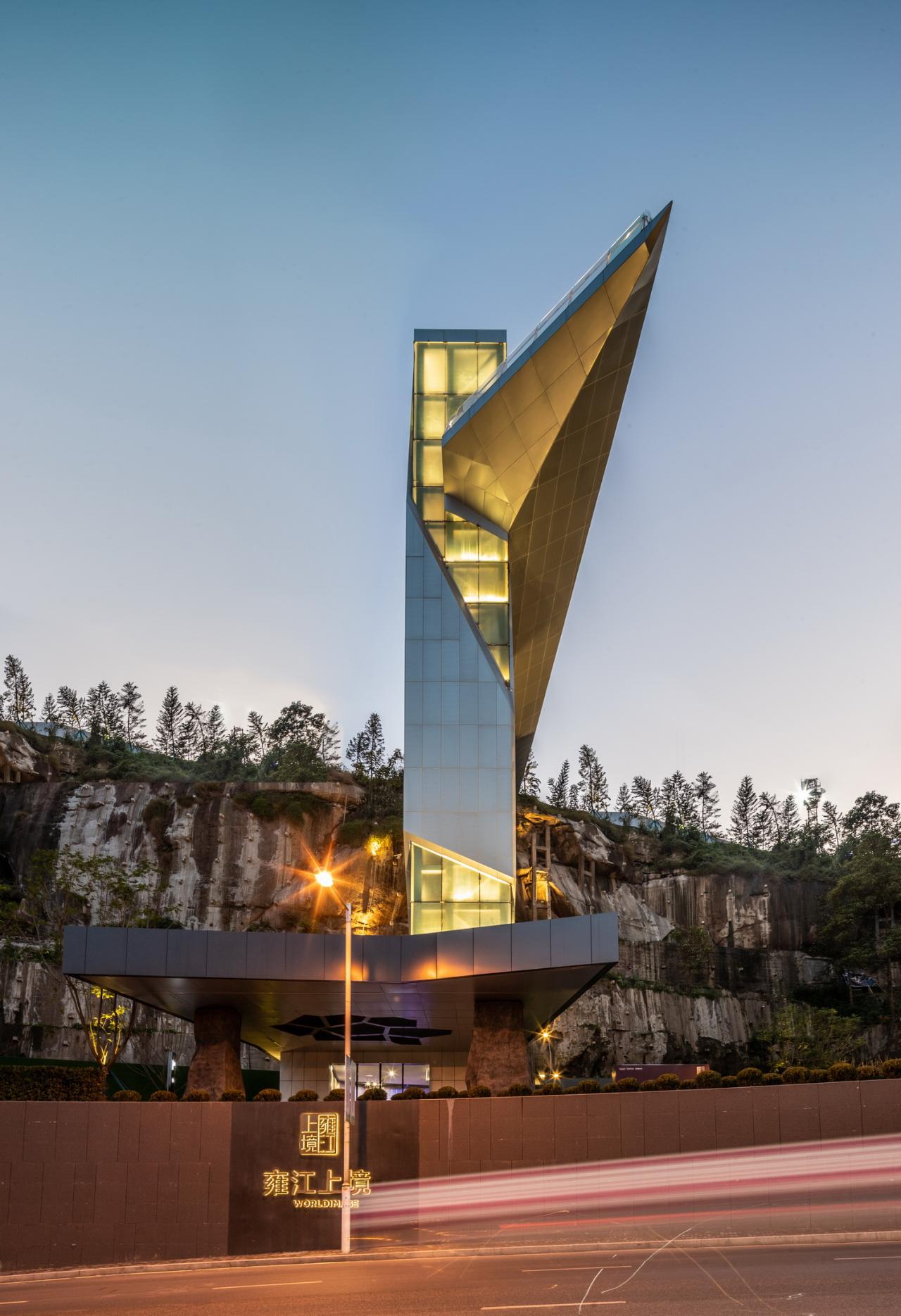 项目位于重庆万州,坐落于紧邻长江、垂直高度约30米的悬崖边上,得天独厚的地理位置为项目提供了独一无二的体验,同时也为设计带来了不小的挑战。项目总建筑面积约3000平方米,包括联系悬崖高差的景观电梯、体验馆建筑主体、以及观赏江景的观景塔。