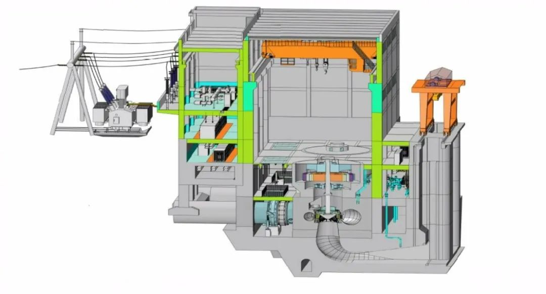 主厂房内布置4台立轴混流式水轮发电机组,单机容量50兆瓦,总装机容量200兆瓦,多年平均发电量4.556亿度。设有一台200吨的桥式起重机,在下游侧布置有机旁屏柜。水轮机层设有圆筒式机墩和风罩,水轮机转轮直径2.9米,同时在该层布置安装共箱封闭母线、液压站、调速器、渗漏排水设备、检修排水设备、机组技术供水设备、消防供水设备。蜗壳层设有蝶阀室,安装4台直径4.1米的蝶阀、除湿机。安装场布置在主厂房右侧端部,安装场下布置有高低压气机室、油罐室、油处理室和生态基流旁通管,副厂房布置在主厂房上游,分为四层,第一层为电缆夹层,设有电缆桥架,第二层从左至右依次布置柴油发电机室、近区配电室、低压配电室、电缆室和蓄电池室。第三层布置有中控室、10千伏高压开关室,顶层布置有GIS室,通过出线架连接至户外两台主变压器,机组尾水布设有尾水检修闸门,通过移动式门机进行启闭。