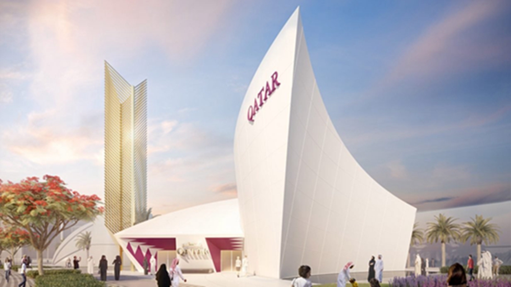 卡拉特拉瓦的展馆设计旨在将两把交叉和弯曲的剑、传统的单桅帆船和卡塔尔盾徽上有棕榈树的岛屿转化为一种建筑设计,以突出“运动、机动性、力量和传统”。由此产生的展馆的视图显示了一个弯曲的、帆状的结构与一个较低的建筑相交。建成后的展馆面积为620平方米,主楼高度近15米。卡塔尔展馆将包括两个主要画廊和展览空间,展示卡塔尔历史和文化的沉浸式虚拟现实的体验。展馆旁边将有一座代表棕榈树的金色雕塑,高20米。这是个旨在捕捉“国家愿景”的建筑。这个目前由迪拜承包商亚历克-菲特(ALEC Fitout)建造的展馆的形状,旨在象征“卡塔尔对未来的进步展望,同时保持其文化和遗产的真实性”。卡拉特拉瓦国际工作室(Calatrava International)首席执行官米凯尔-卡拉特拉瓦(Michael Calatrava)表示:“设计灵感来源于卡塔尔国徽,真正体现了国家的本质和愿景。”。他补充道:“展馆的建筑姿态和结构形式表现了独桅帆船的形状和巨大的船帆,是游客体验的全部所在。”他说:“展馆入口处的雕塑纪念碑代表了两棵相互缠绕的棕榈树的抽象转化和融合,而展馆周围的反光池和综合水景则代表了阿拉伯海湾,其中包括卡塔尔国。”展馆由KRION人造石制成,KRION人造石是一种由三分之二的天然矿物和一定比例的高电阻树脂组成的材料。卡拉特拉瓦工作室说:“这是一种生态材料,因为它是100%可回收的,”
