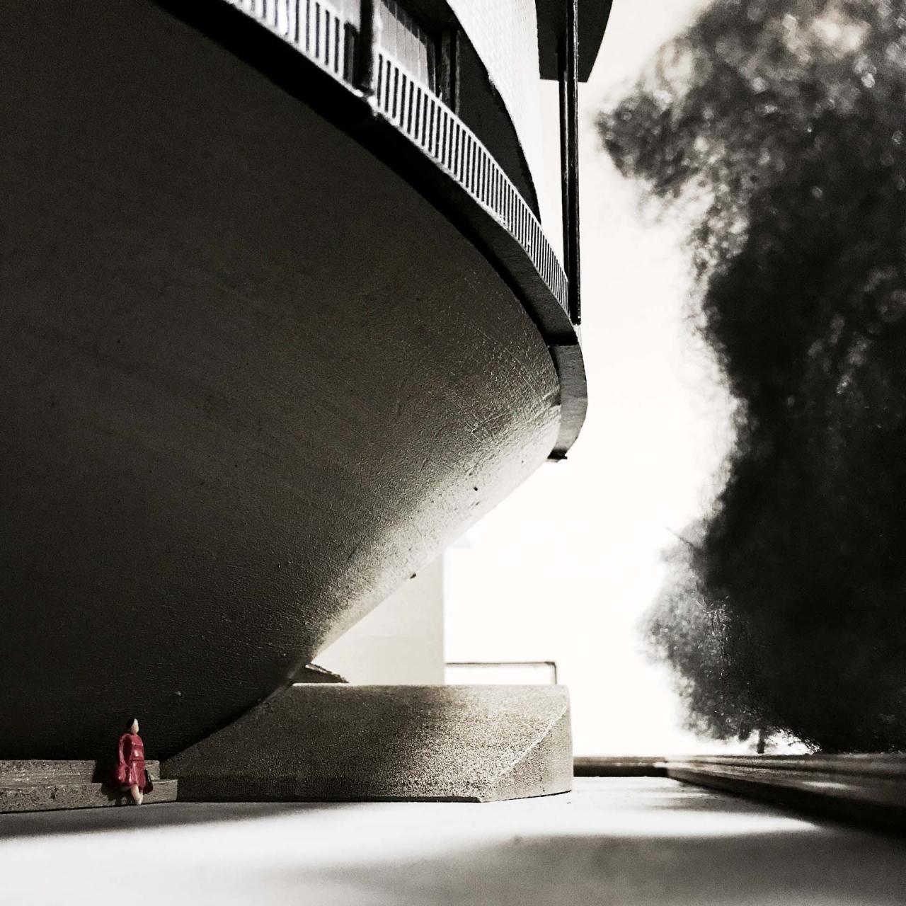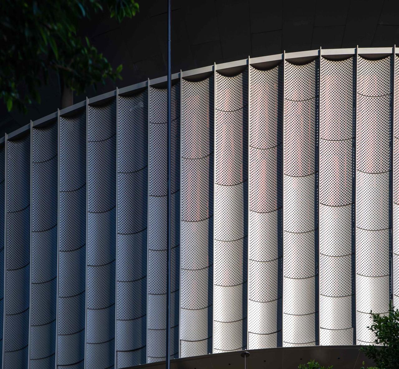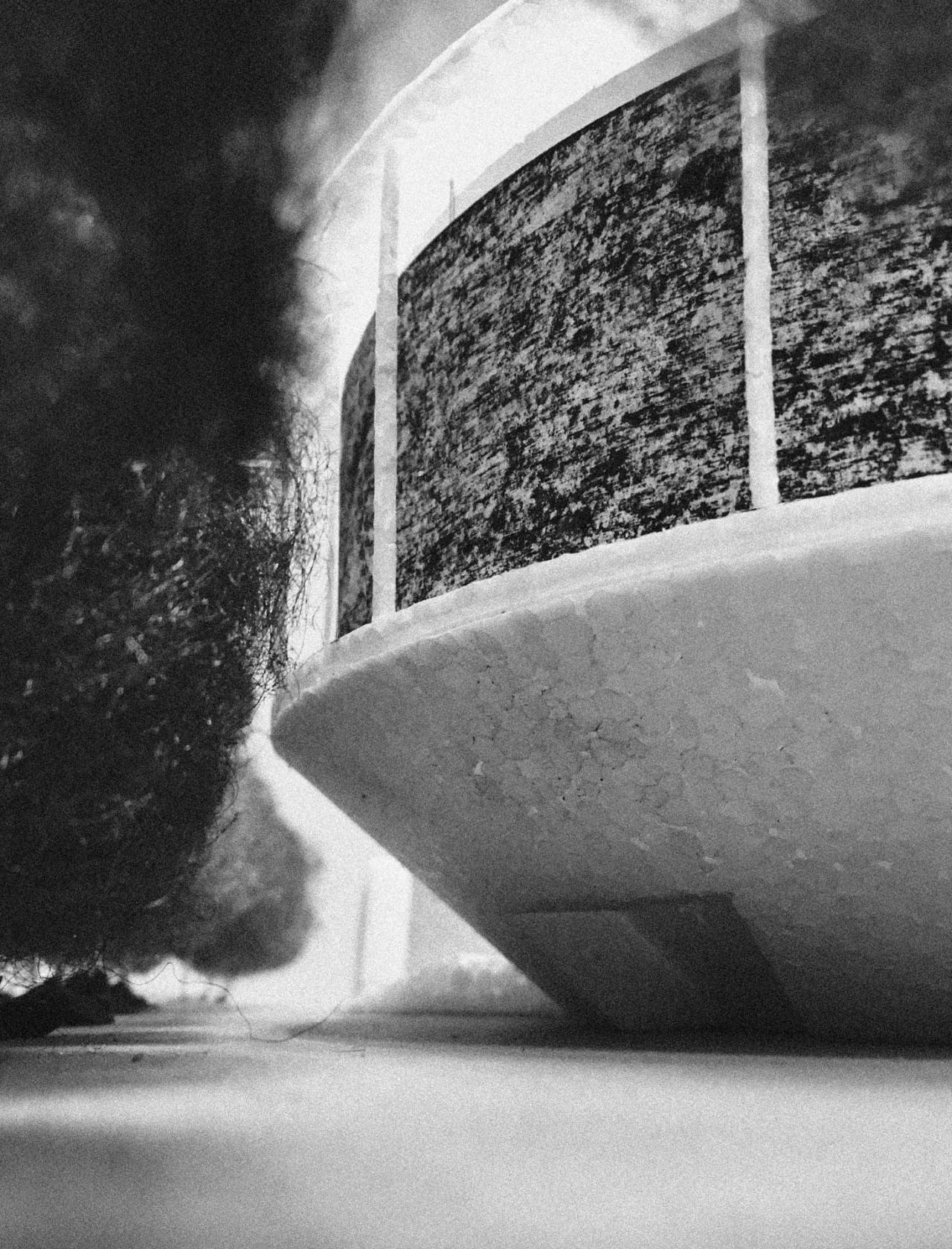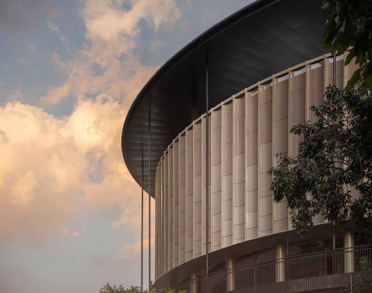 建筑语言的发展,顺应着体量上轻下重的基本关系:下部基座轮廓如碗体,不做尺度刻画,让体量“山石”般的性格被放大;而上部敞廊尺度精分,用“人工”的准确,与基座的世界护为对照。整体关系犹如山体上的廊亭,成为这座热带城市中的风景。