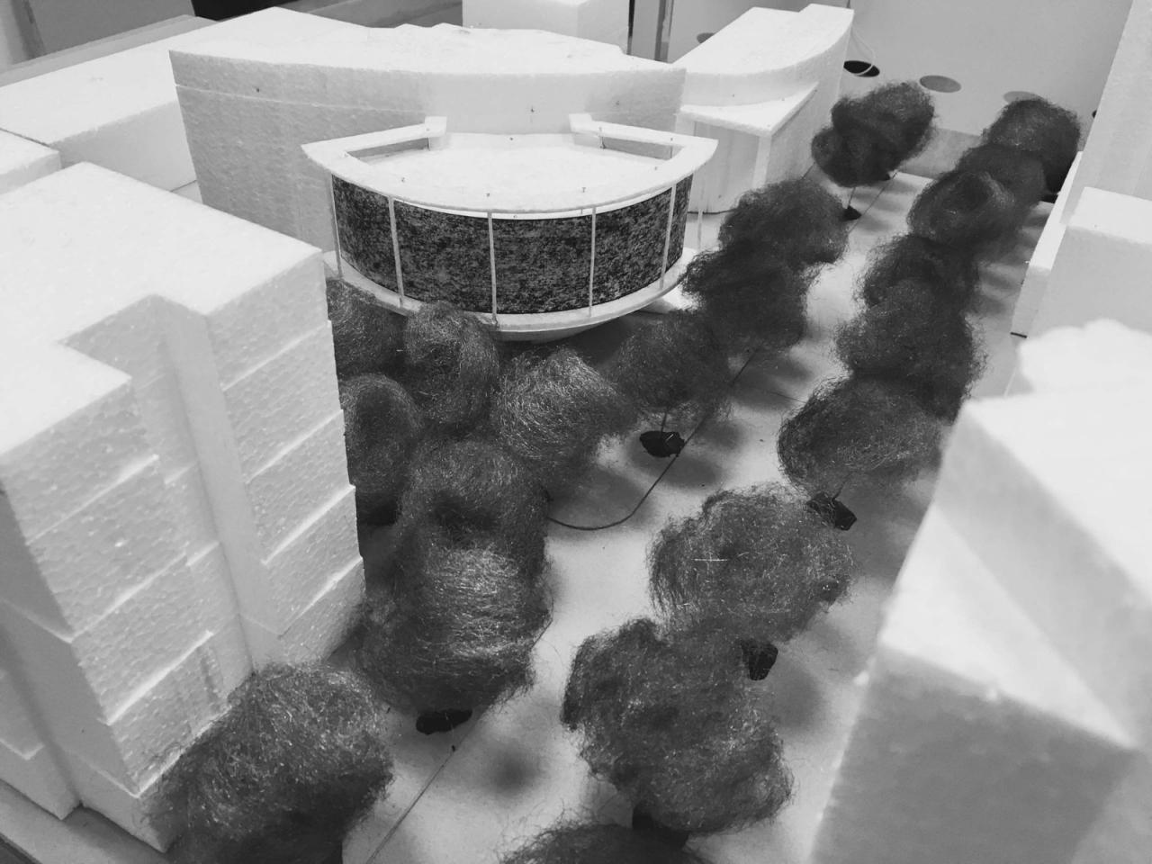 梦工场的空间,可以理解为一组地形关系中的“挖空”与“覆盖”。从外部广场至内部看台的行进过程中,场地设计由外至内贯穿,体验始终被地形的线索牵引,模糊了场地与建筑惯常的区分,顺应原建筑强烈的性格,塑造出一系列与“山石”有关的,连续的空间经验。