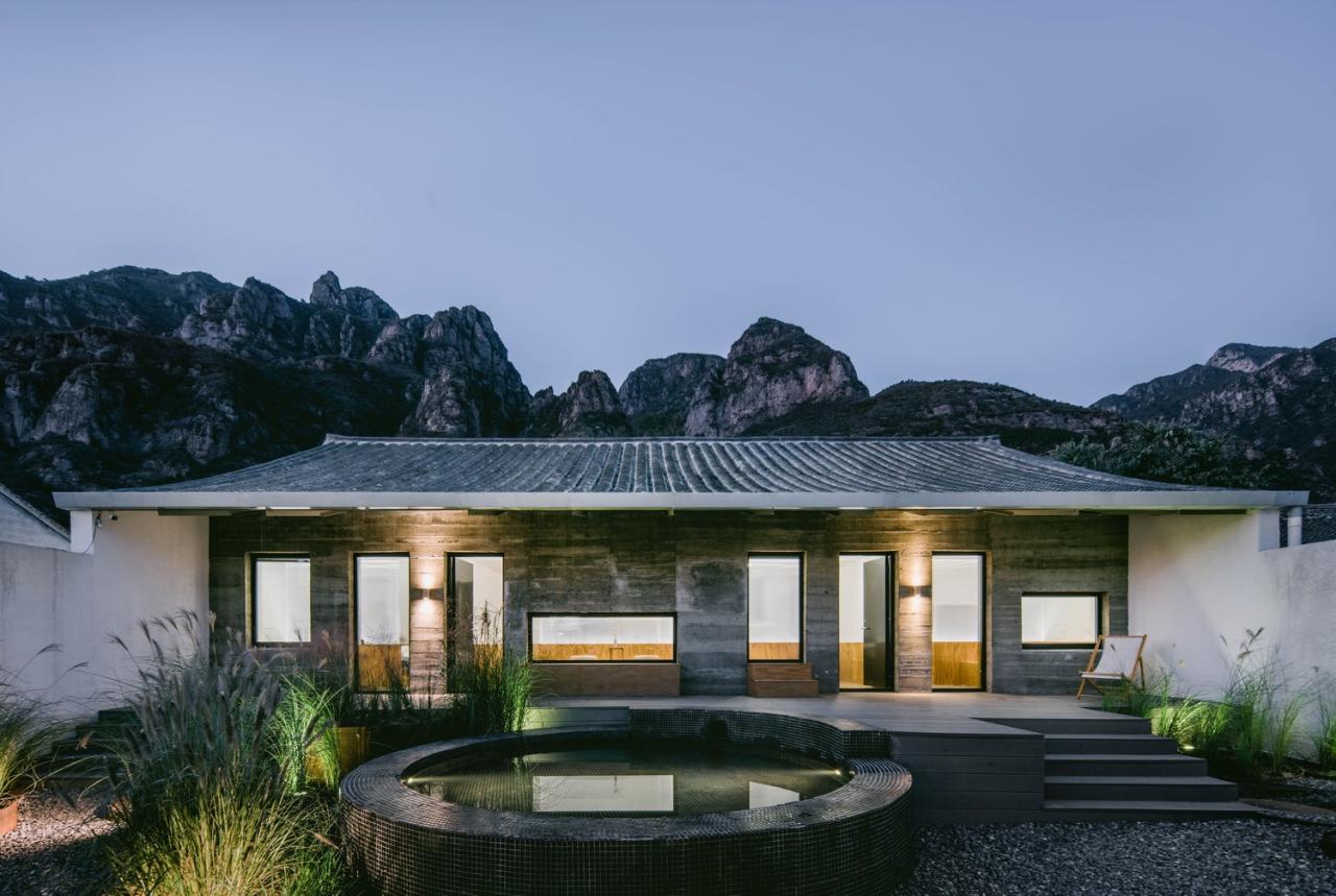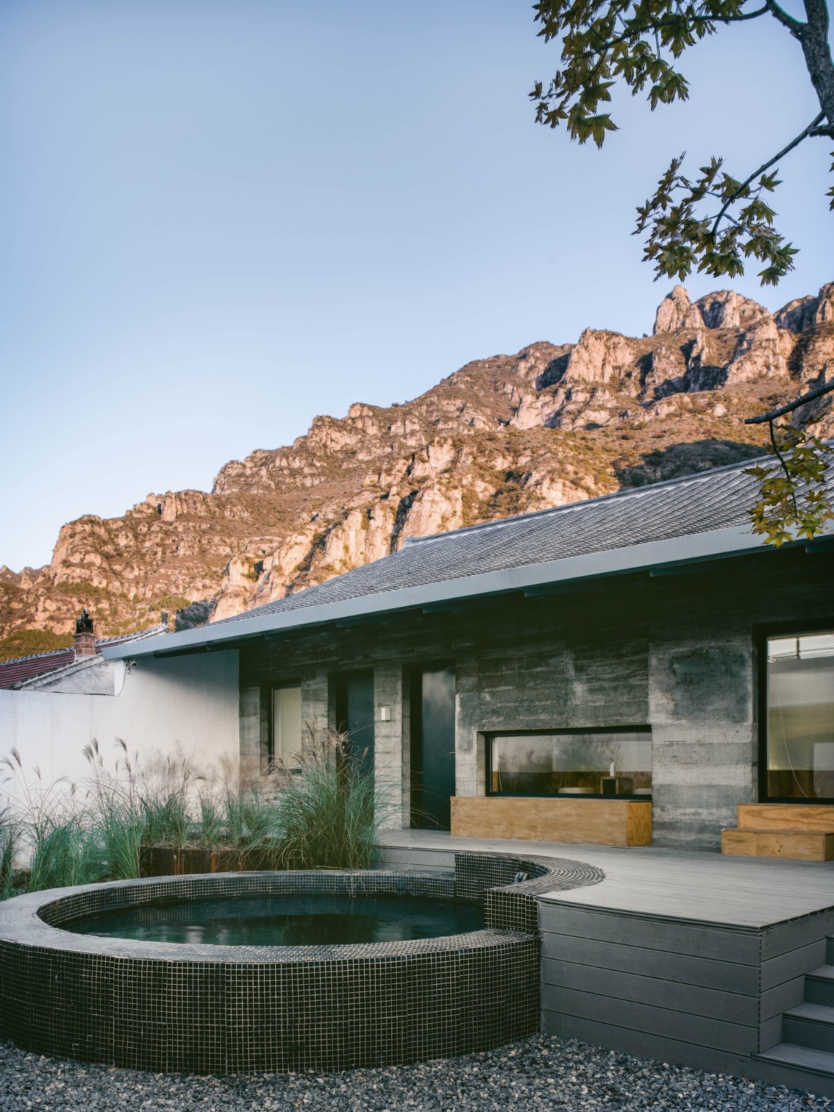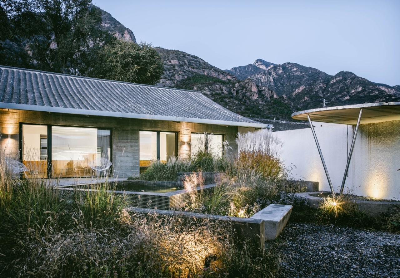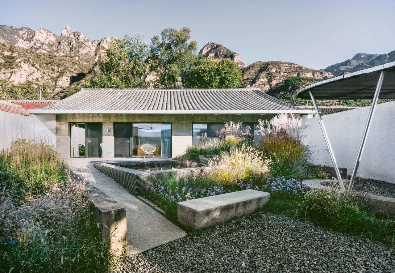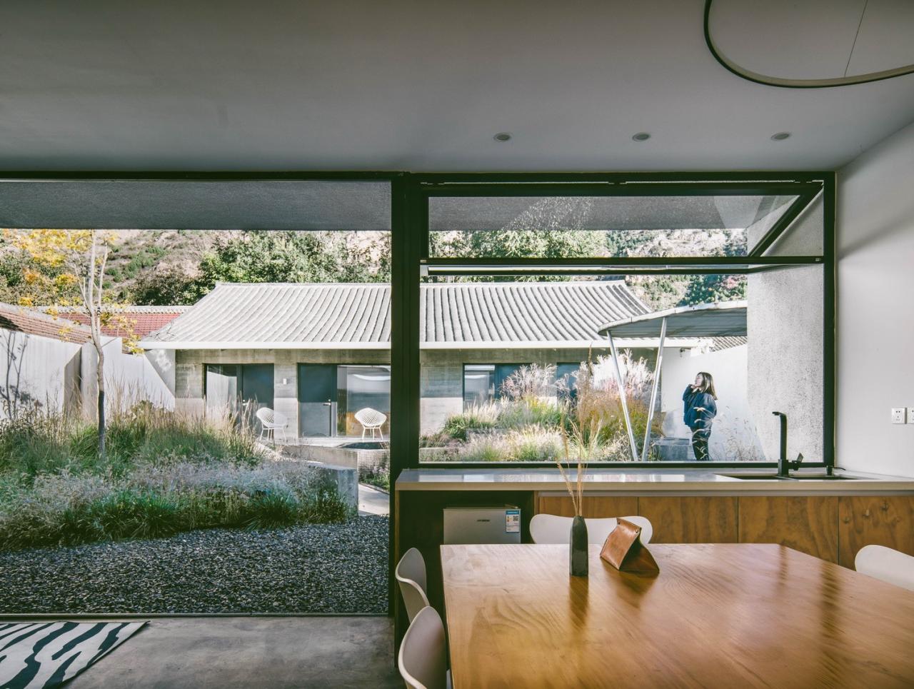我们希望建筑能够为人们观赏山景提供舒适的条件,而非通过制造奇观式的“凸出”物体让自然景色沦为陪衬。这一立场决定了整个院落中的建筑都呈现素色、且建筑节点与做法都尽可能低调。唯一鲜艳夺目的是花园中葱郁茂盛的植物。院子仿佛原本就存在于此,建筑师的工作只是前来做了清理与恢复。