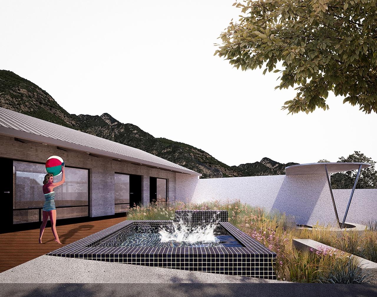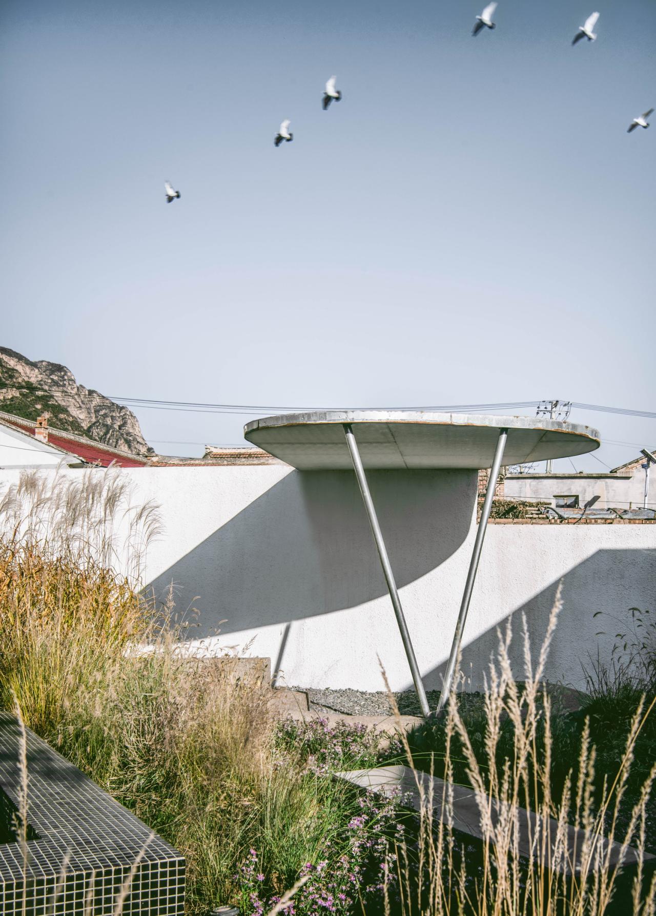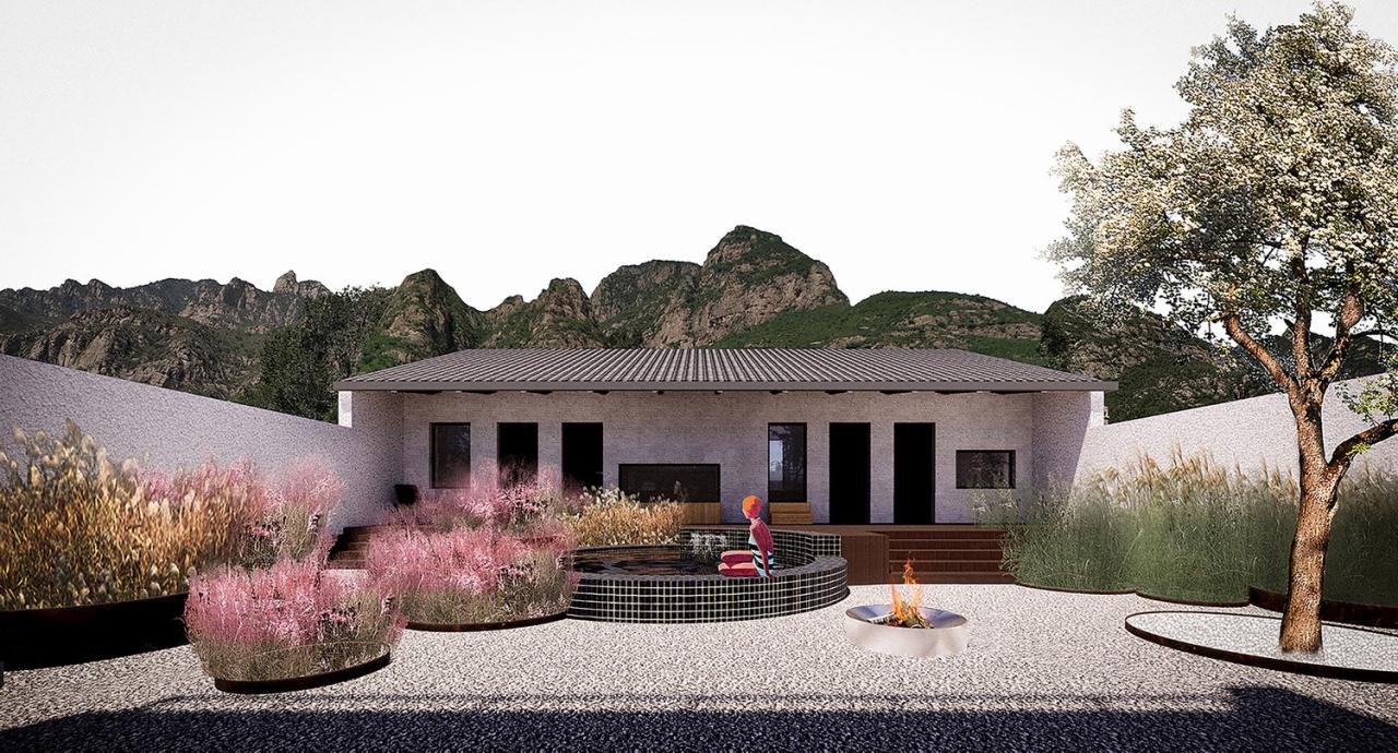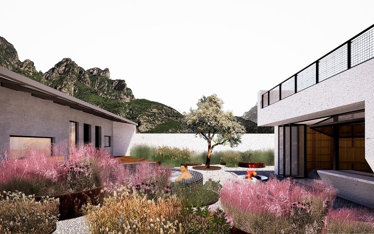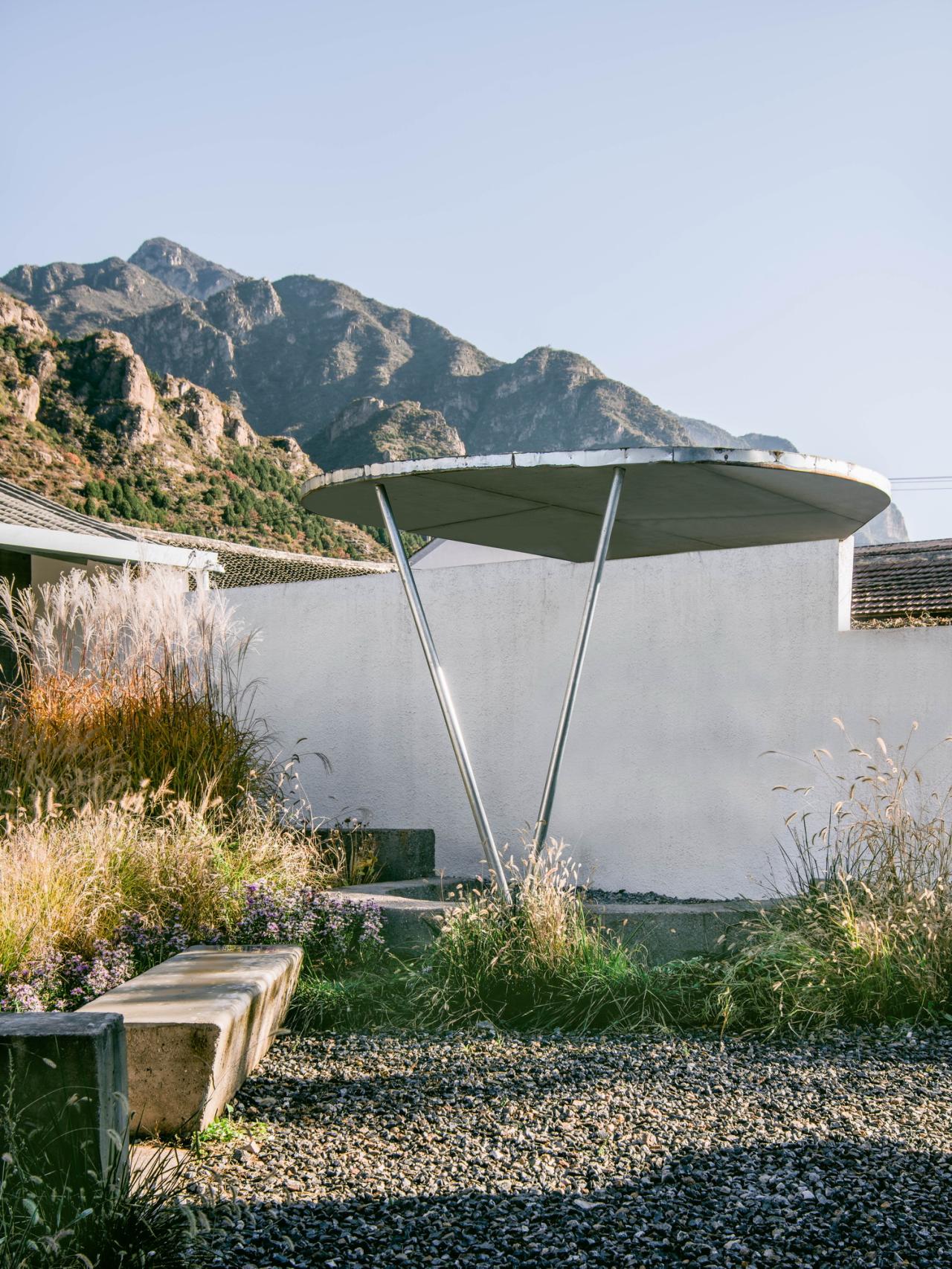 两个院子看似相同,却有着截然不同的布局。南院的活动——包括嬉水池、露天影院、一个拥有半户外吧台的聚会区——都围绕坐落于正中的亭子而散布在院落之内,被大小各异的、种满高草的圆形种植池所包围。与之相反,北院的“亭子”以及其他活动区域则反过来包围着一个集中的花池。南北院使用上的“反转”使看起来相同的孪生院子产生了富有趣味的差异,也希望催生不同的院落使用方式。而郁郁葱葱、野性、随着季节枯荣的植物和富有活力的户外活动,为两个院子起居室“永恒”的山景提供了别样的前景。