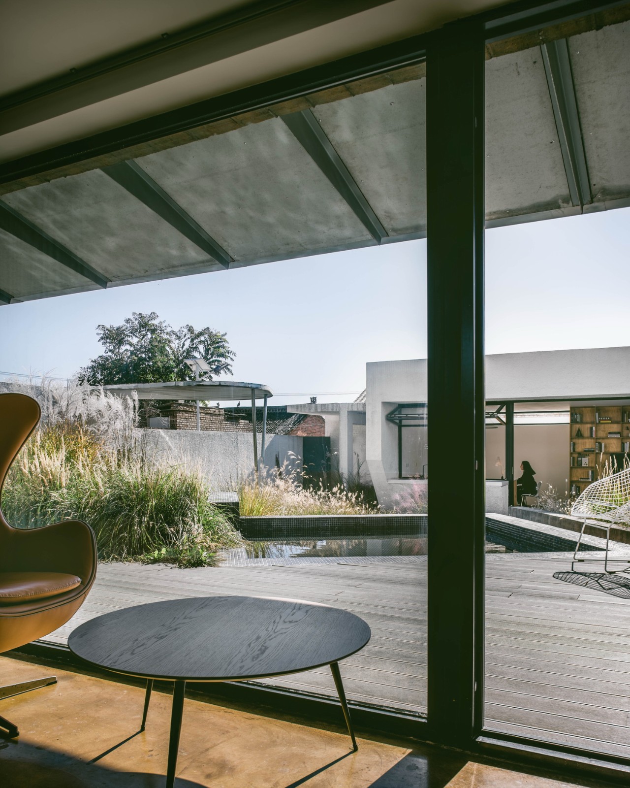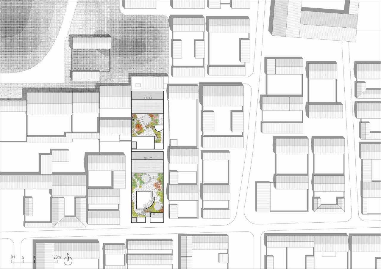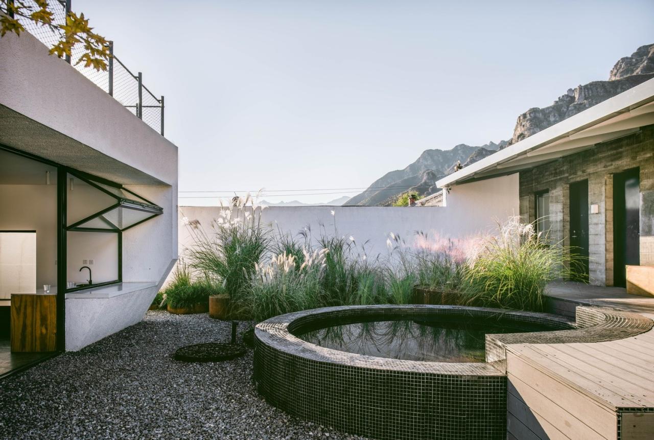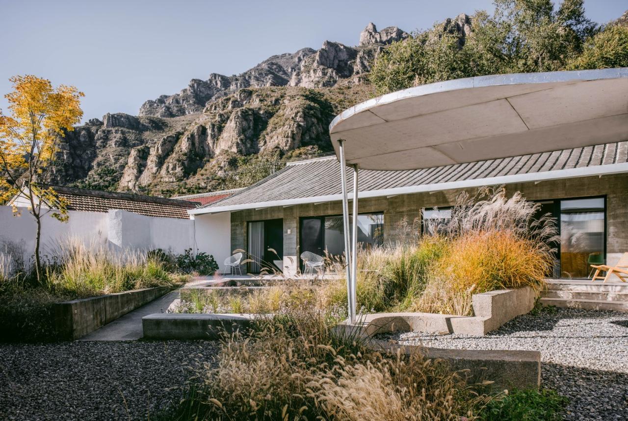 两个院子看似相同,却有着截然不同的布局。南院的活动——包括嬉水池、露天影院、一个拥有半户外吧台的聚会区——都围绕坐落于正中的亭子而散布在院落之内,被大小各异的、种满高草的圆形种植池所包围。与之相反,北院的“亭子”以及其他活动区域则反过来包围着一个集中的花池。南北院使用上的“反转”使看起来相同的孪生院子产生了富有趣味的差异,也希望催生不同的院落使用方式。而郁郁葱葱、野性、随着季节枯荣的植物和富有活力的户外活动,为两个院子起居室“永恒”的山景提供了别样的前景。