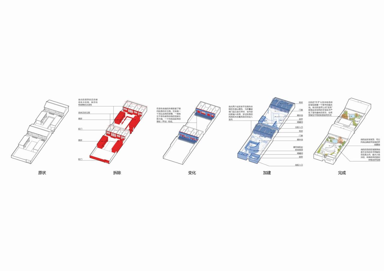 从天安门出发向西北方向出发八十公里左右,玉渡山面南俯瞰着平坦的延怀盆地。拥挤的、具有华北地区农村典型面貌的晏家堡村就坐落于玉渡山麓之上。它毗邻著名的龙庆峡风景区、世界园艺博览会展场、以及石京龙滑雪场,旅游资源丰富。业主租下村落深处一对兄弟所拥有的两个院落(下文称“南院”与“北院”),希望将它们改造为整院出租的民宿。任务书要求建筑师合理地利用院落中现有的建筑提供尽可能多的客房、充分考虑到有限造价下建造的经济性、以及避免改造后的建筑对周邻居的生活产生影响。而作为房主的两兄弟,也有特别的要求:其一,改造必须尊重两处院子的既有产权边界,不能将两处基地打通使用;其二,因风水而不允许更改院落的出入口朝向。