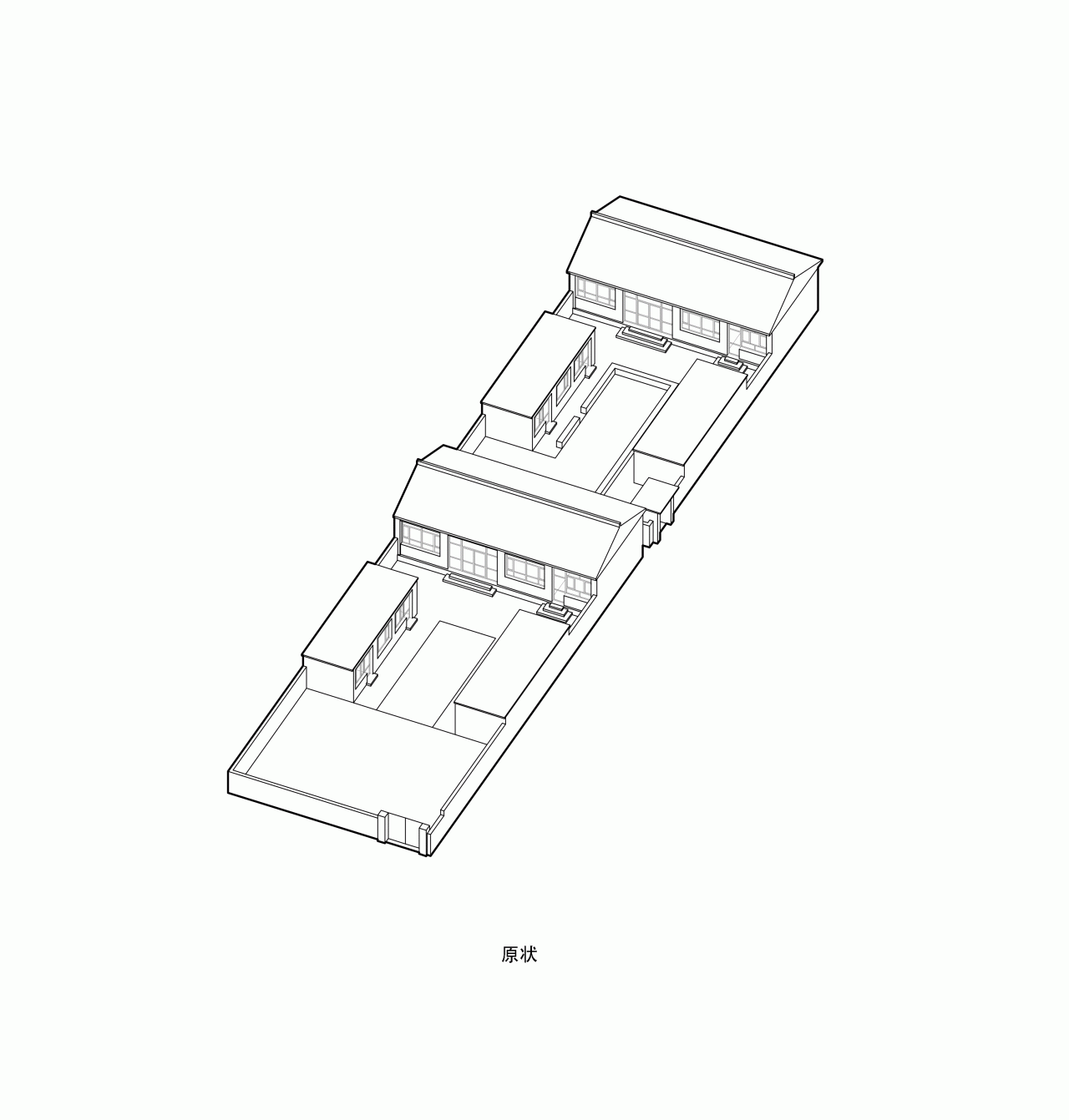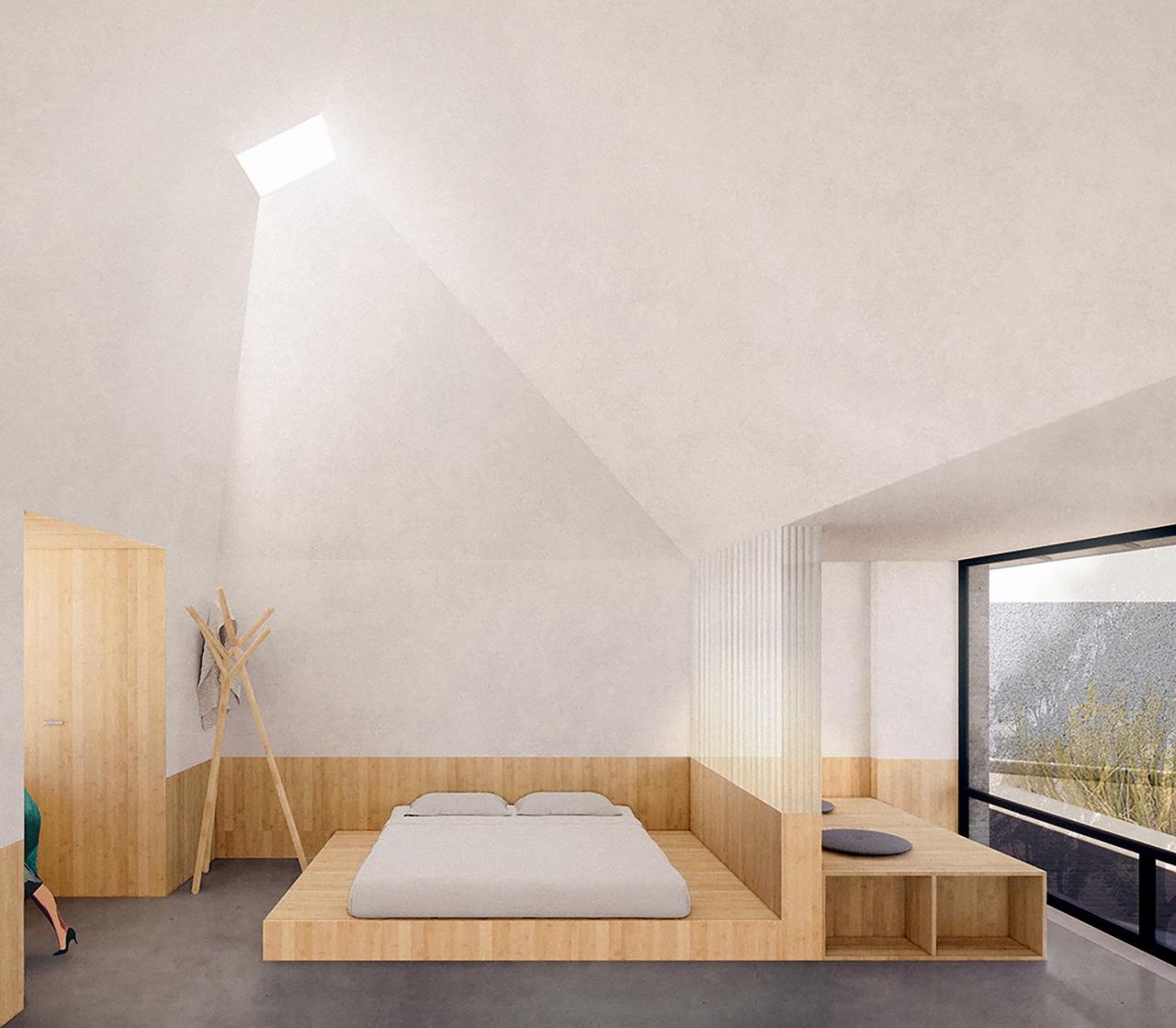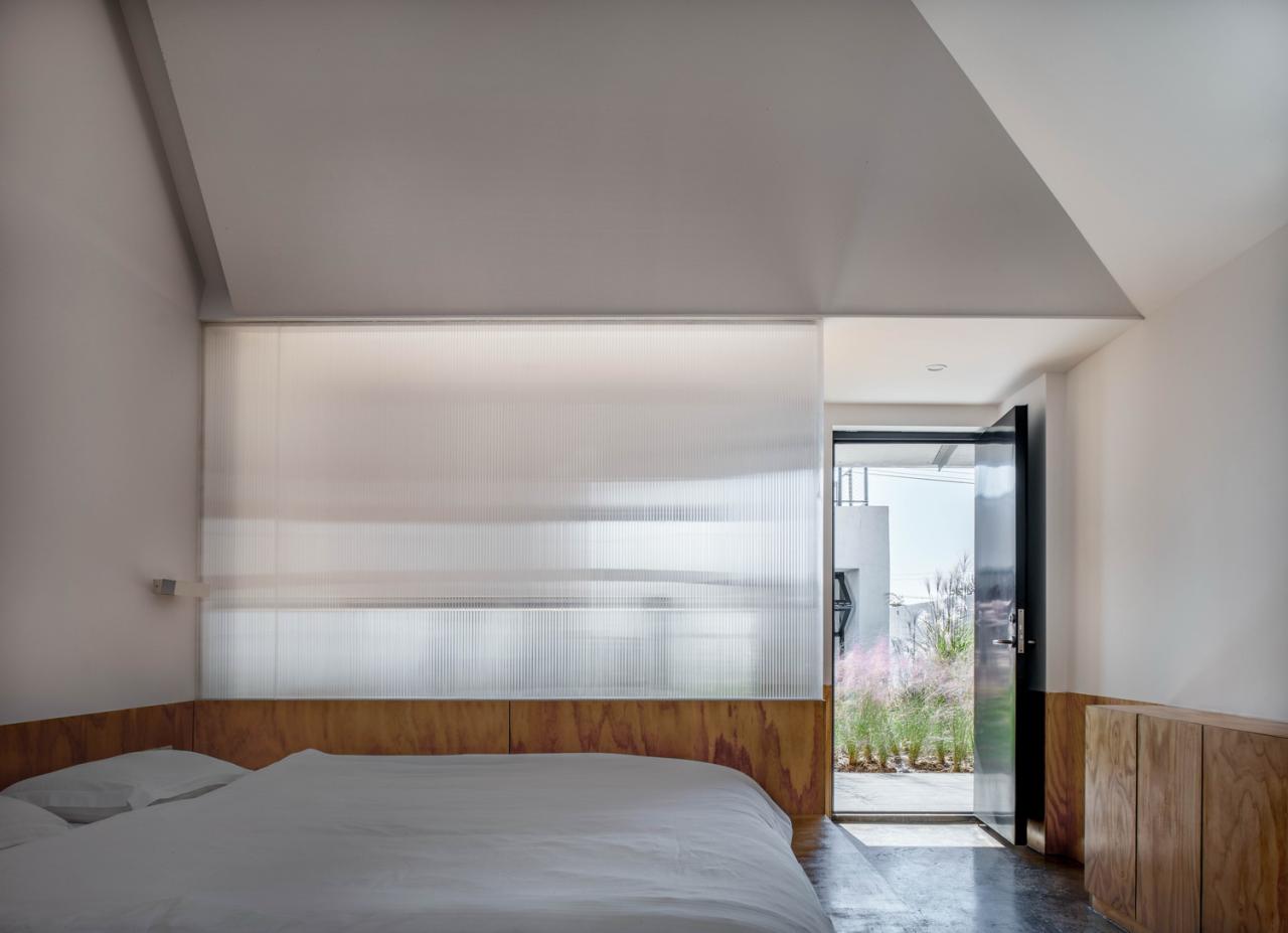 考虑到原有房屋较大的进深,我们在客房内除了设置基本的盥洗和睡眠区域外,还增加了一处“修室”。与物尽其用地利用原有房屋结构营造高大室内的睡眠区不同,修室是一个狭小、与人体更为亲近的空间。通过尺寸各异的窗户,修室得以挑战人体与窗外院落景致不同的关系。同时,它也充当了强调隐私的客房与院落生活的缓冲。