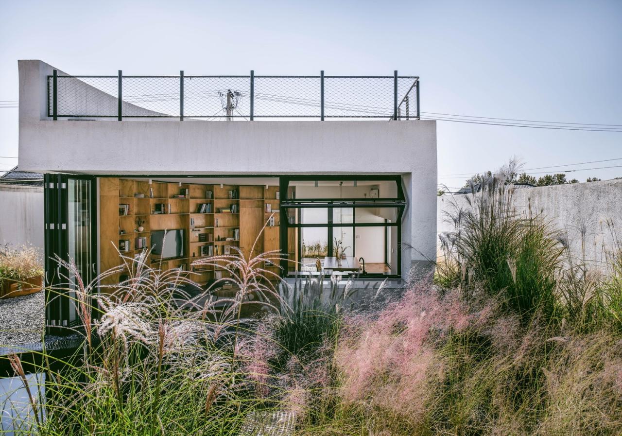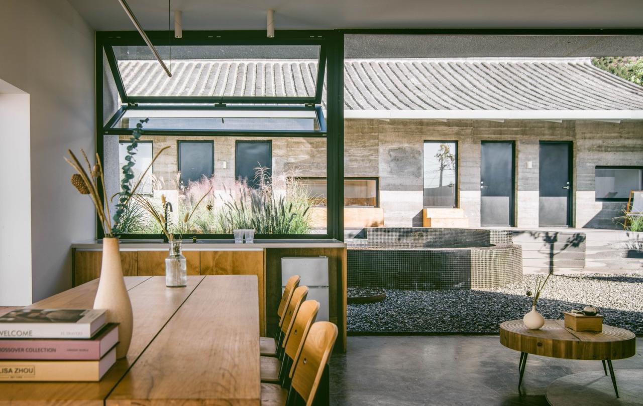 我们在每个院落的南侧置入一个朝北的“亭子”,作为起居室、以及整个院落的公共活动“锚点”。它不仅拥有北方壮丽的玉渡山景色,当折叠玻璃门扇完全打开时,“亭子”的室内空间更融入院落,穿过院落的风和阳光也毫无阻拦的进入室内。天气晴朗的时候,人们亦可登上南院“亭子”的屋顶,向南远眺延怀盆地的开阔景致。院子四周大多数墙体都被白色质感涂料覆盖。这一该地区被人们广泛使用的外墙材料让新建筑成功地隐蔽起来。