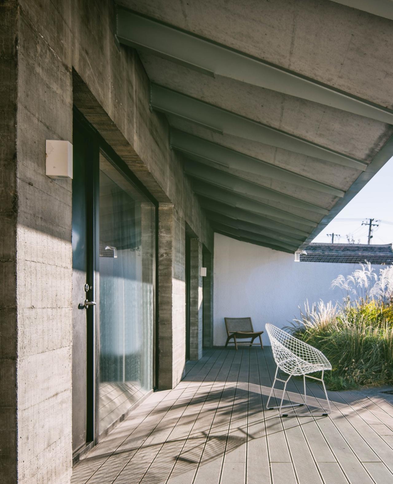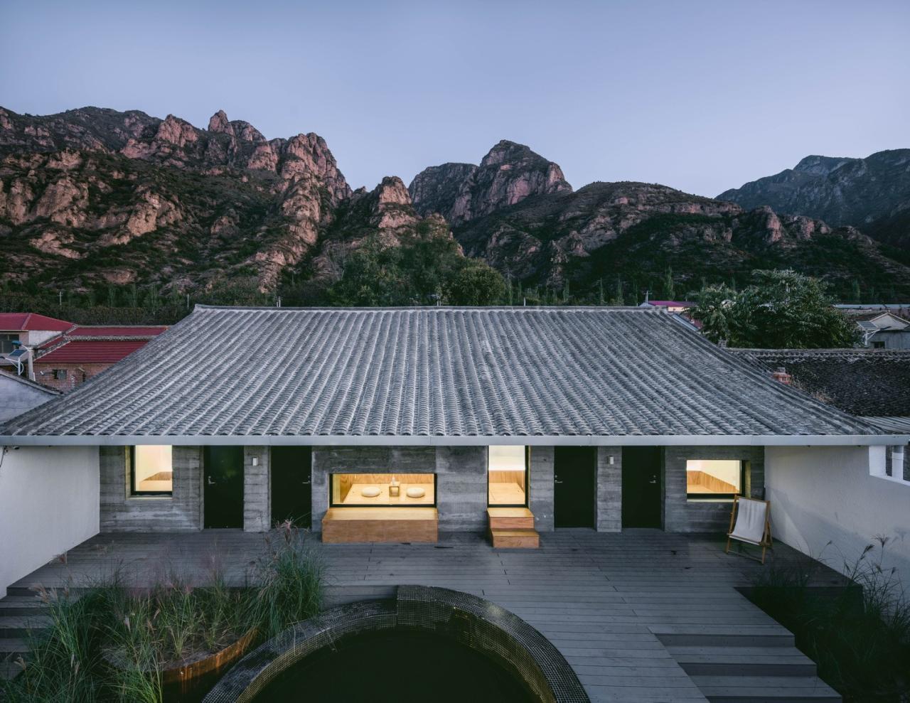 院落坐北的砖木结构正房因为经济原因被保留下来,但其南立面需要进行改造以适应建筑内部的变动。为了最大限度的不对原有建筑的结构造成破坏,我们拆除了南立面上的非承重构造、并浇筑了一堵与原有房屋结构脱离的混凝土剪力墙。这个简单的动作达成了三个目的:其一,剪力墙赋予了建筑以自由的立面;其二,剪力墙支撑起一个两米多的深远挑檐,延展了原有建筑的屋面,形成一个花园与客房之间的“灰空间”;其三,混凝土粗粝的质感与远方的山脉相映成趣,并与其他白色的墙面形成反差、成为院落中的视觉焦点。挑檐与门廊组成的这个三维立面在视觉上压低了正房原本高大的南立面,使之退后到阴影之中,谦逊地成为壮丽山景的注脚。