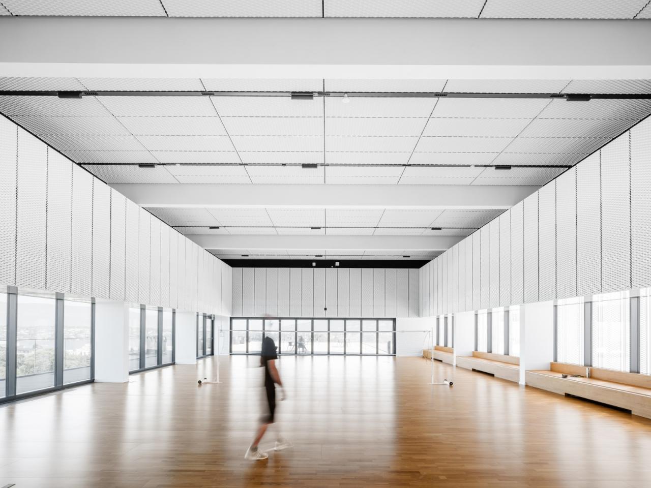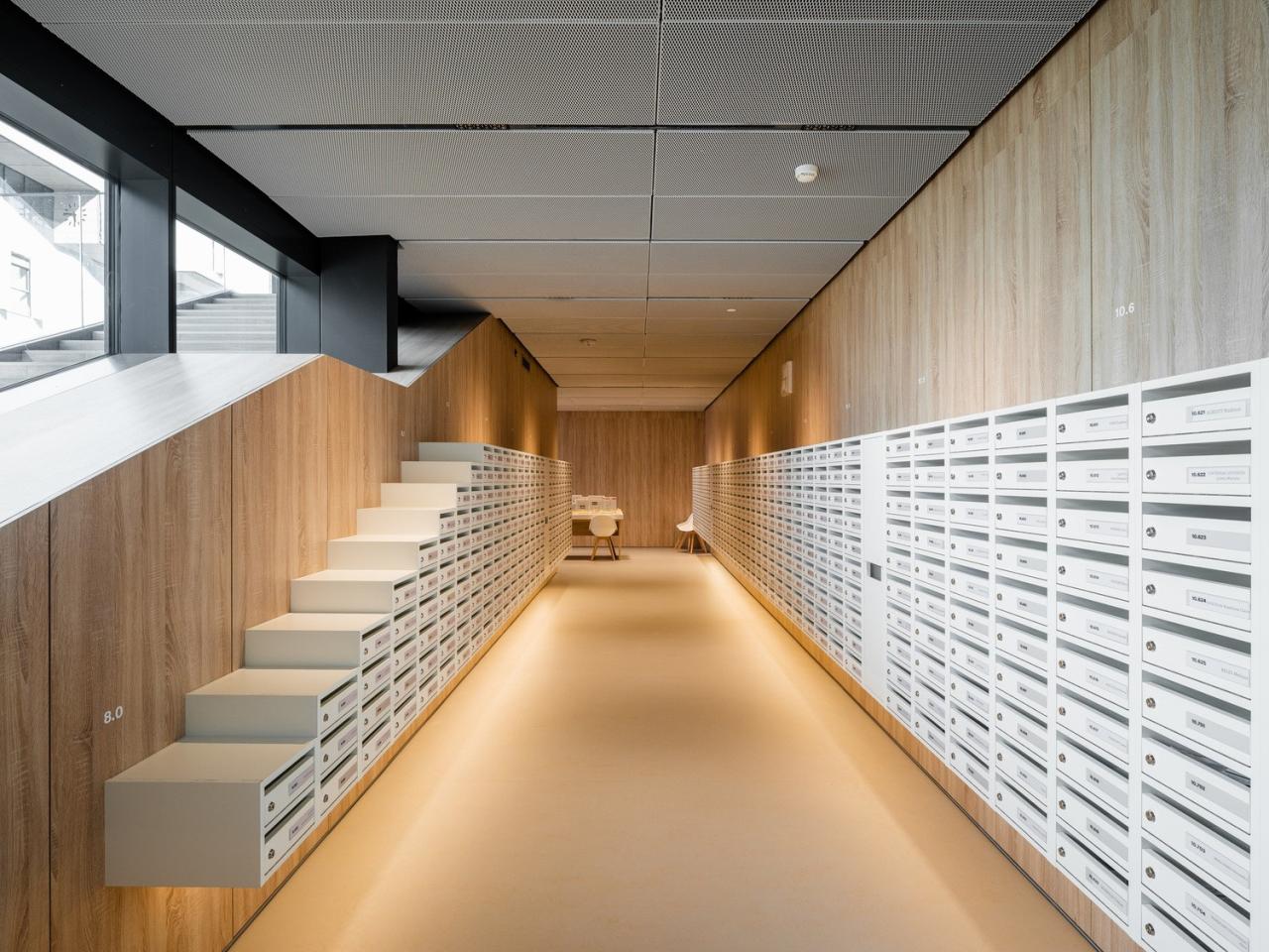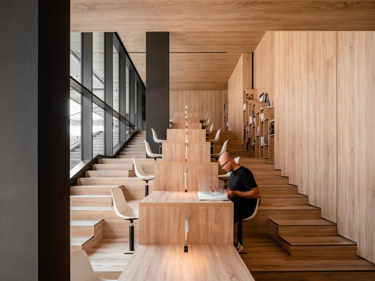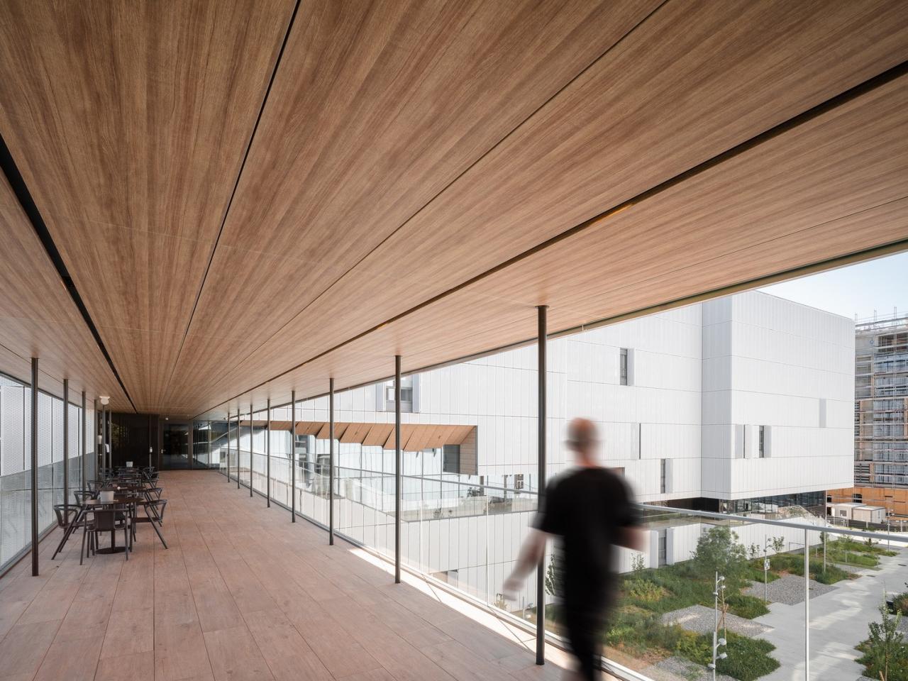 3.6米宽的滑动百叶窗与建筑群的金属立面融合,并让内部空间可以自由调节亮度和生活空间的隐私度。随着一天中时间的变化和学生活动的进行,立面上百叶窗的开或合让建筑群产生了视觉上的不断变化。同时,室内空间被赋予了木材的温暖,并与外部空间的灰与白形成了对比。630间学生宿舍就此与公共区域完美过渡,实现了建筑概念的美好愿景。