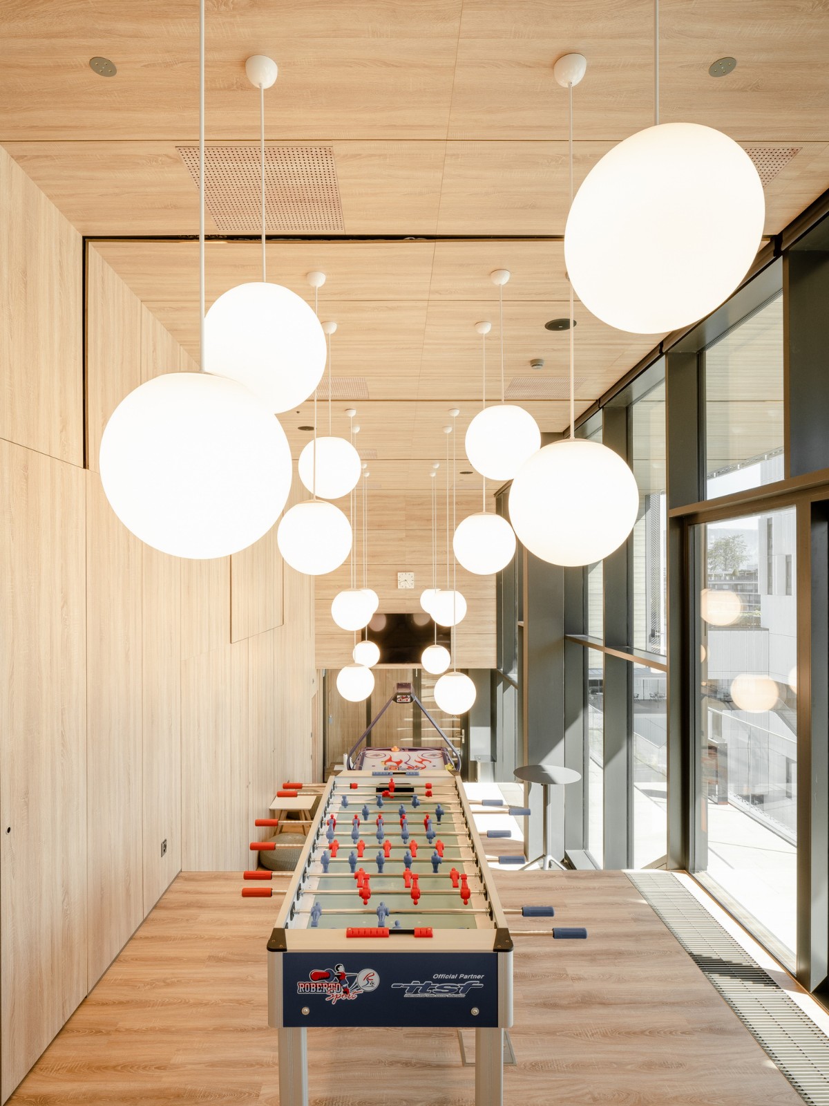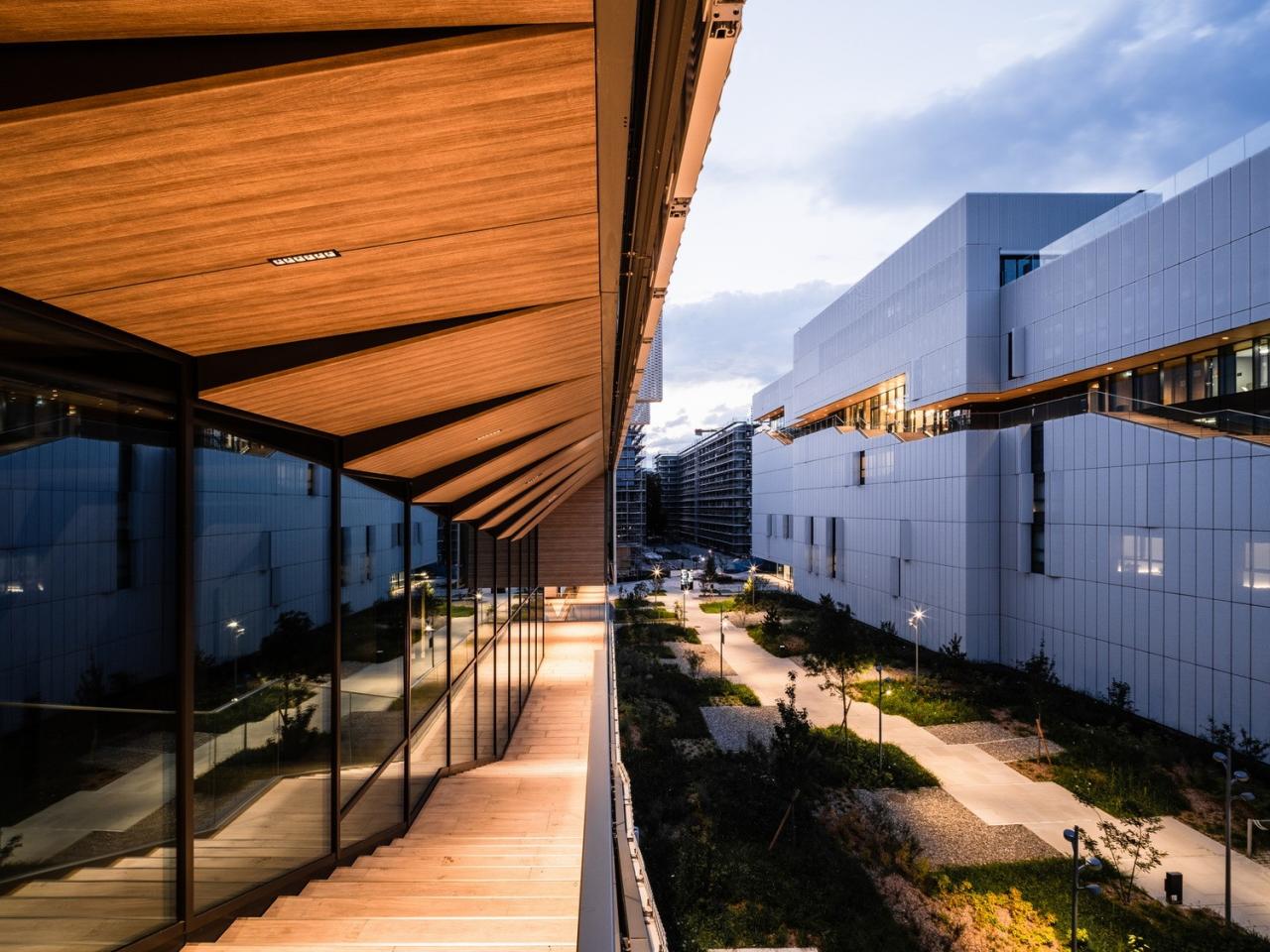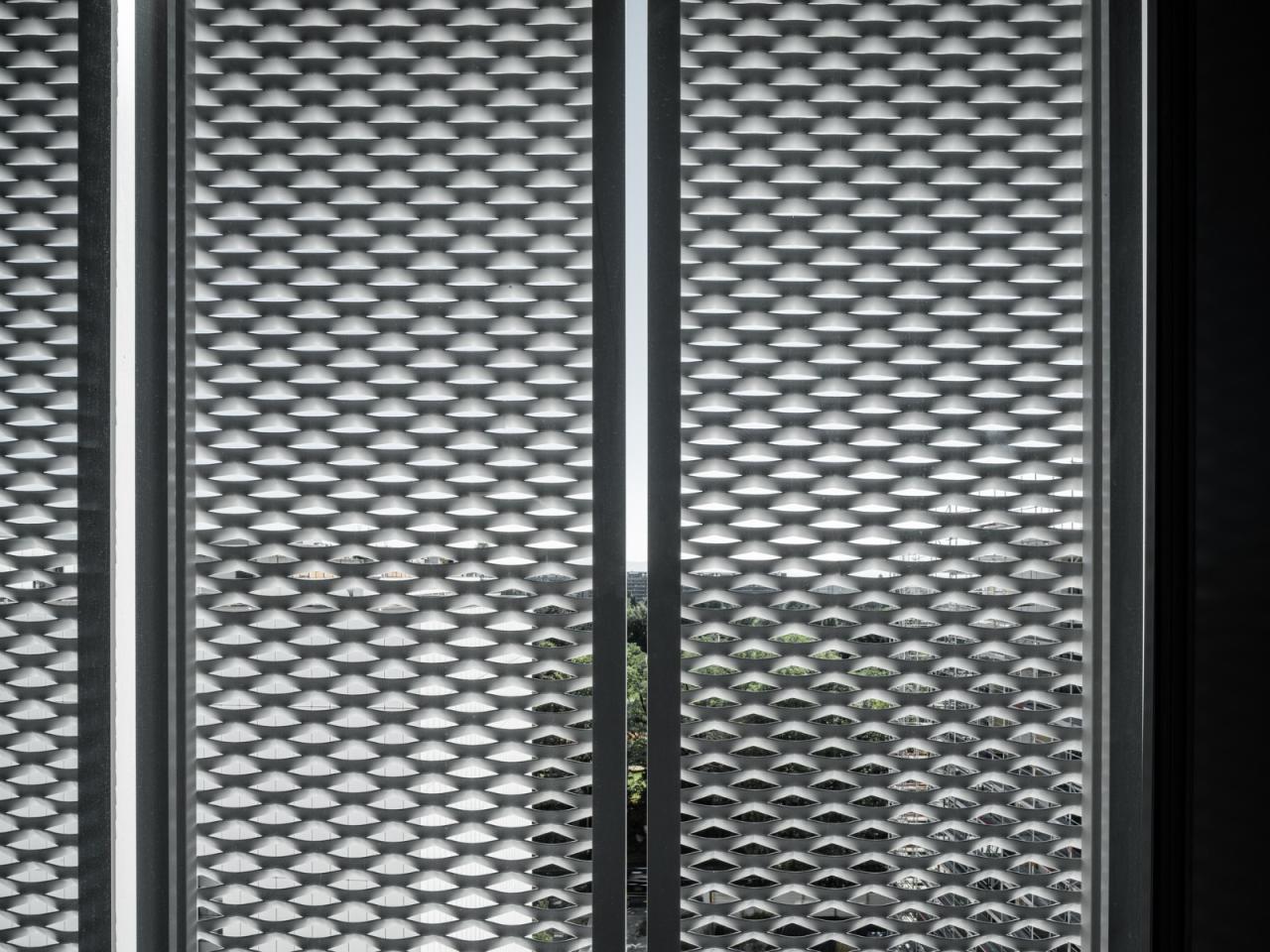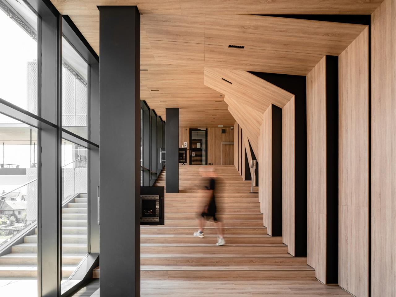 3.6米宽的滑动百叶窗与建筑群的金属立面融合,并让内部空间可以自由调节亮度和生活空间的隐私度。随着一天中时间的变化和学生活动的进行,立面上百叶窗的开或合让建筑群产生了视觉上的不断变化。同时,室内空间被赋予了木材的温暖,并与外部空间的灰与白形成了对比。630间学生宿舍就此与公共区域完美过渡,实现了建筑概念的美好愿景。