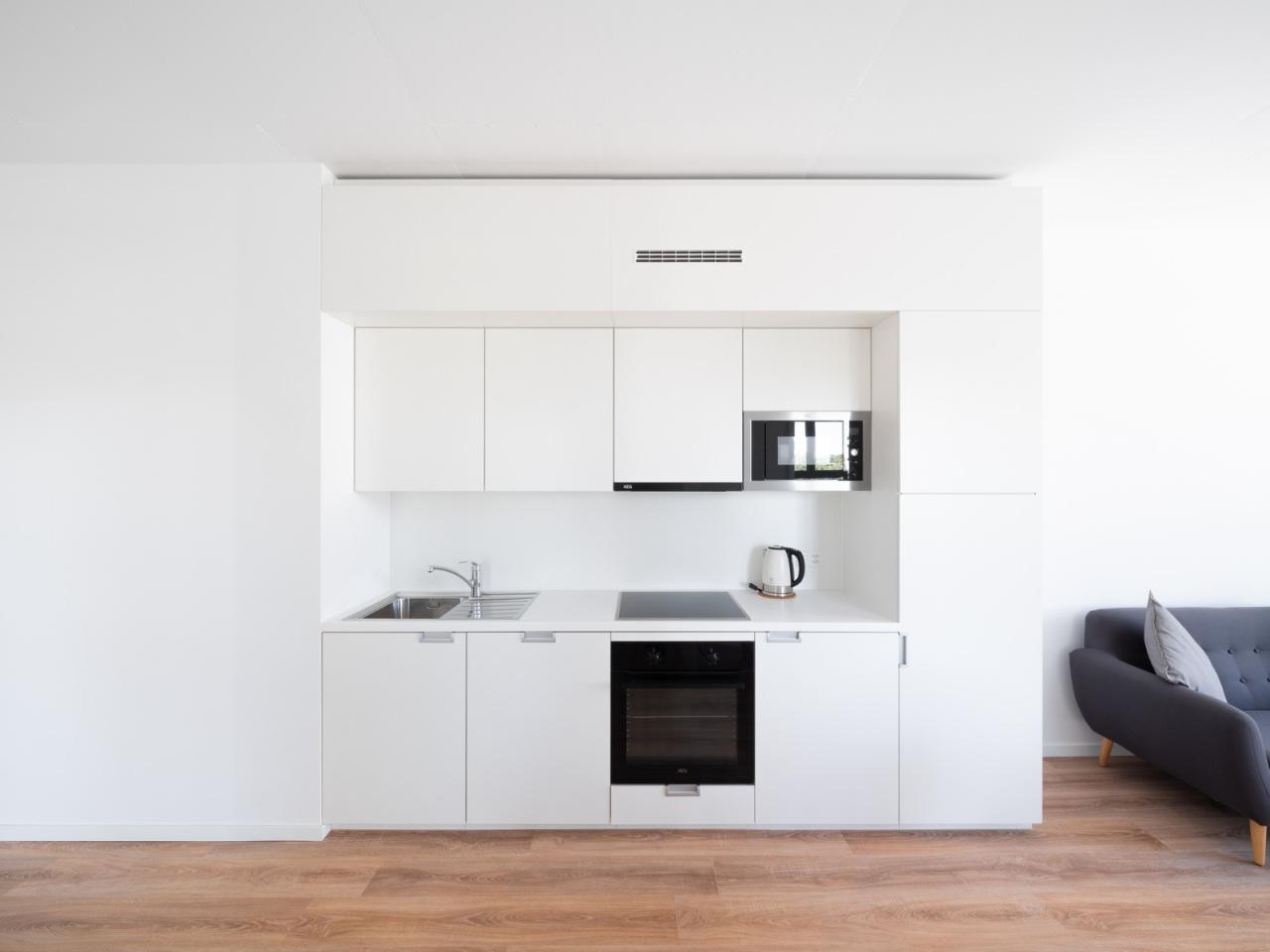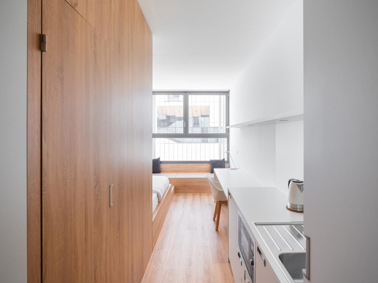 房间项目中不同类型的宿舍旨在根据学院本身的需求进行设计。基础单元为“单开间”,这是一个为了让学生们适应、欣赏社群生活所设计的空间,因此,单开间单元的空间也与共享厨房直接相连,而厨房空间本身也是十五或二十个单开间单元组团的中心。另一类型“高级单开间”则在房间内配备了私人小厨房,从而为寻求更多自主权的学生提供了选择。“配对公寓”则结合了两个单元模块,并配有一个与睡眠区分开的生活空间,因此也更适合行动不便的学生居住。