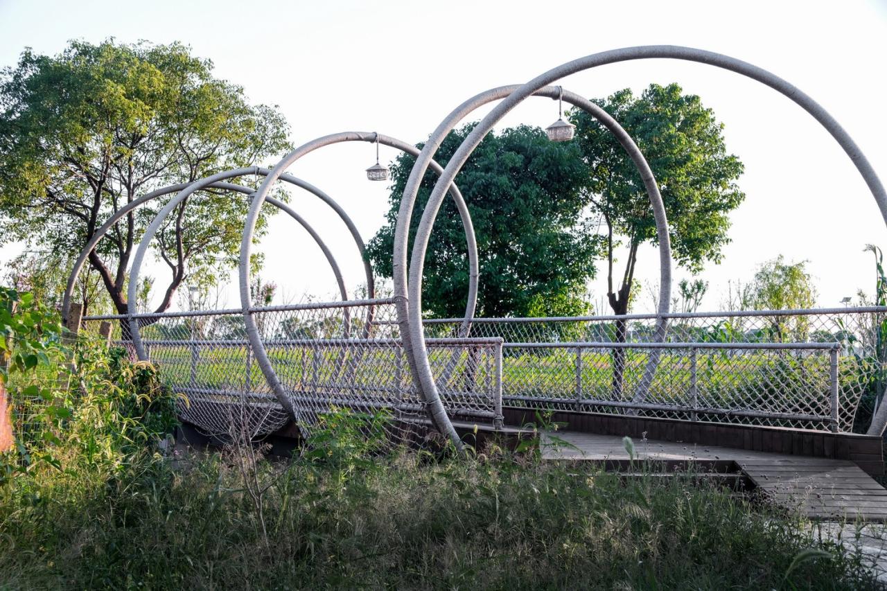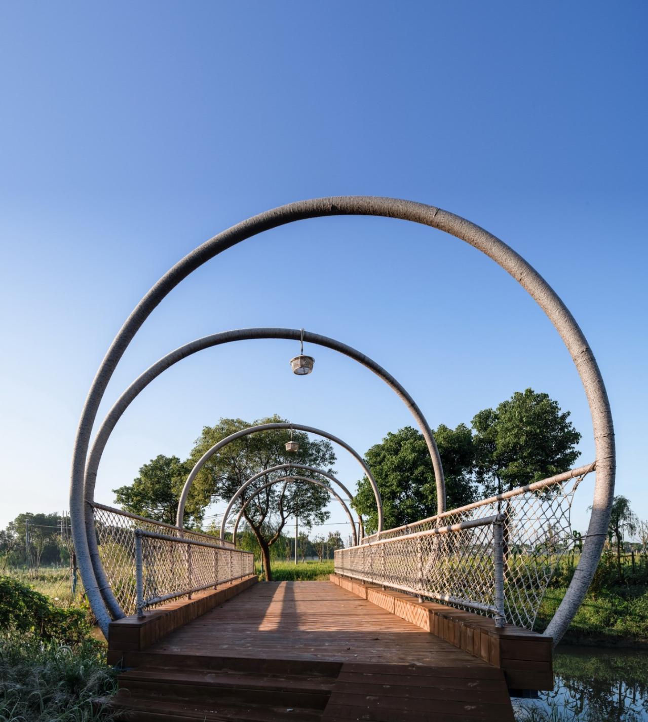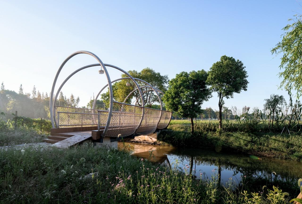 在整体的景观方案上,团队通过因地制宜的设计,回应自然而然的传统村落的肌理,通过对空间的重新梳理,对场景进行了场所植入、柔化与过渡。在对现有的资源进行规划整合后,团队从河道、农田、建筑场地出发,重塑一个原生的、自然的“河+田+民宿”的乡村景观格局,将失去活力的空间通过“桥体”连接,同时依托产业类型而增加的配套服务点也为村民带来了参与建设与运营的机会。