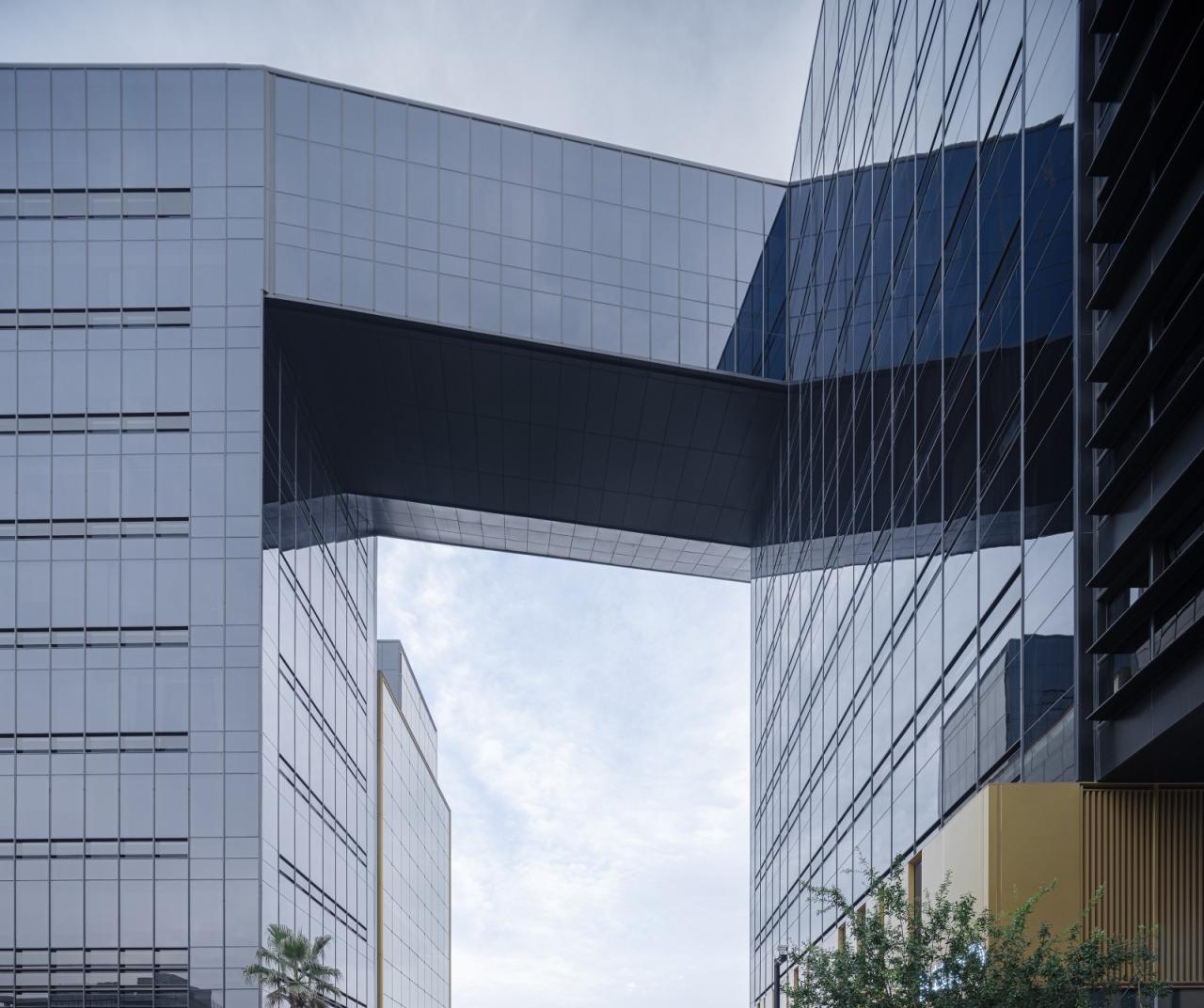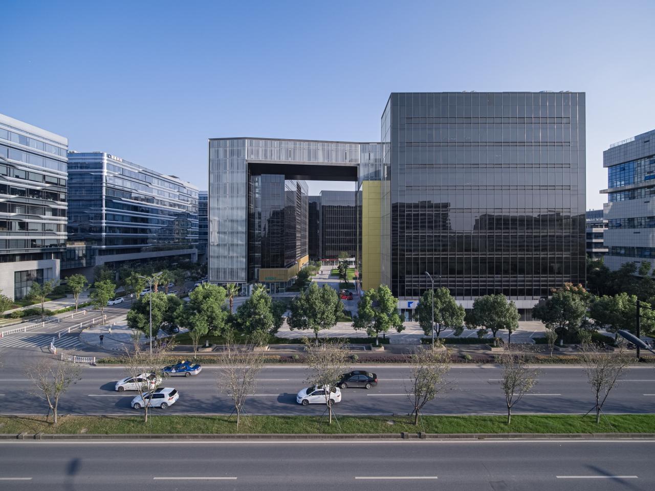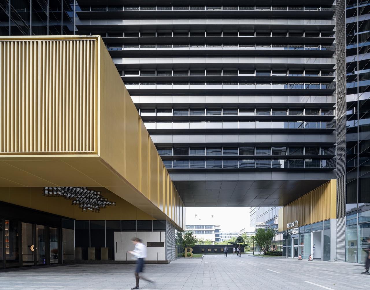 建筑体量沿街布置,体块在南北两侧分别退让城市,形成两处微型街角广场。链接1、2号楼的连桥与1号楼的金色外边框大厅,象征企业对外展示的“门窗”,暗示园区主入口的位置。“手指”般握住两栋建筑的连桥具有微弱收窄、错动的状态,结构上采用弱连接的方式,以确保两栋形态不规则的大楼连接后更具结构稳定性。建筑因超尺度“门窗”的强烈形式成为余杭塘路上的立体符号。