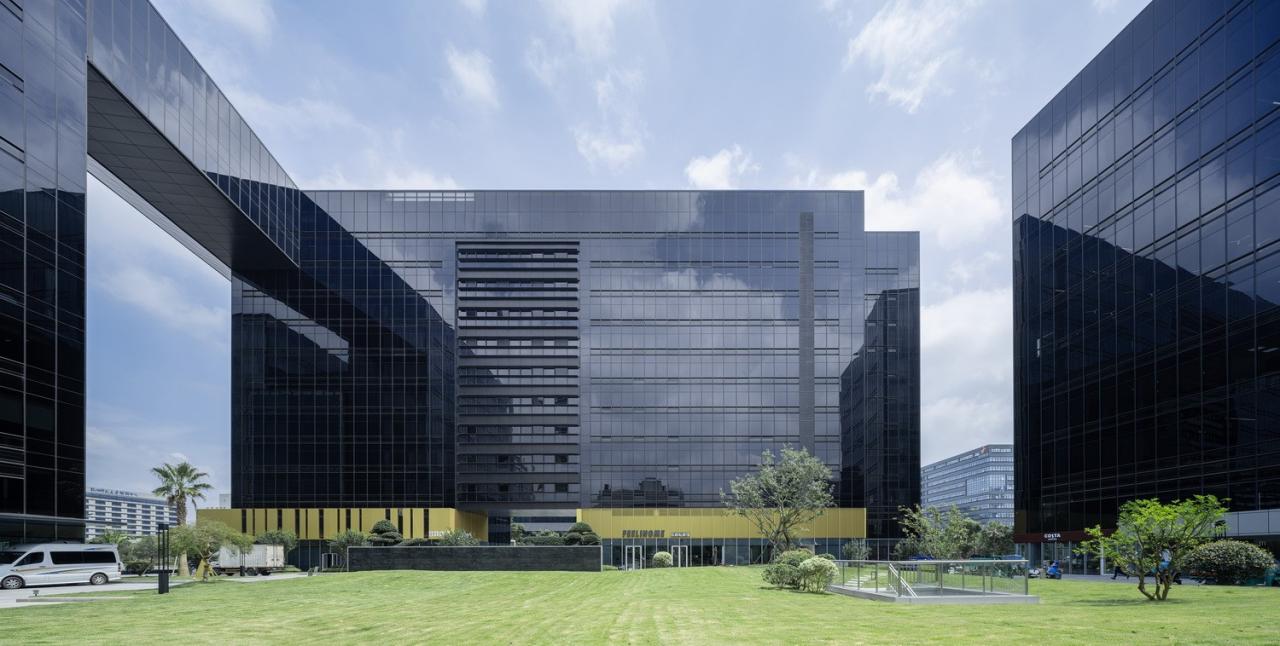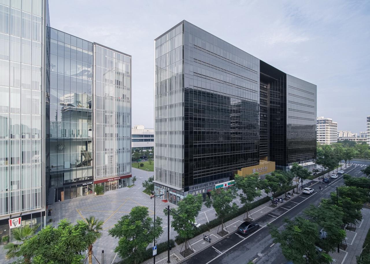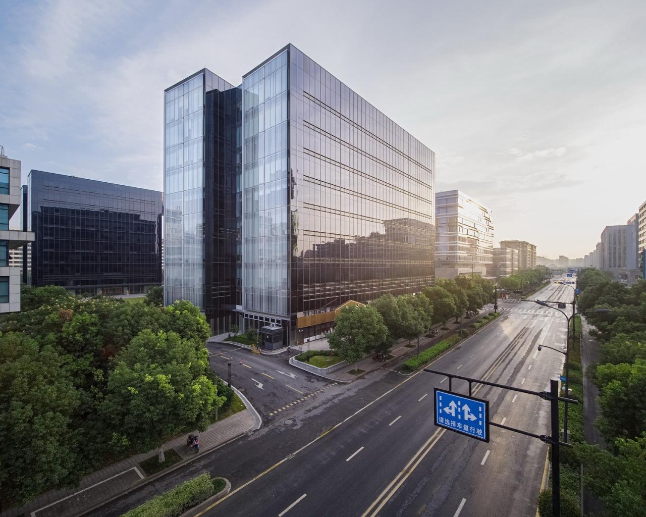 关瑞大厦坐落于杭州未来科技城(海创园),以阿里为代表的高新科创产业办公聚集于此,地块位于余杭塘路与海园路交叉口,东西两侧紧邻办公园区,北侧与杭州师范大学相隔一条主干道,周边商业业态链接度低,缺乏可借鉴的景观资源。在此介于成熟和空白之间的城市地段,关瑞大厦的进驻定位,并非全然聚焦企业办公的内在功能,润色并填补城市拼图也是设计中非常迫切的一环考量。