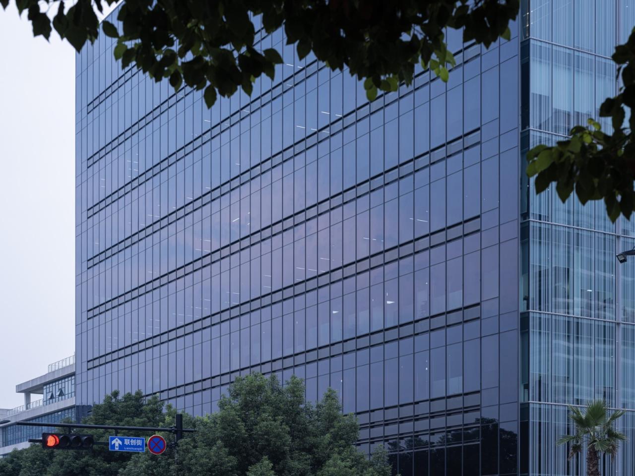 幕墙作为能否体现建筑整体性语言的关键要素之一,混杂的手法并不能带来观感的整洁性。为区别于周边相近的建筑面目,设计以尽量少的元素体现立面的统一语言,仅选择三种玻璃材质:深色玻璃、焗油玻璃和超白玻璃运用于幕墙表皮。