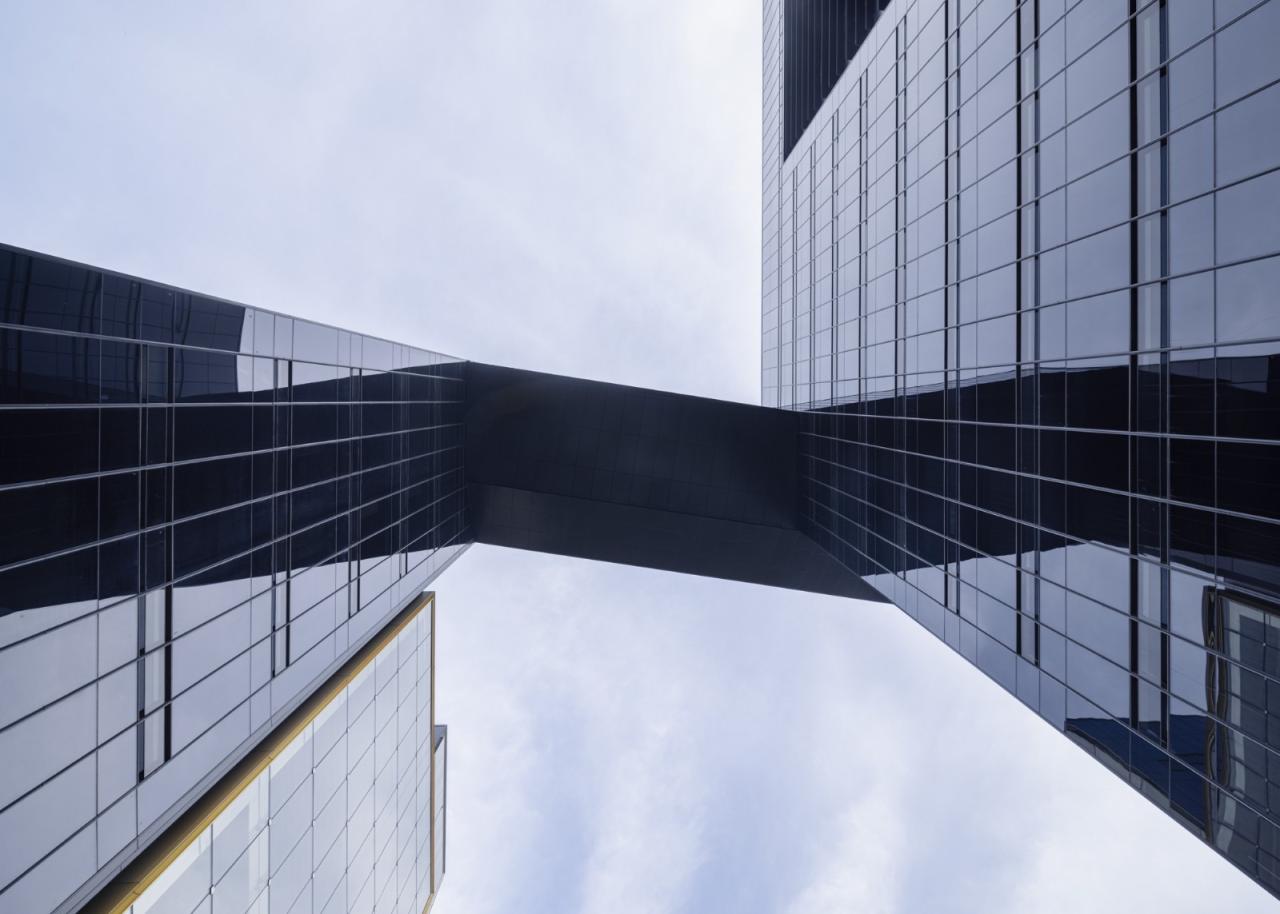 关瑞大厦的结构技术的特点主要集中体现在连桥和单索幕墙。不同的建筑连桥有强、弱连接的方式,此处采用弱连接,在连接结构端部设置滑动支座,可在震动等情况发生时起到给与弹性位移空间的作用,最终实现减震的目的。连桥连接的1号楼和2号楼的形态不统一,抗震性和震动位移不同,弱连接方式更加能够弱化两栋楼在震动上不同频率带来的震感。除了连接方式之外,连桥部分还充分考虑了竖向力、位移、弹塑性、行走舒适度(晃动感)等因素。