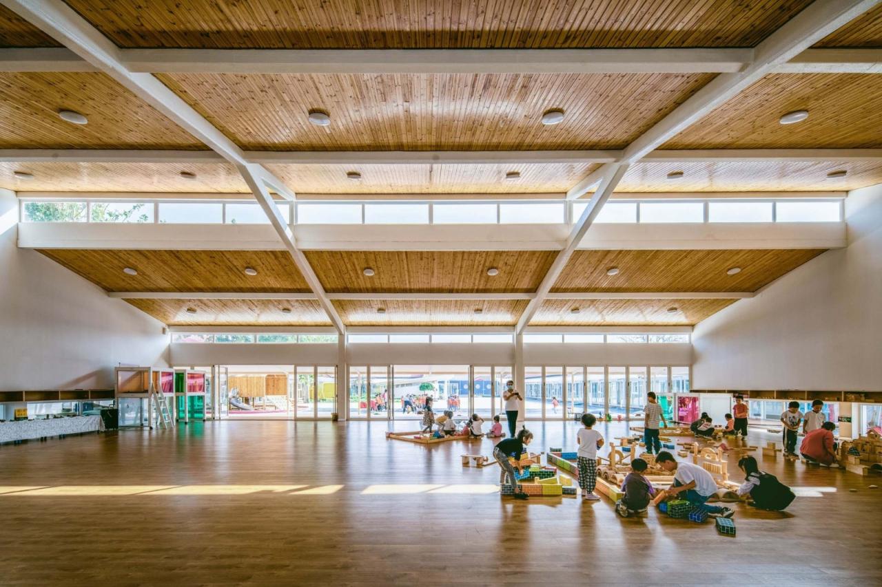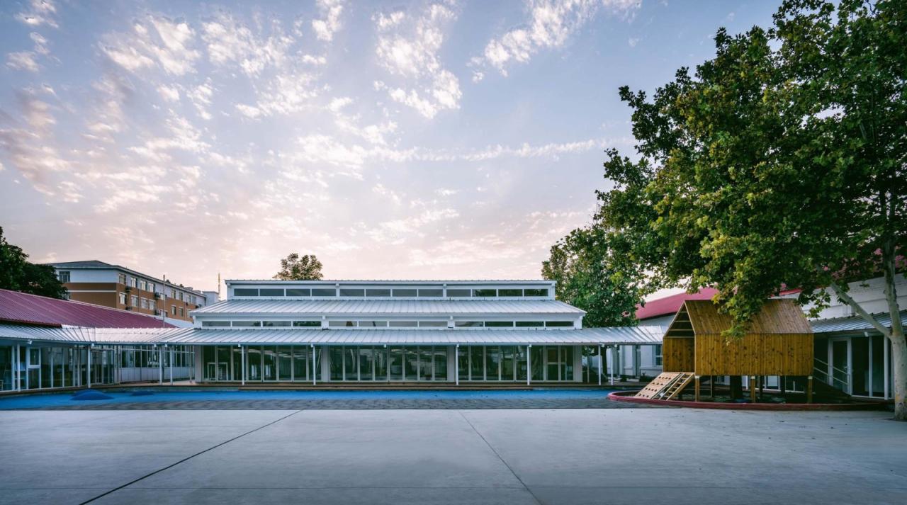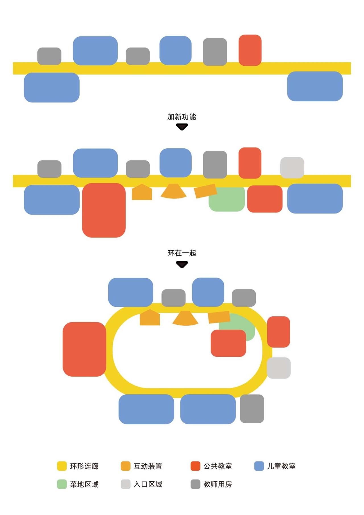 阳光幼儿园鼓励满足学龄前孩子的好奇心,让正在形成认知的他们多进行创造性的探索。因此设计引入一个有顶的环状走廊,将新旧不同的学习空间连接起来,让园内各种分散的空间元素编织为一体。环就像是个大的社会凝聚器,根据不同的课程与兴趣,不同年龄段的孩子在其中混合活动。在西侧,环与新建多功能厅连接,其内部无柱的宽敞空间可举办大型室内集体活动;而在东侧,环与大门厅相连,为家长等待空间。