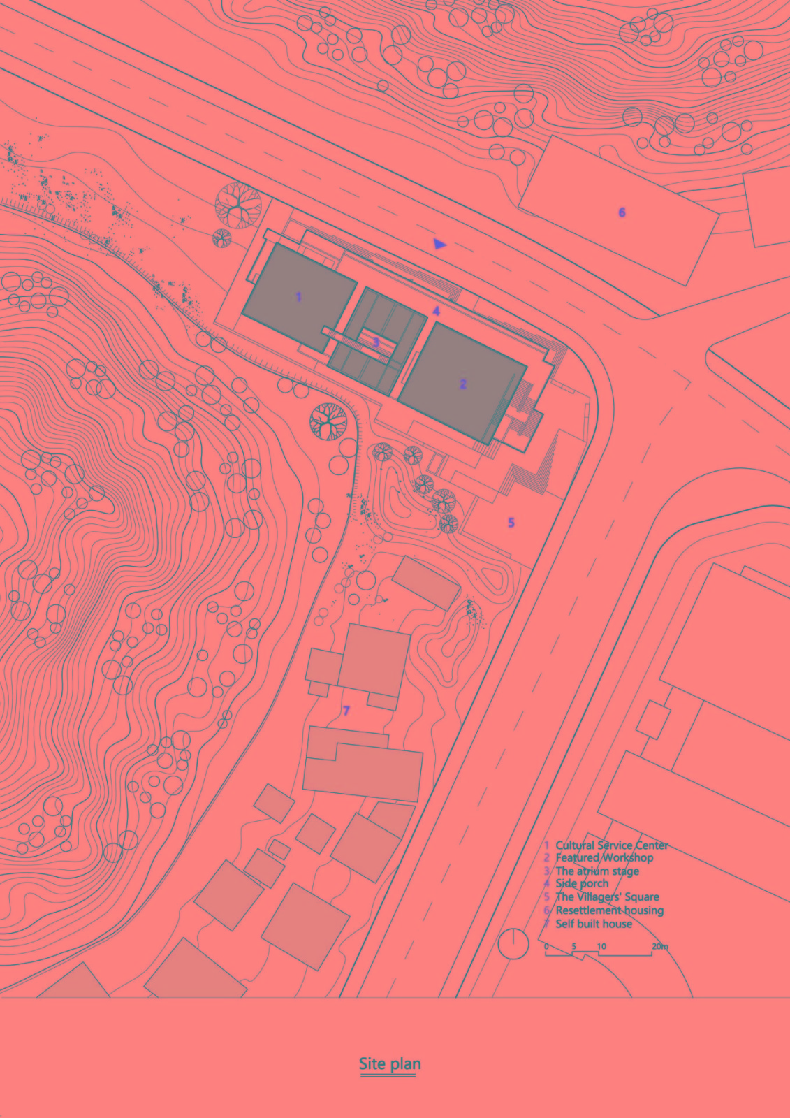 江华瑶族水口镇如意村文化服务中心及特色工坊占地面积约为1835㎡,建筑面积约为2093㎡,是一处集村务办公、村民活动、图书阅览、文艺观演、当地文旅宣传及特色产品展示销售等于一体的小型乡镇文化综合体,项目基地西高东低有约两米高差,顺着高差将场地划分为三个台地,自西向东依次为:文化服务中心、中庭戏台、特色工坊。