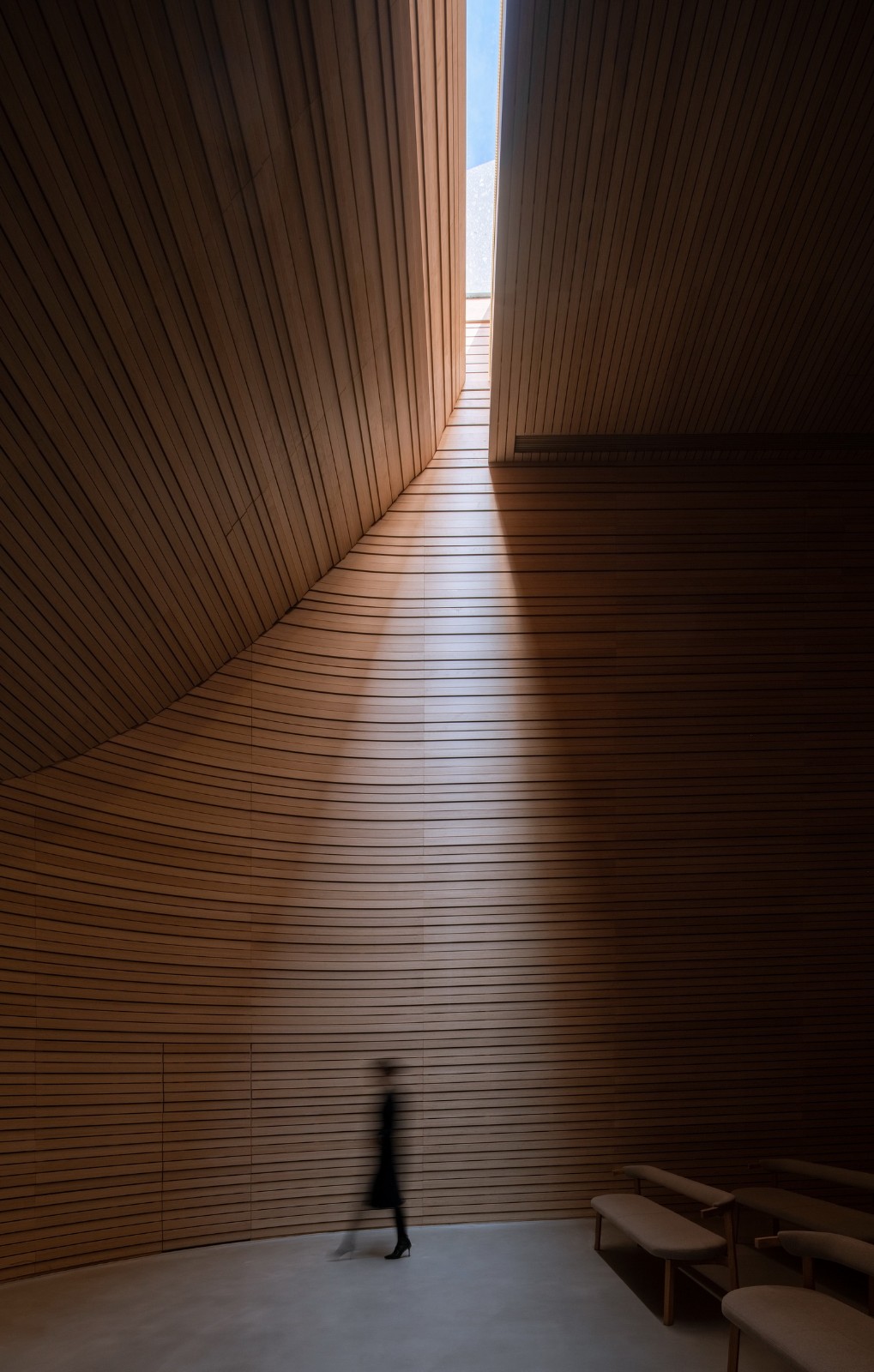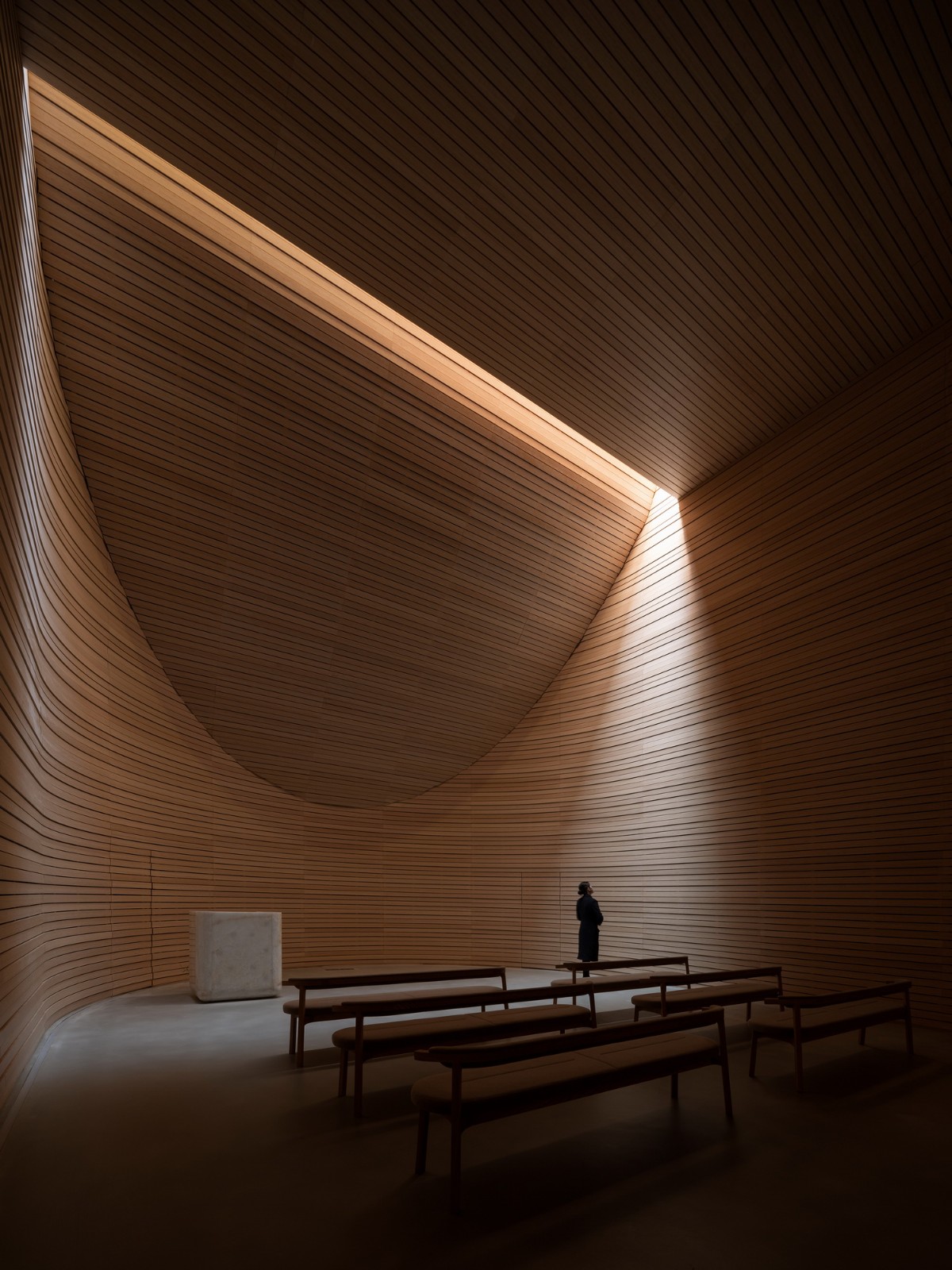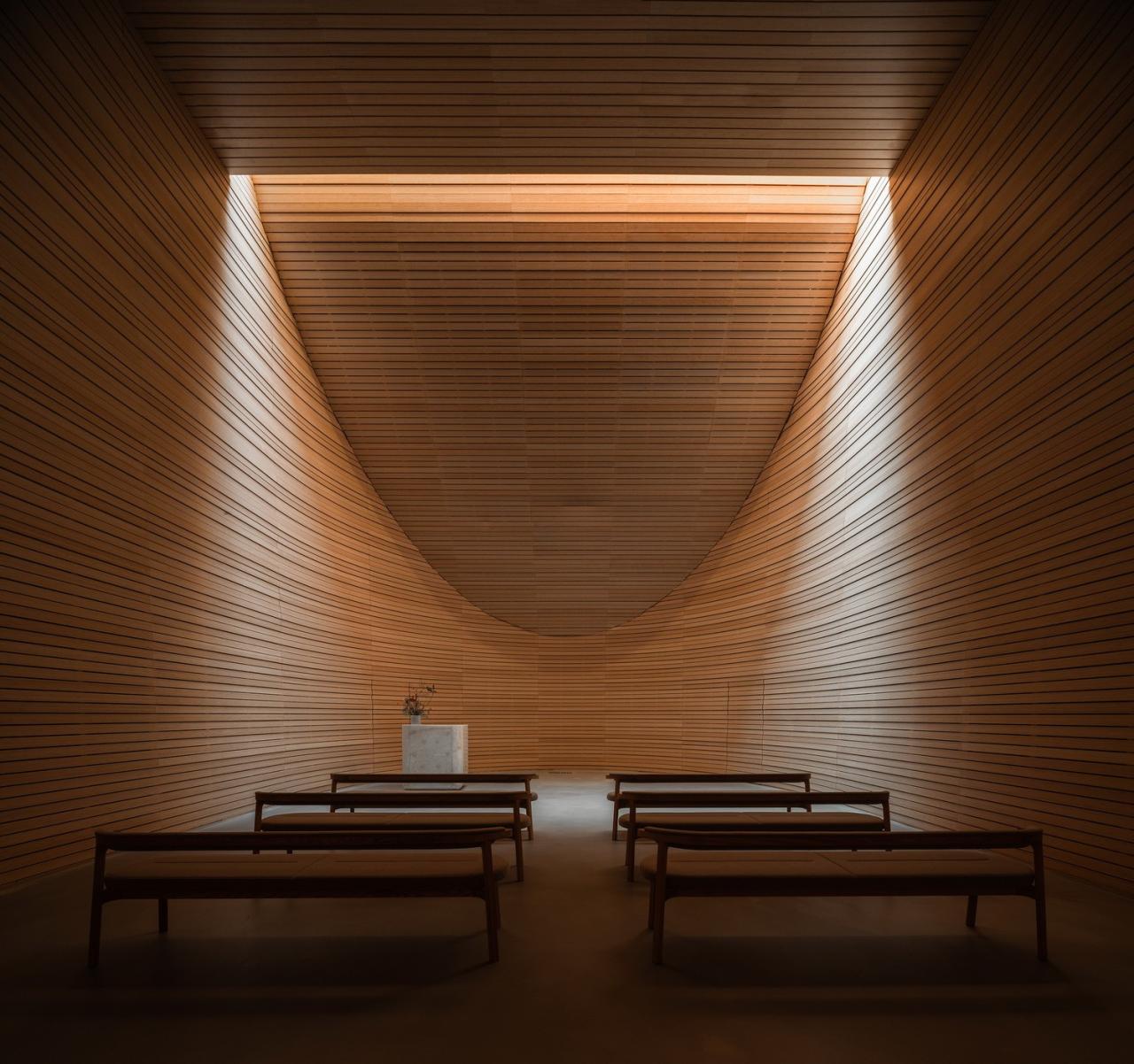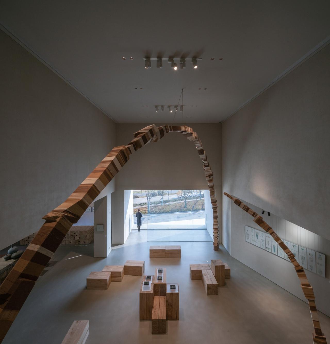 室内大量原木、棉麻、素混凝土材料的使用,与外界自然元素相容,营造自然温润、蕴育生机的空间氛围。通过洞口处理,巧妙的将光影、微风、绿意引入,模糊室内外的边界。在这座白石美术馆中收纳光,使建筑成为与人共情的场所。